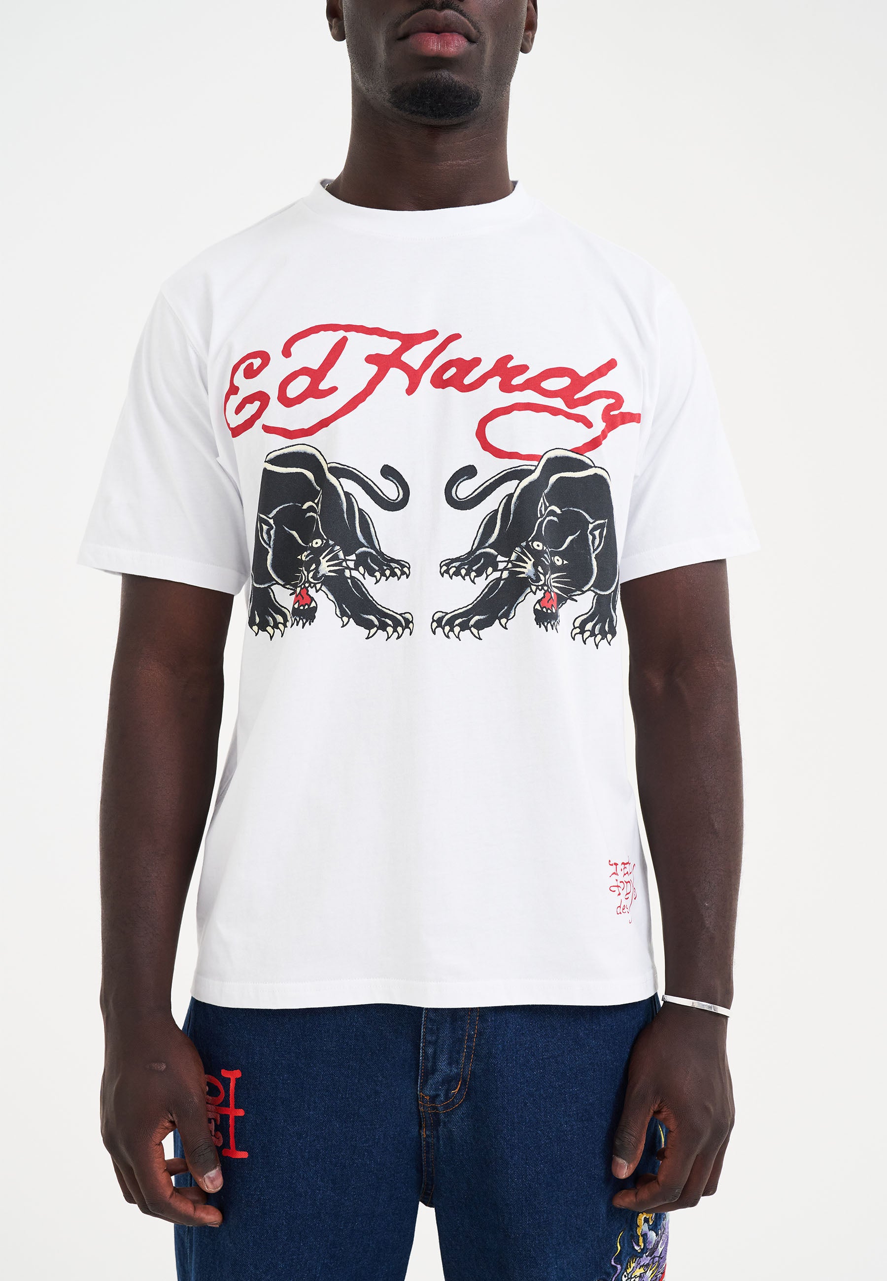 The fierce double black panther design vividly contrasts with the pure white colouration of this 100% cotton, regular-fit T-shirt.
