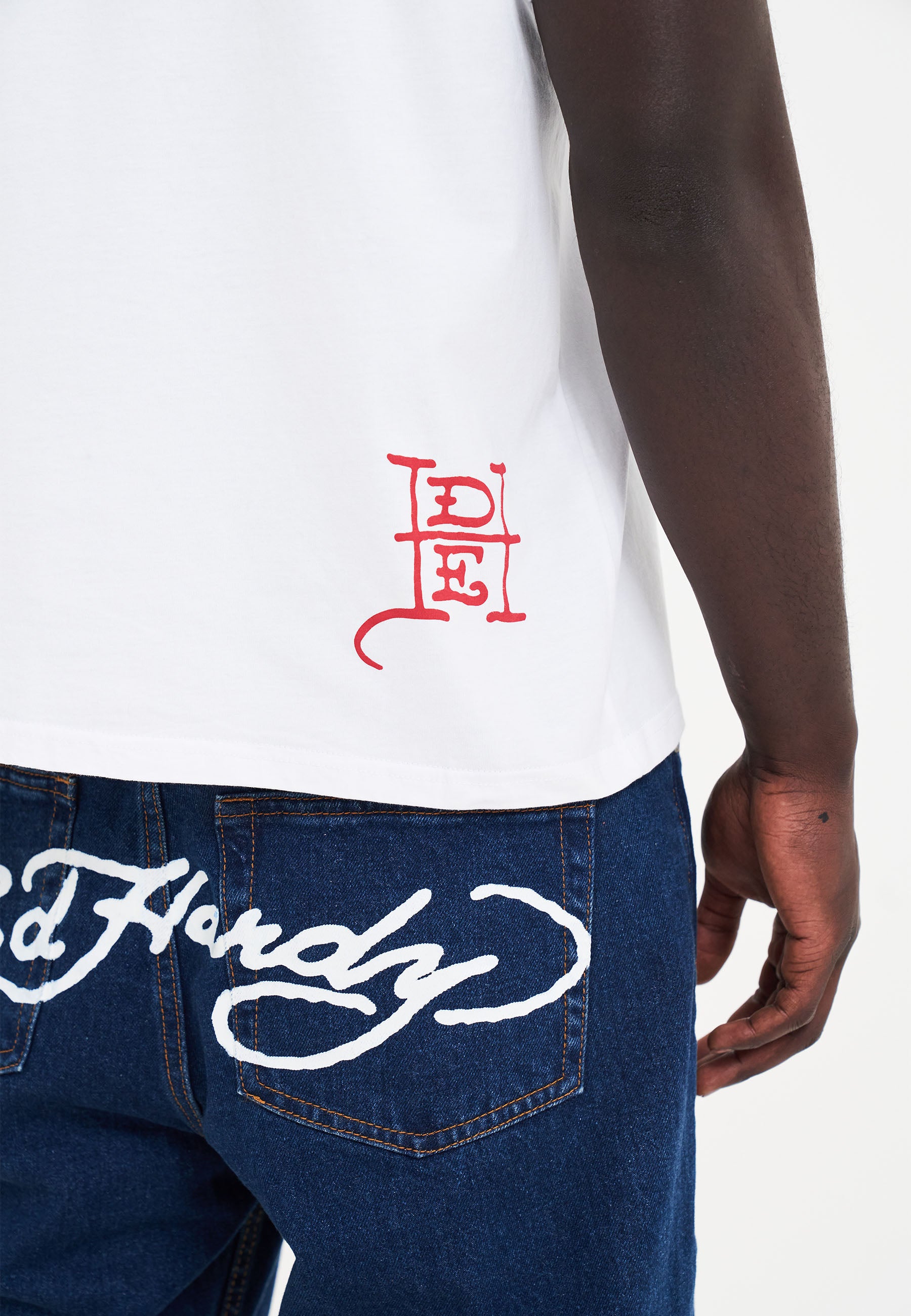 Ed Hardy’s distinctive logo is displayed across the chest in intense crimson, as well as DEH’s initials on the bottom-right back of this stylish Ed Hardy piece.