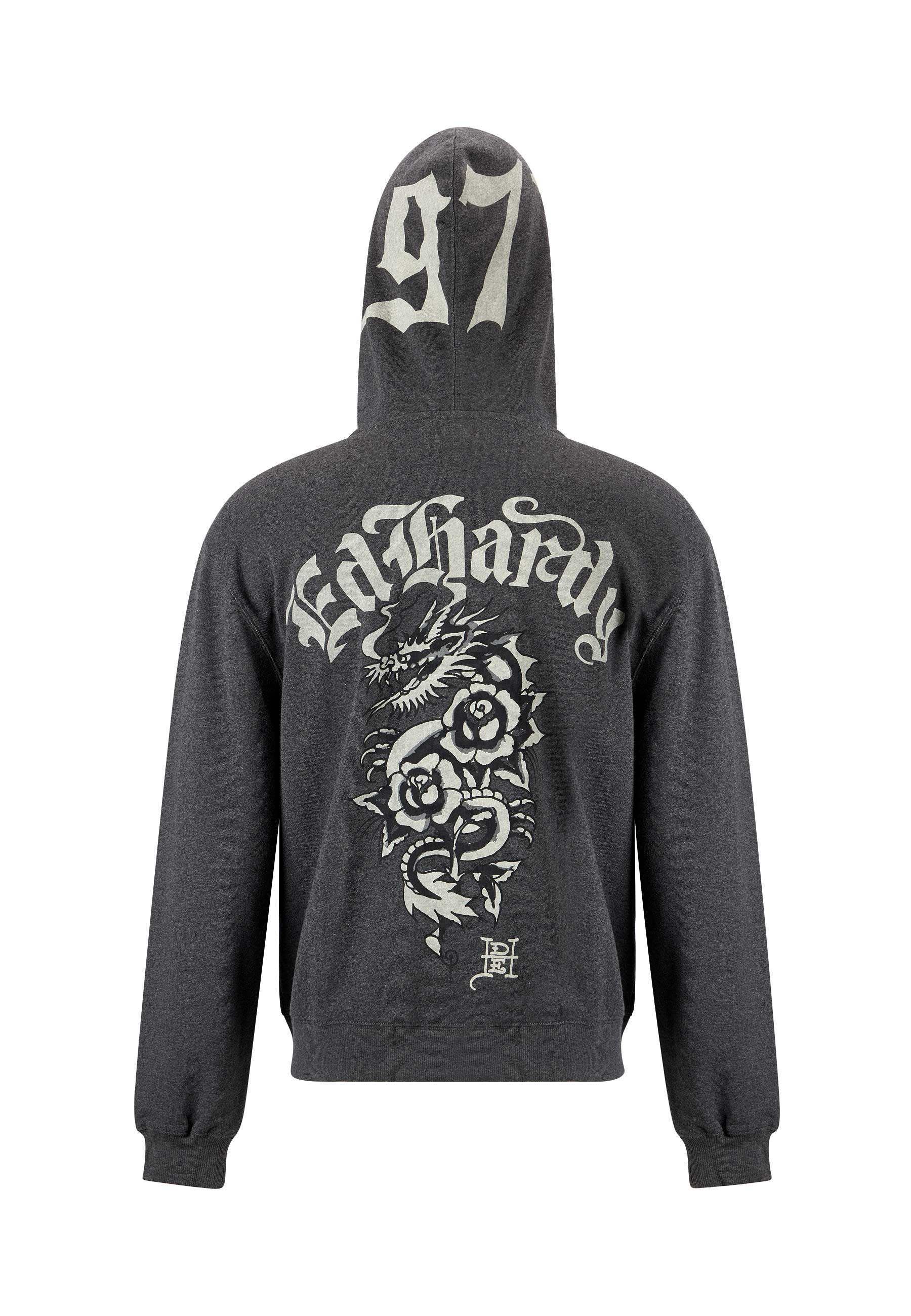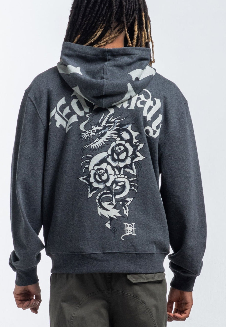 Mens Dragon Rose Zip Through Hoodie - Charcoal Marl