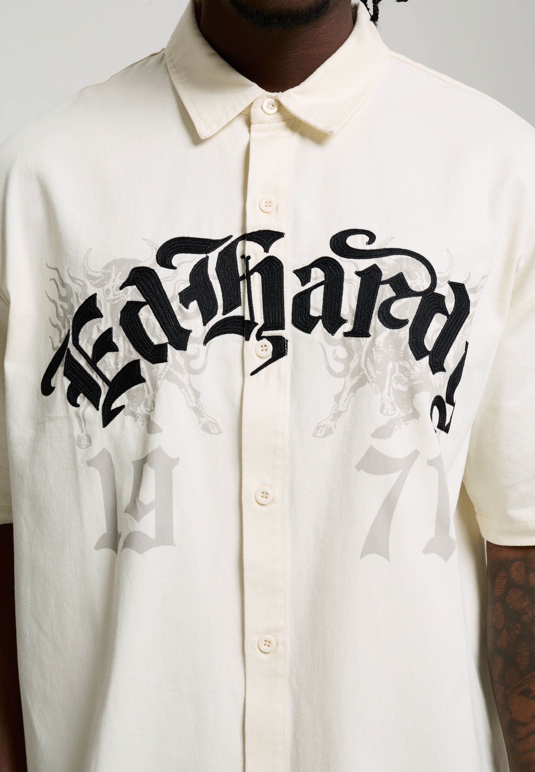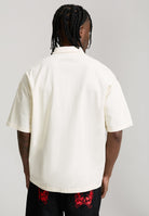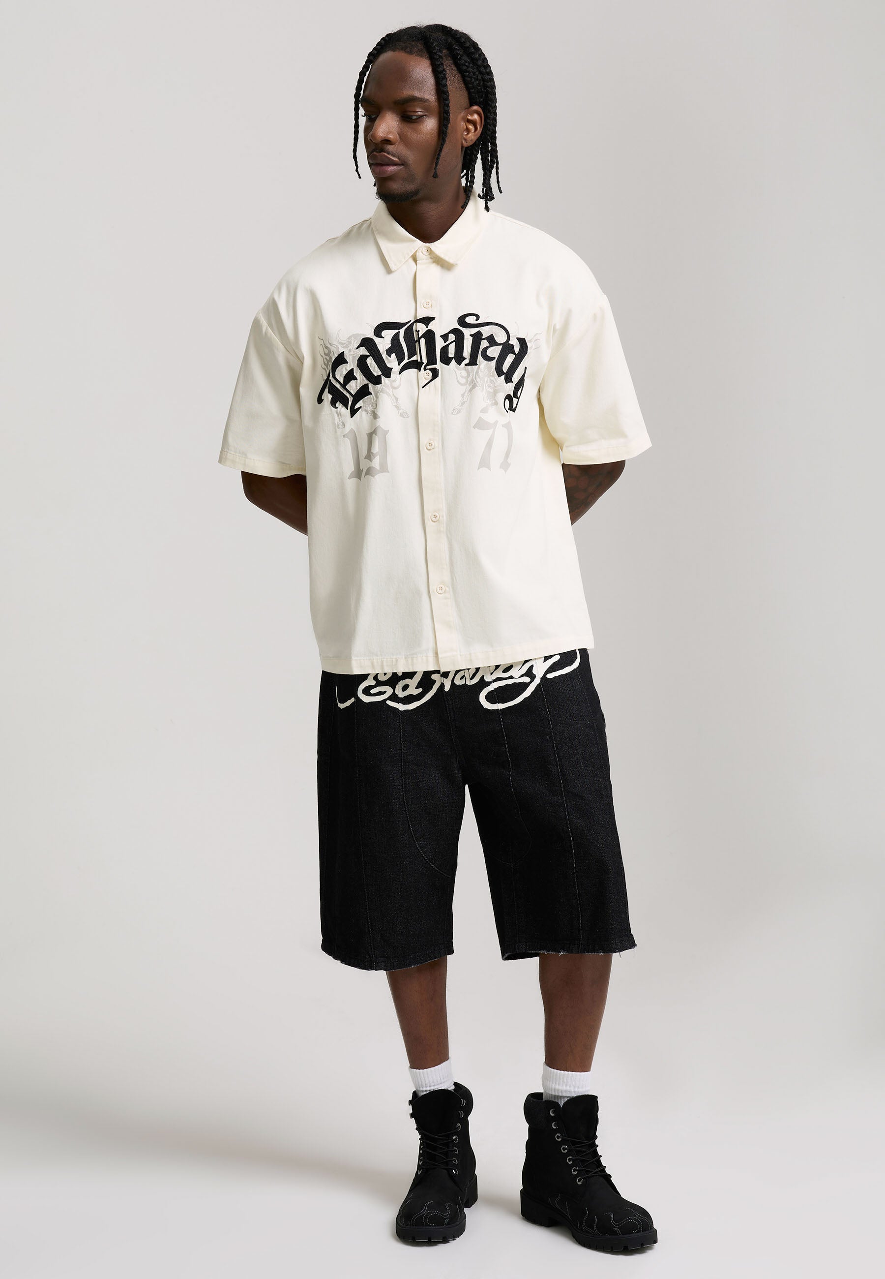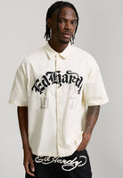 Mens Embroidered Gothic Ed Hardy Boxy Twill Shirt - Ecru