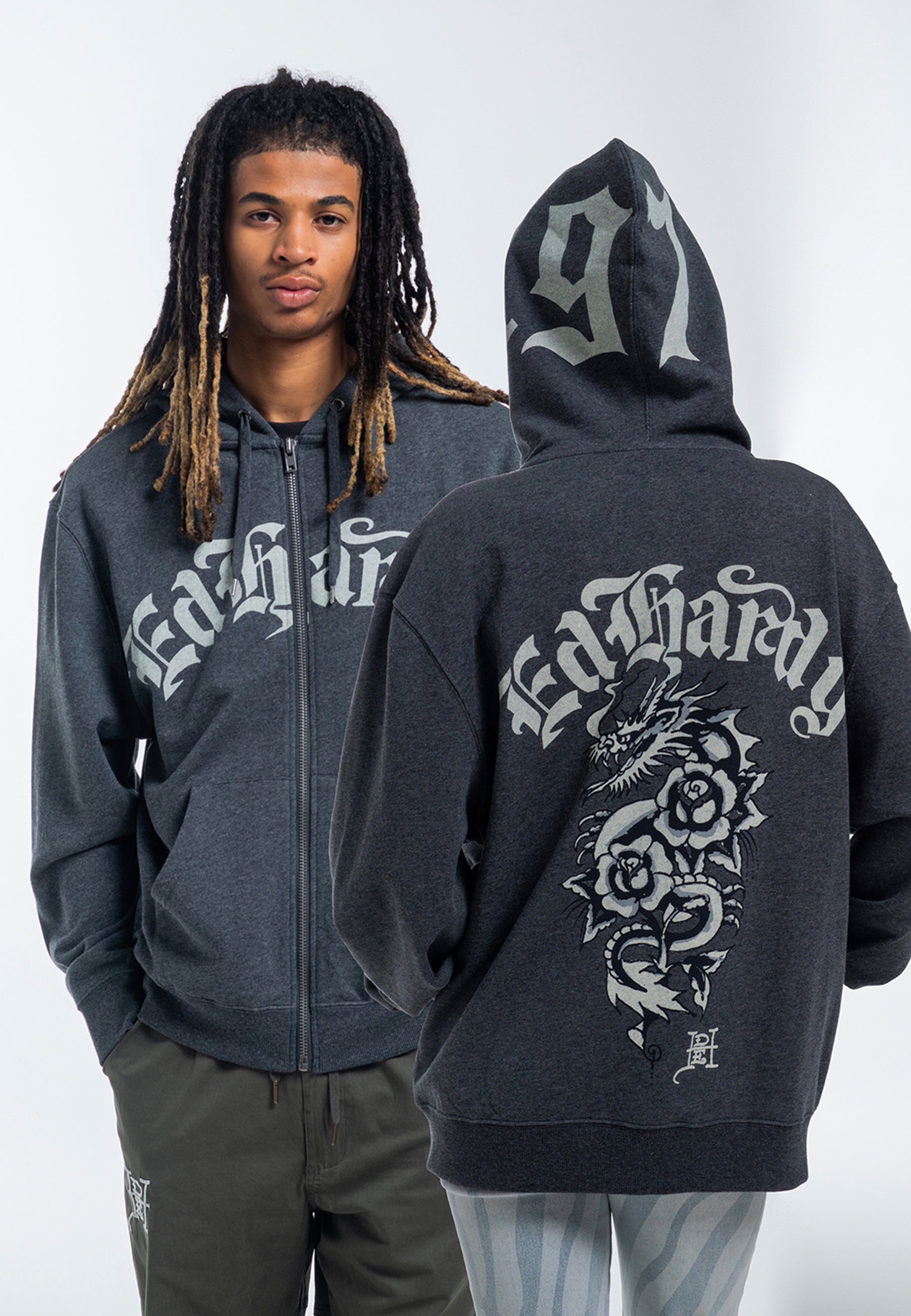 With a talent for weaving threads of inspiration from art, fashion, and music subcultures into his designs, the Dragon Rose Zip-Thru Hoodie exudes a Gothic essence that has always been a hallmark of Ed's archive.