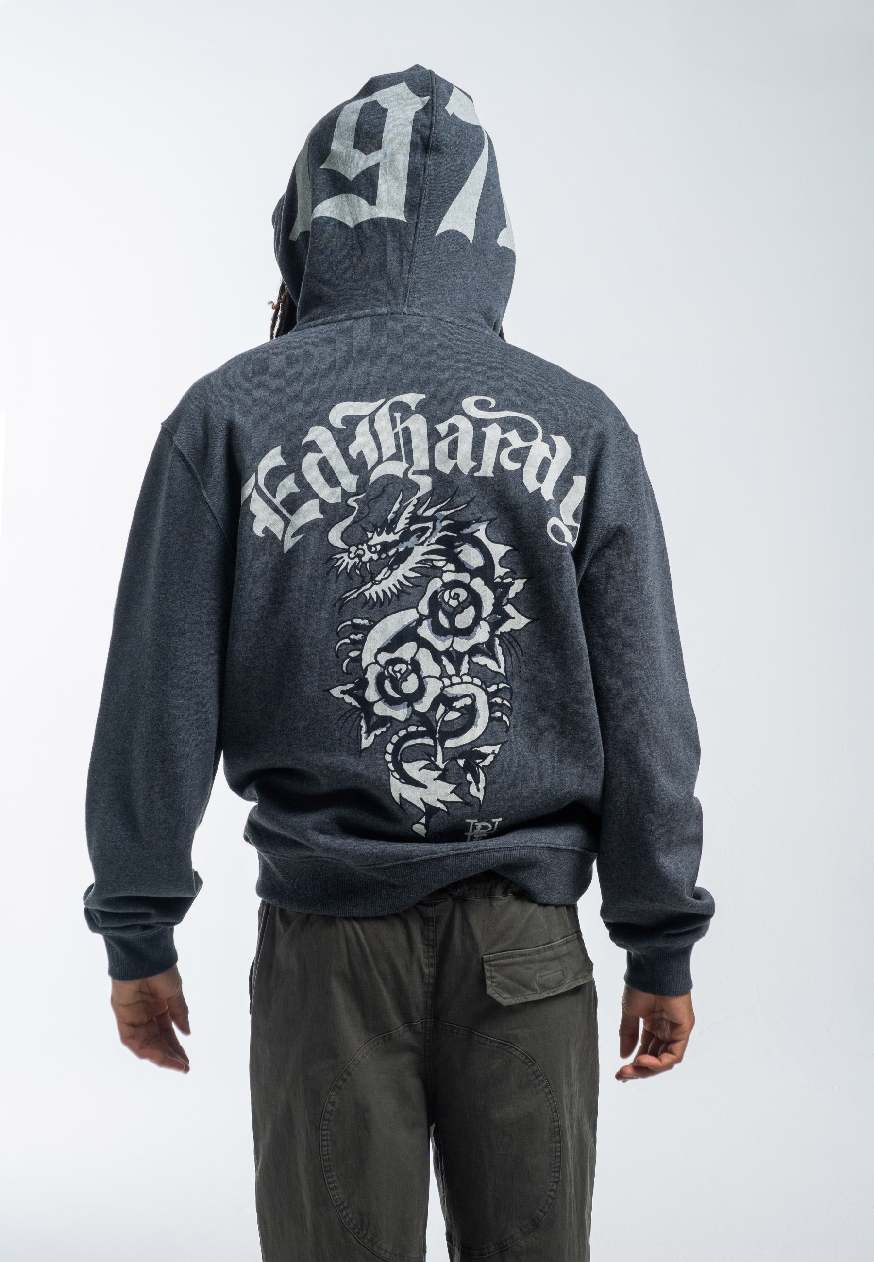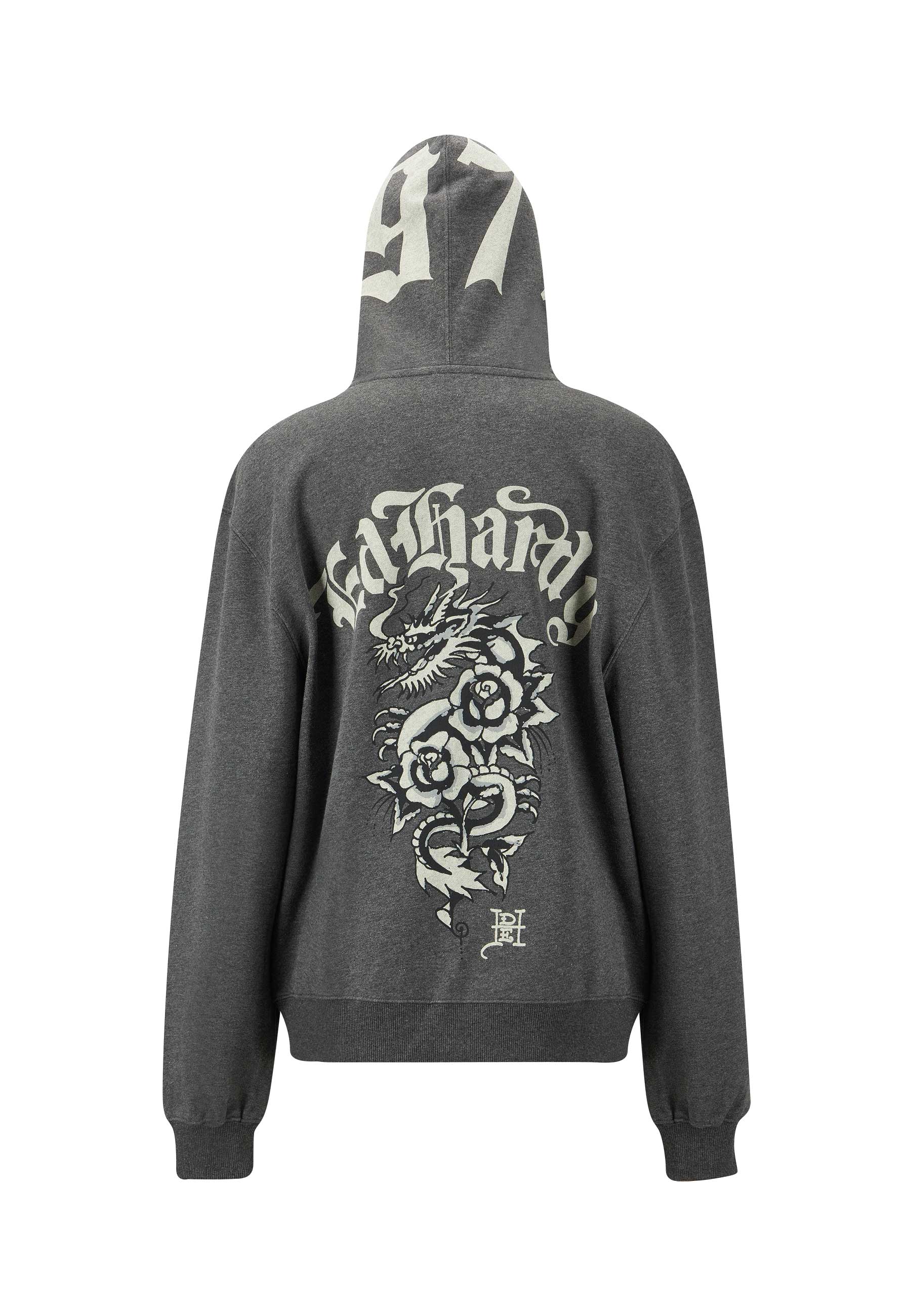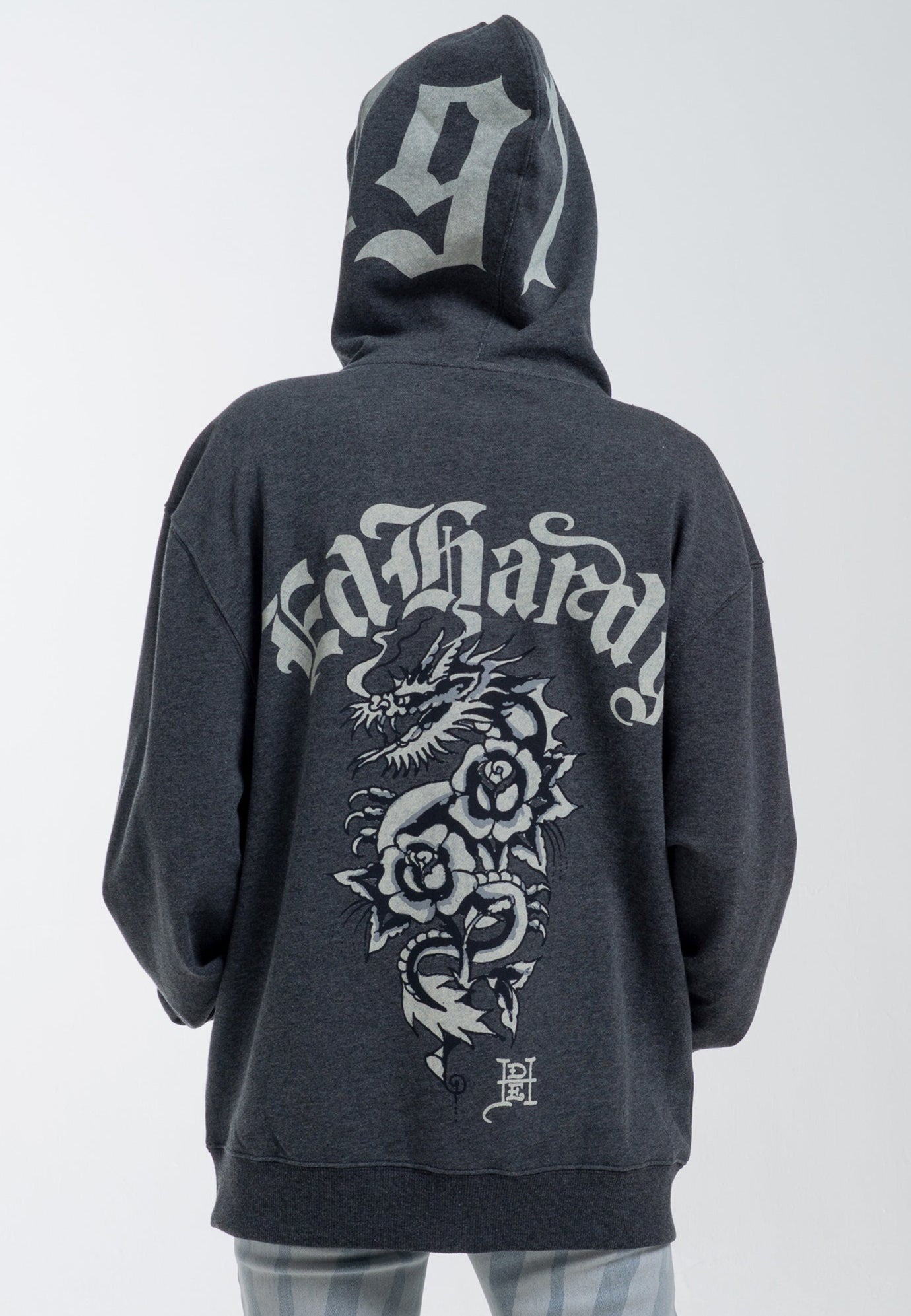 Womens Dragon Rose Zip Through Hoodie - Charcoal Marl