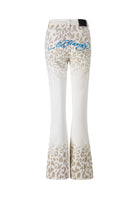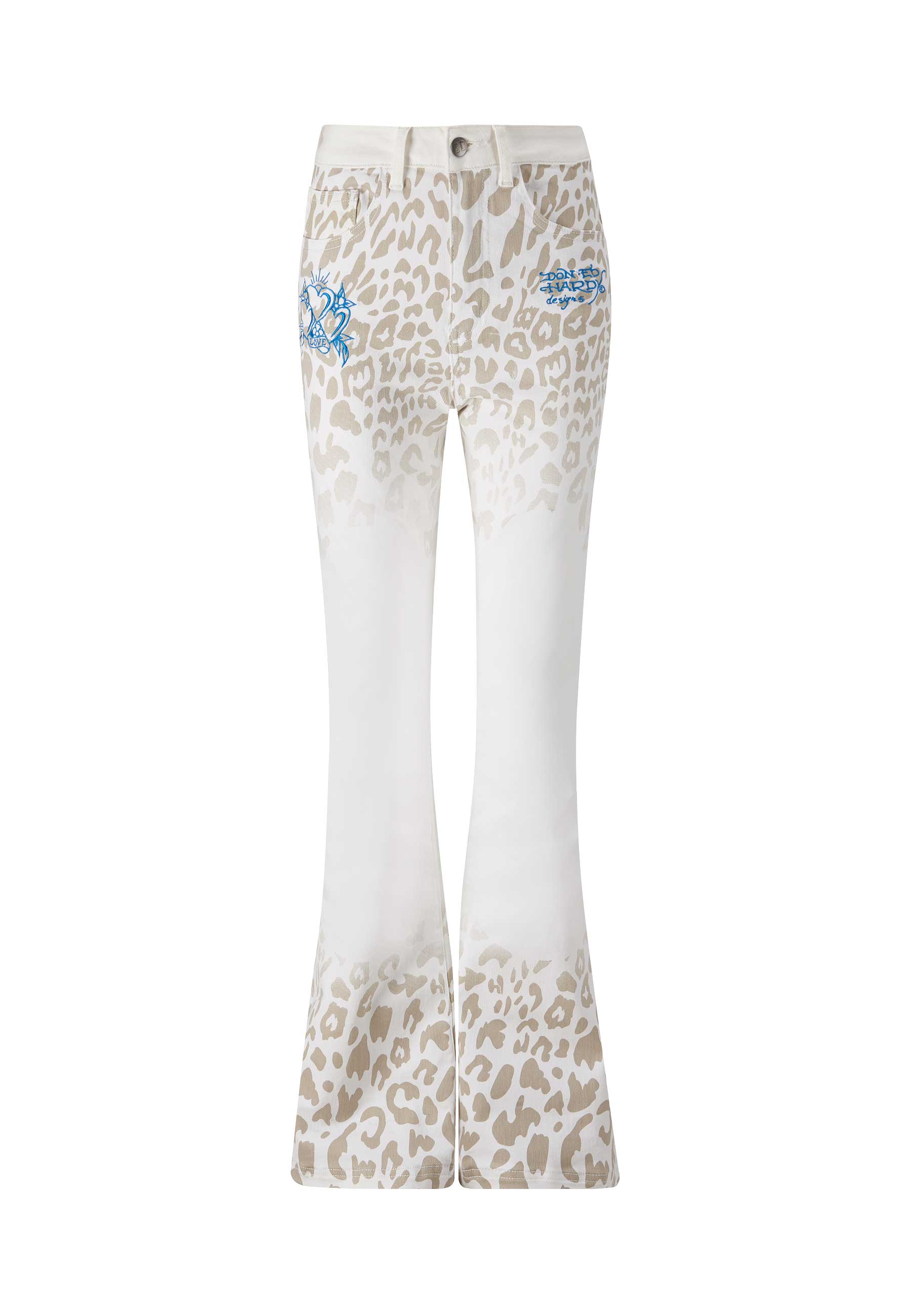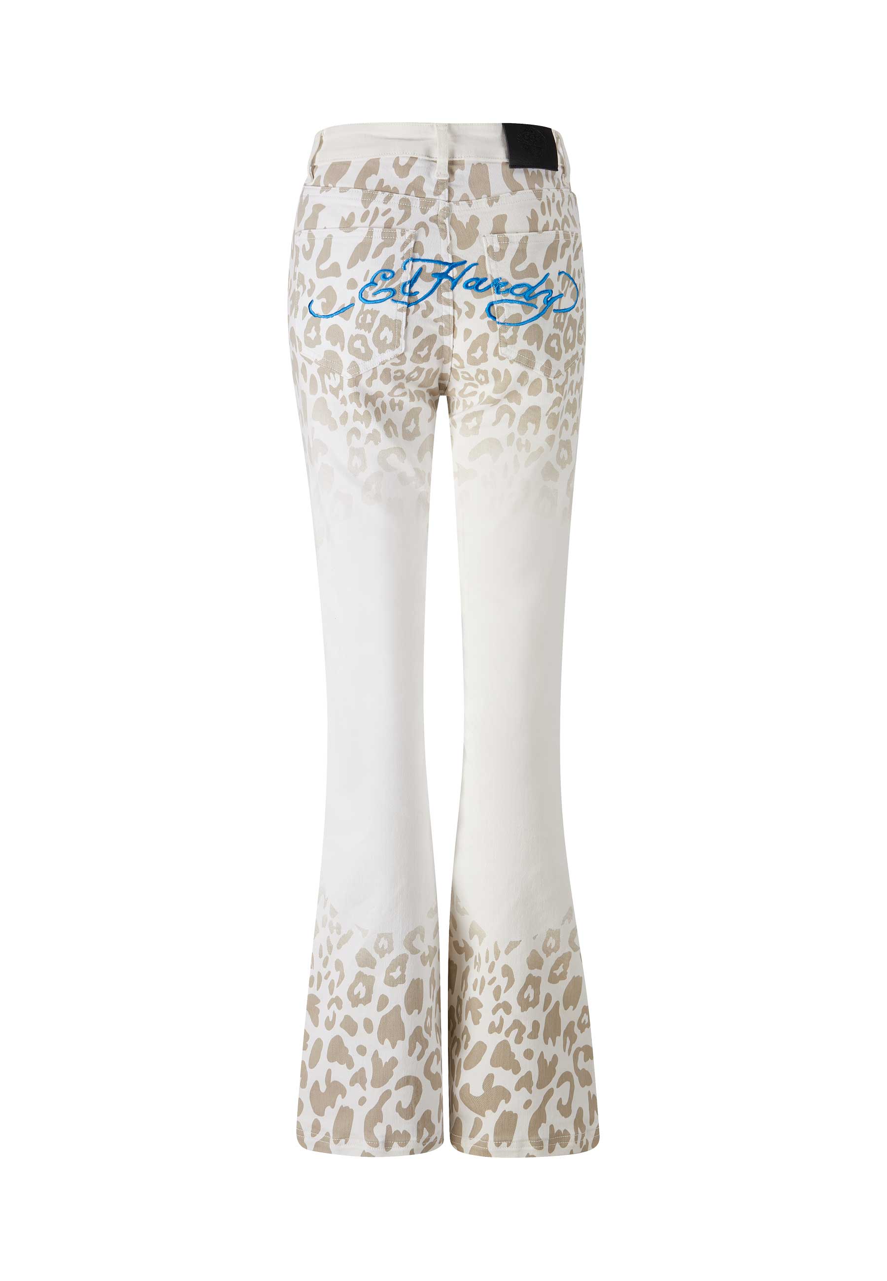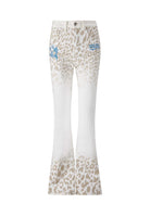 Womens Leopard Print Flared Denim Trousers Jeans - White/Beige