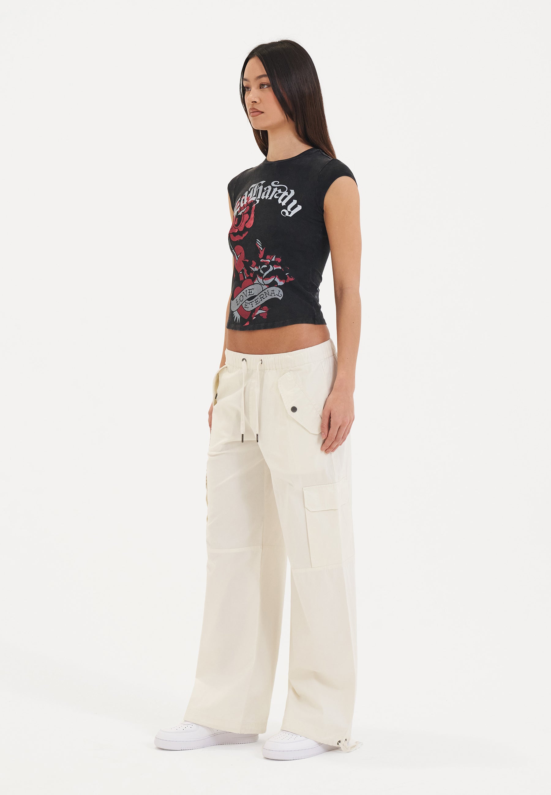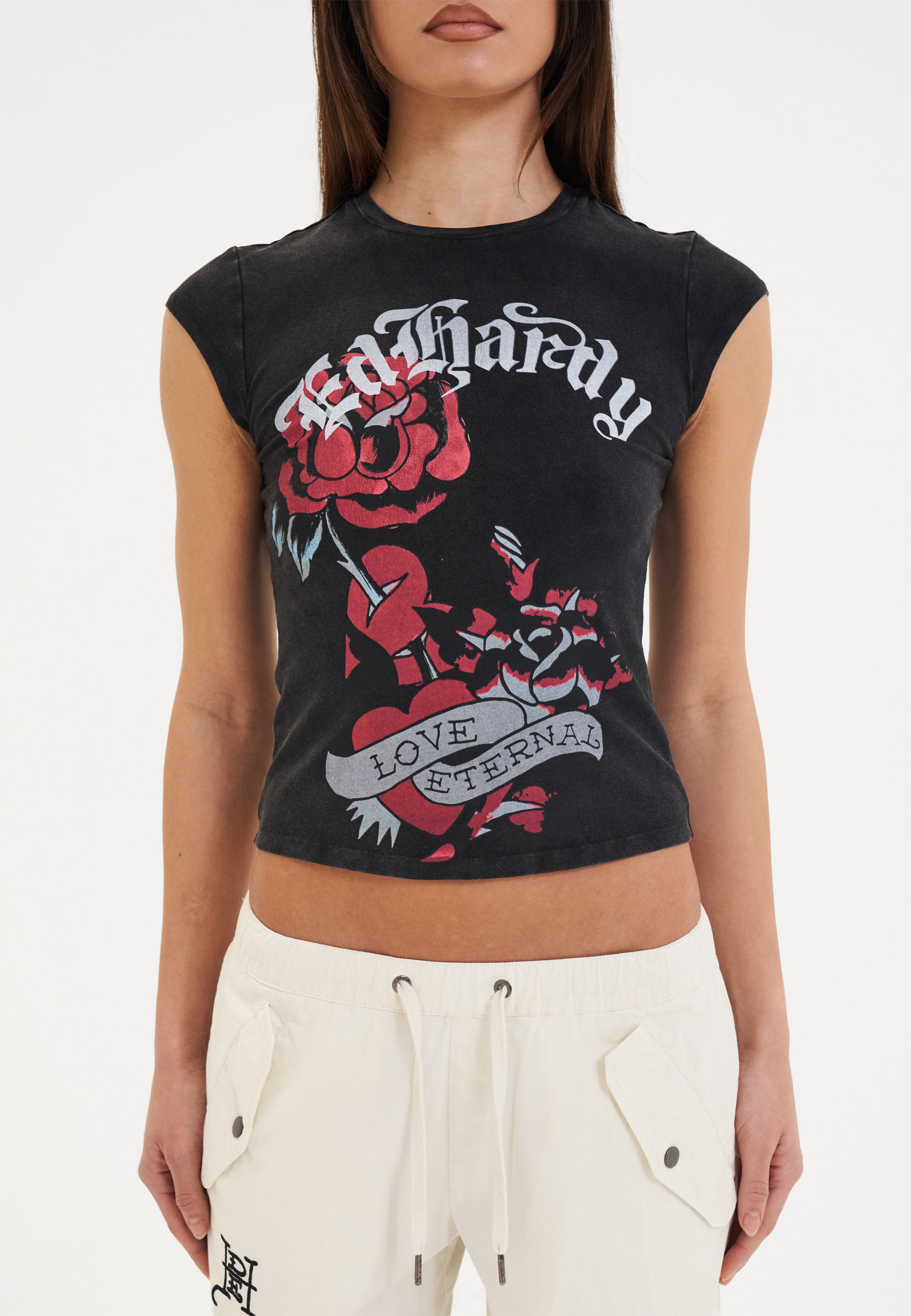 Featuring iconic archival graphics against premium black cotton, The Love Eternal Cap Sleeve T-shirt is crafted to be a wardrobe essential, offering a canvas for your style.