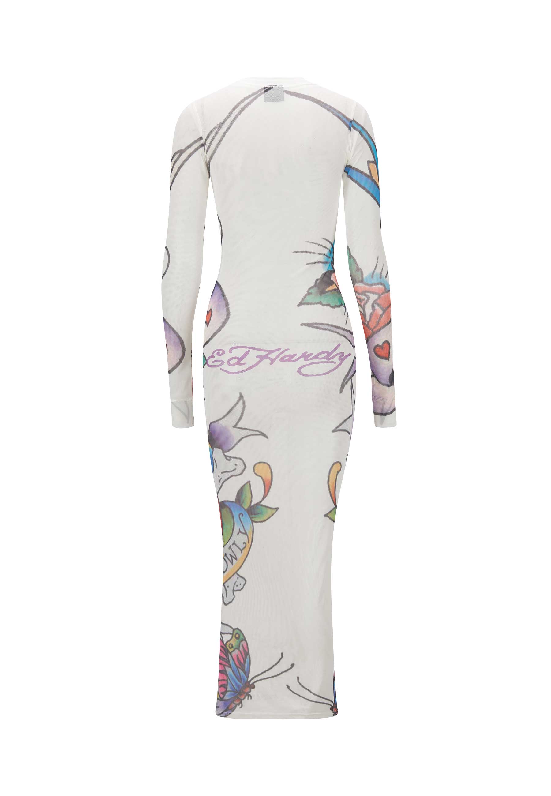 Discover the Tattoo Collage Mesh Long Sleeve Dress, a form-fitting, full-length piece, carefully crafted from 100% polyester mesh.