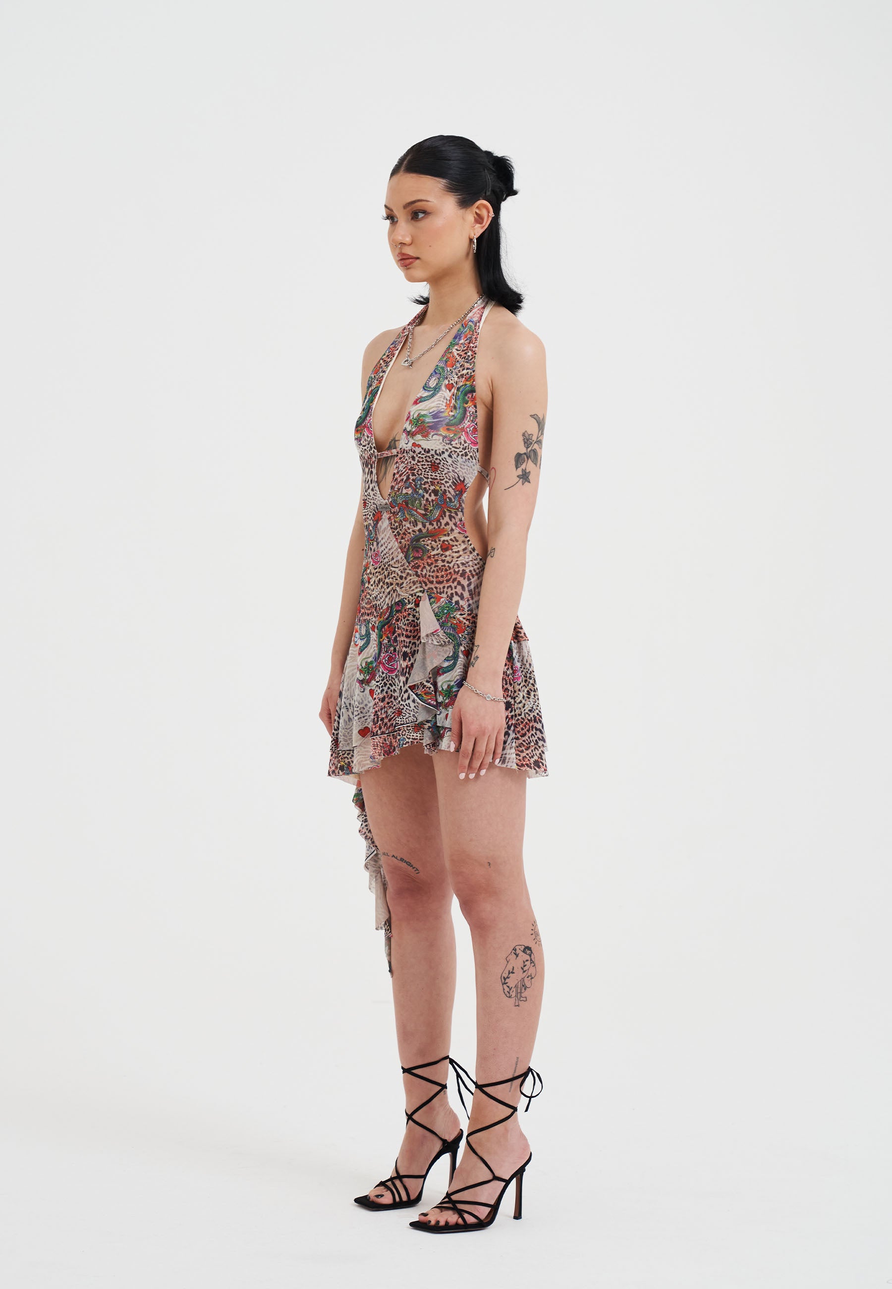 LEOPARD DRAGON HALTHER NECK MINI DRESS