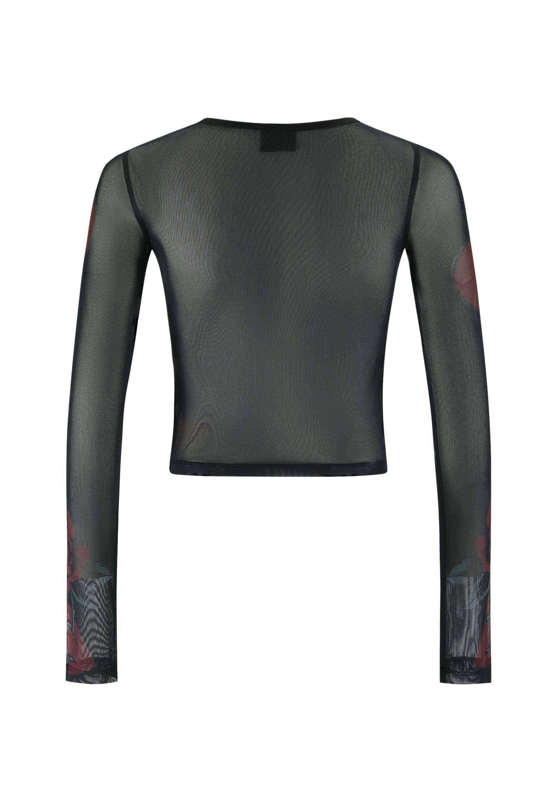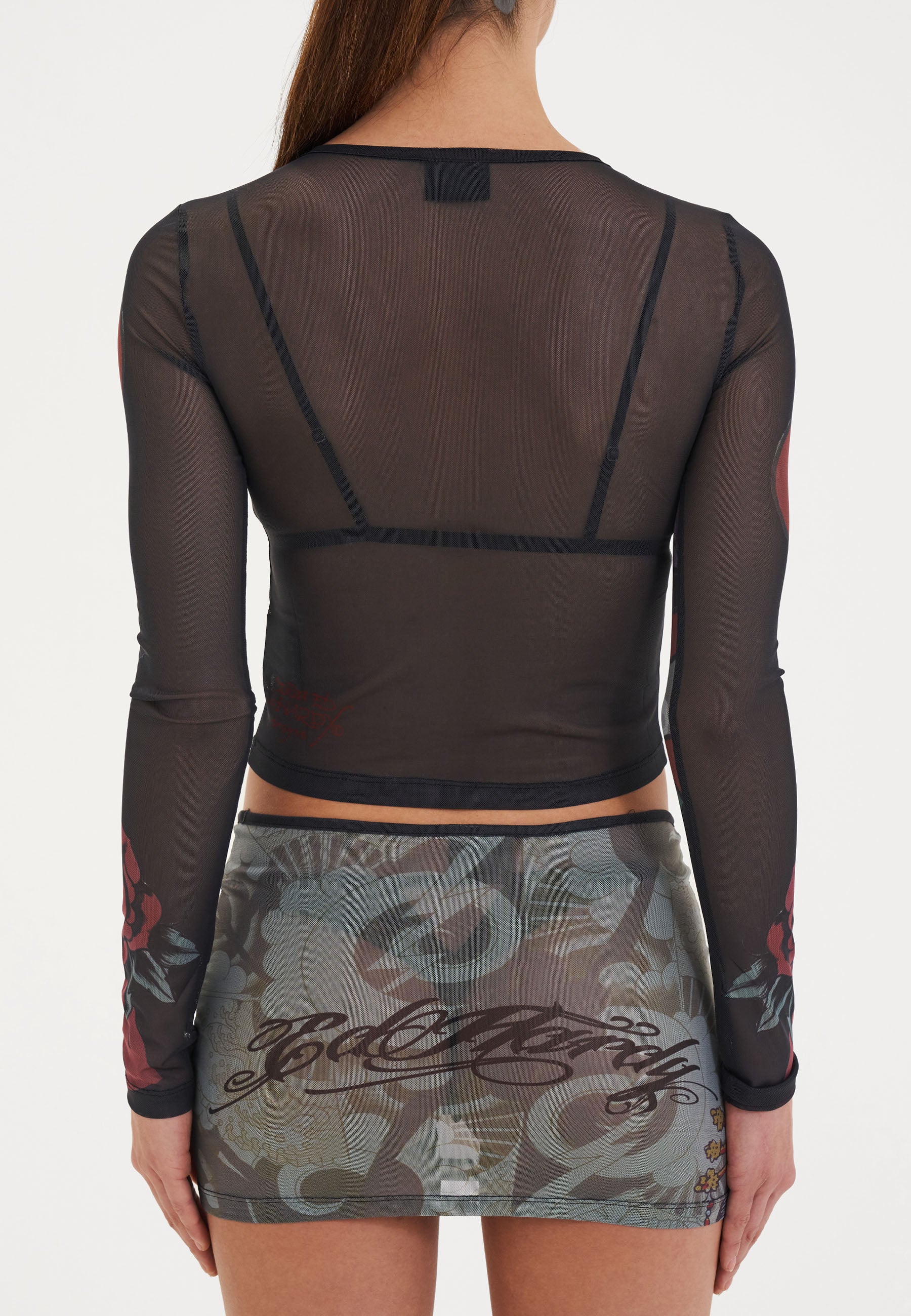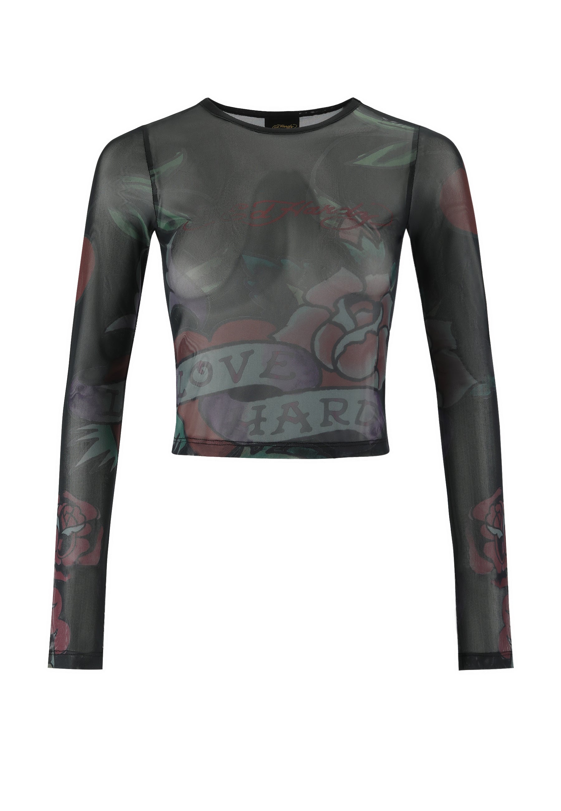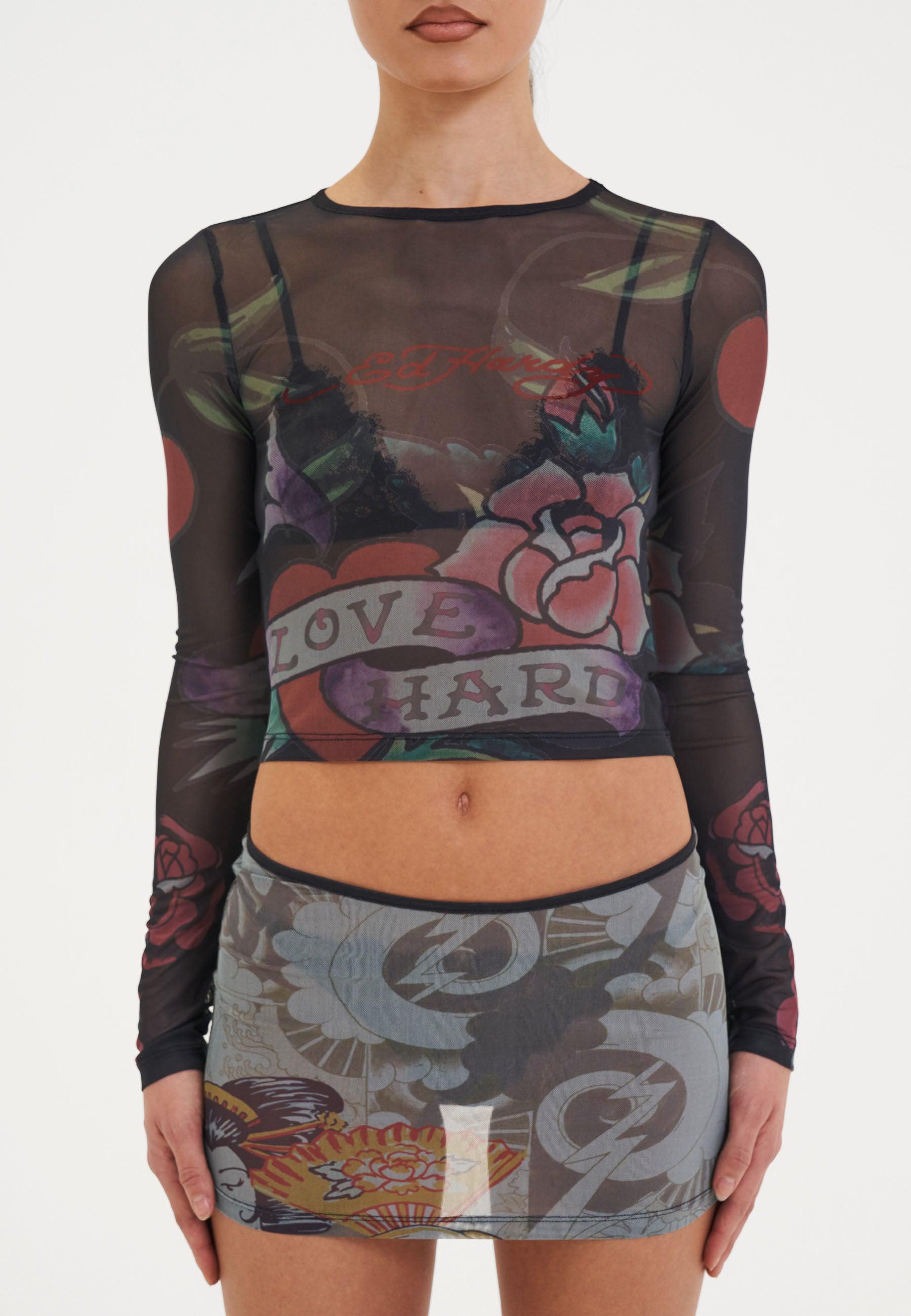 Womens Love Hard Mesh Long Sleeve Tshirt Top - Black