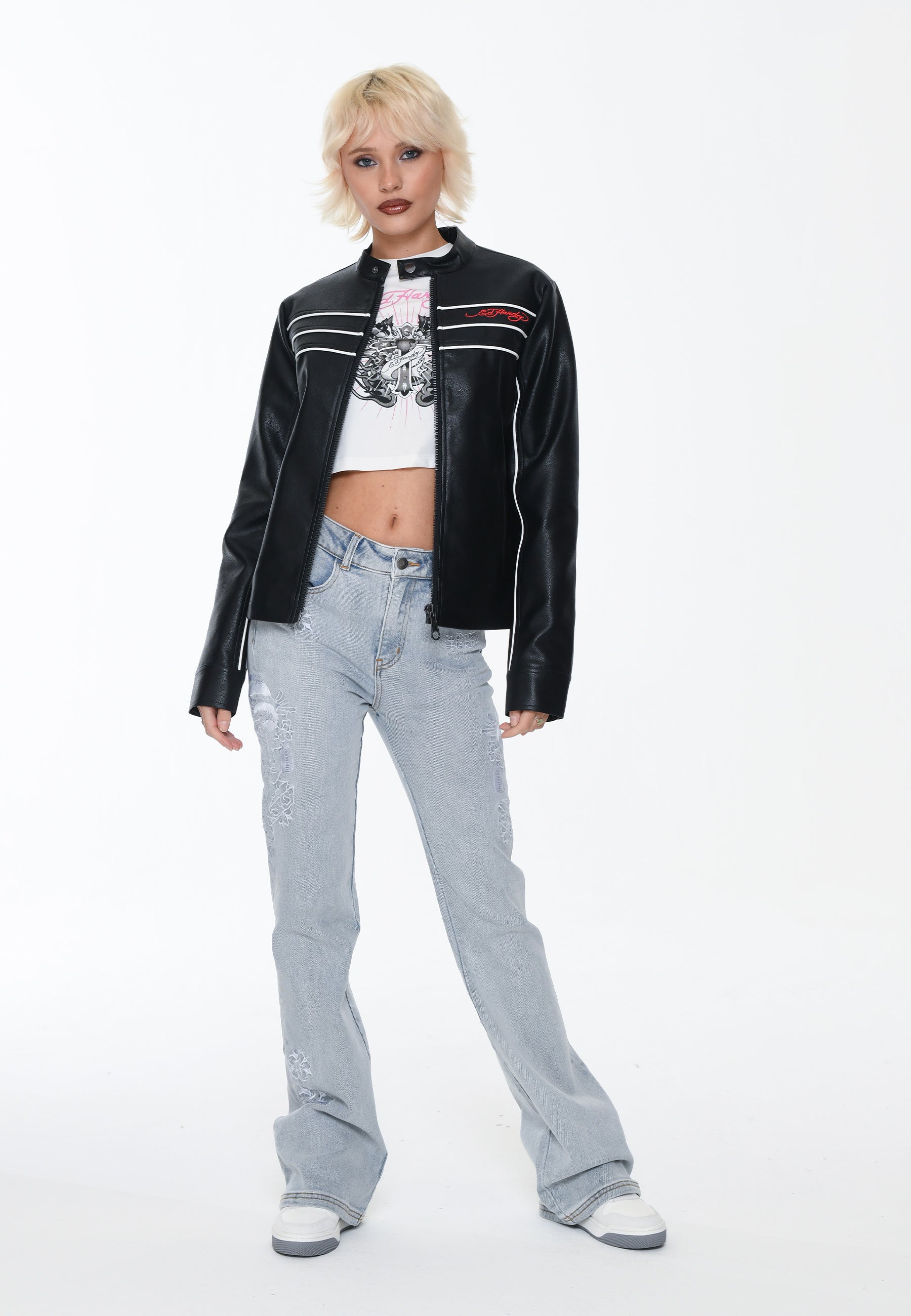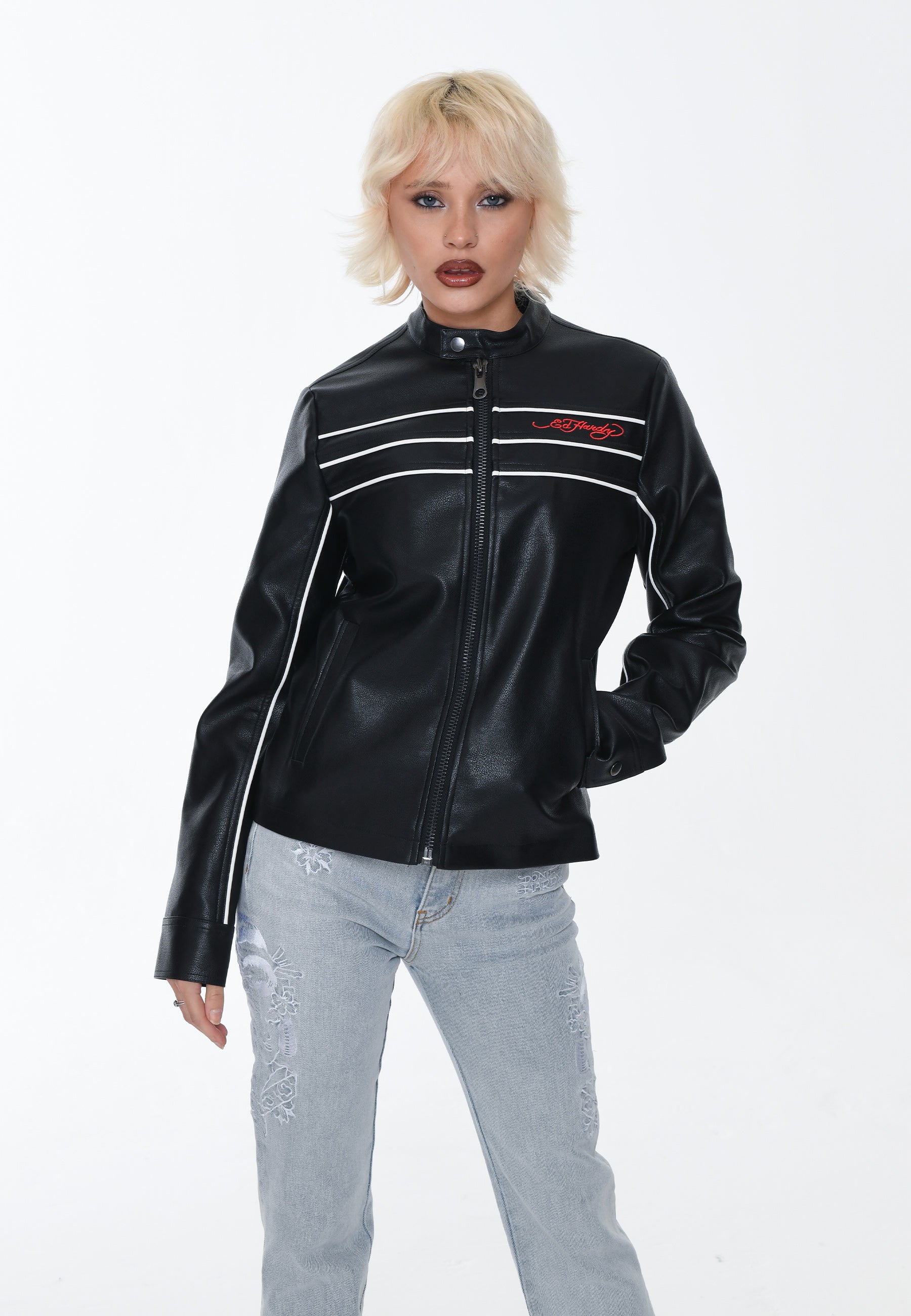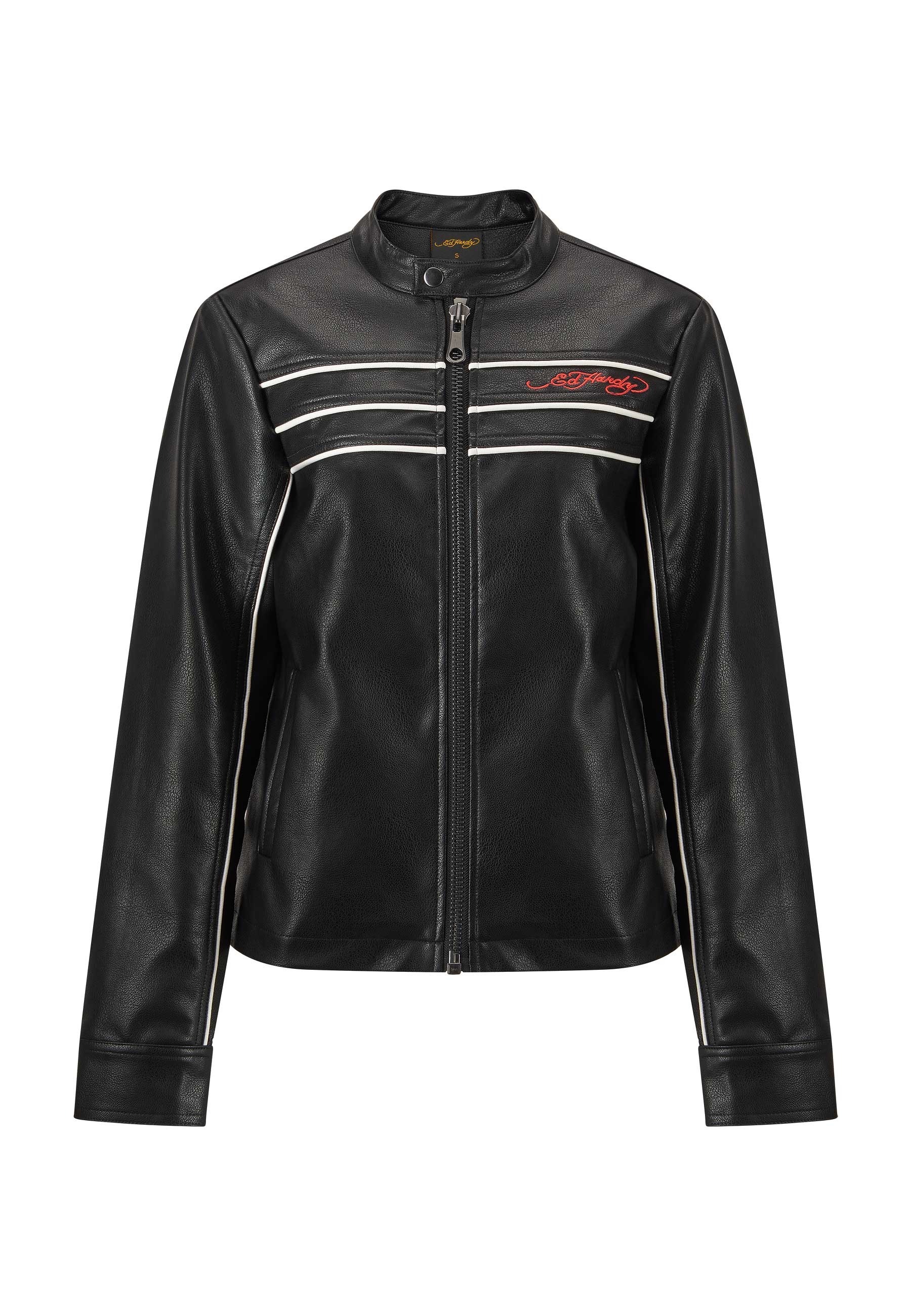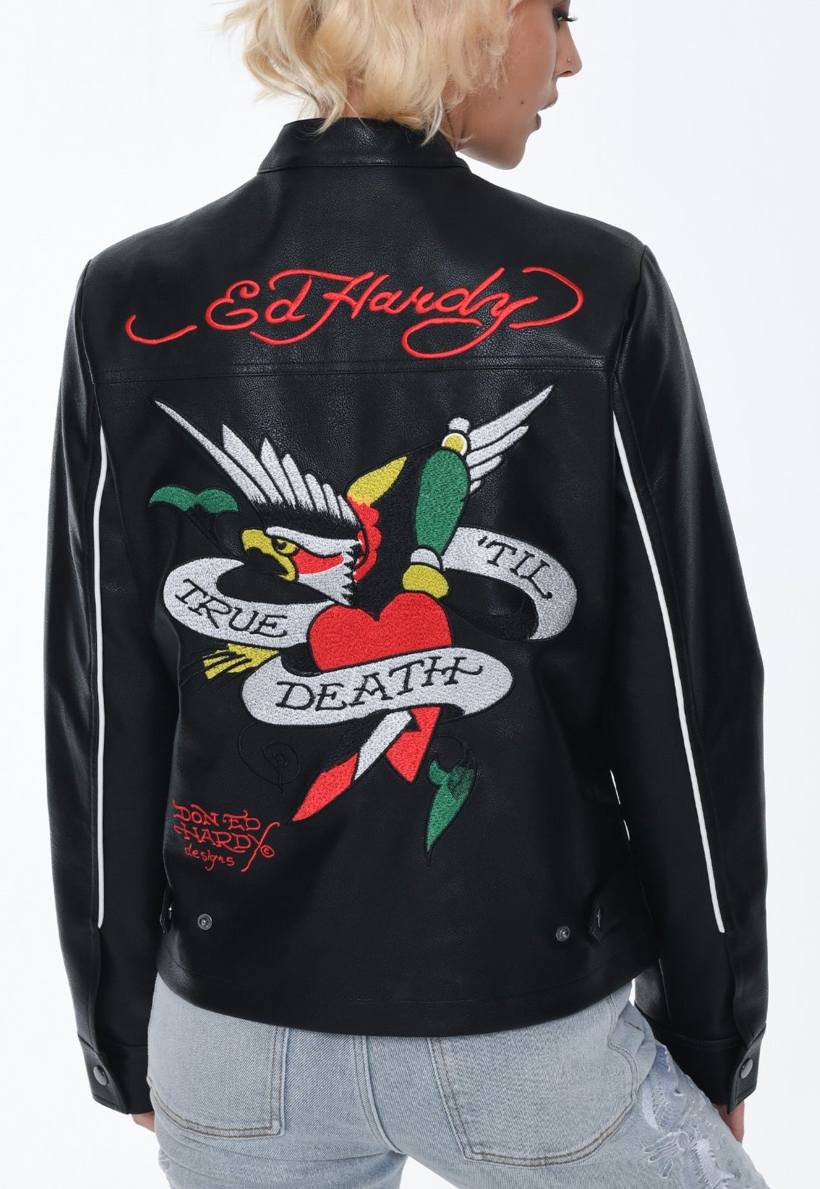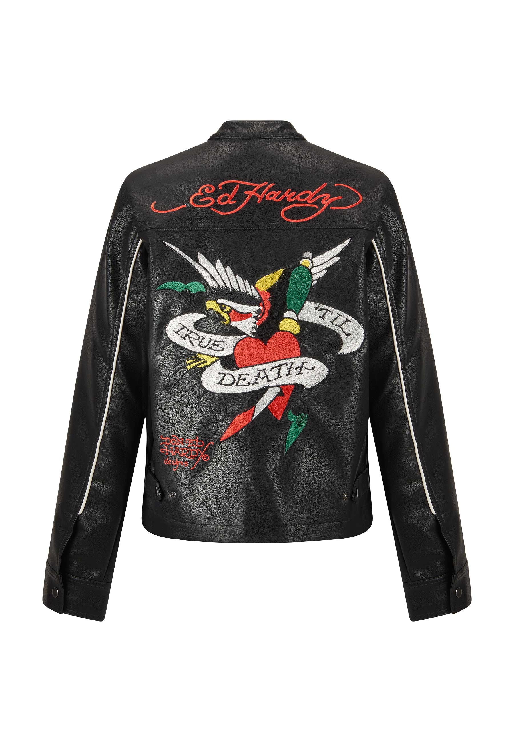 Introducing the Till Death Vegan Leather Biker Jacket, a classic fit jacket in a premium quality black PU. With its impeccable detailing and the bold "True Till Death" eagle graphic embroidered in vivid full colour, this piece epitomises the chic designs that define Ed Hardy's legacy.