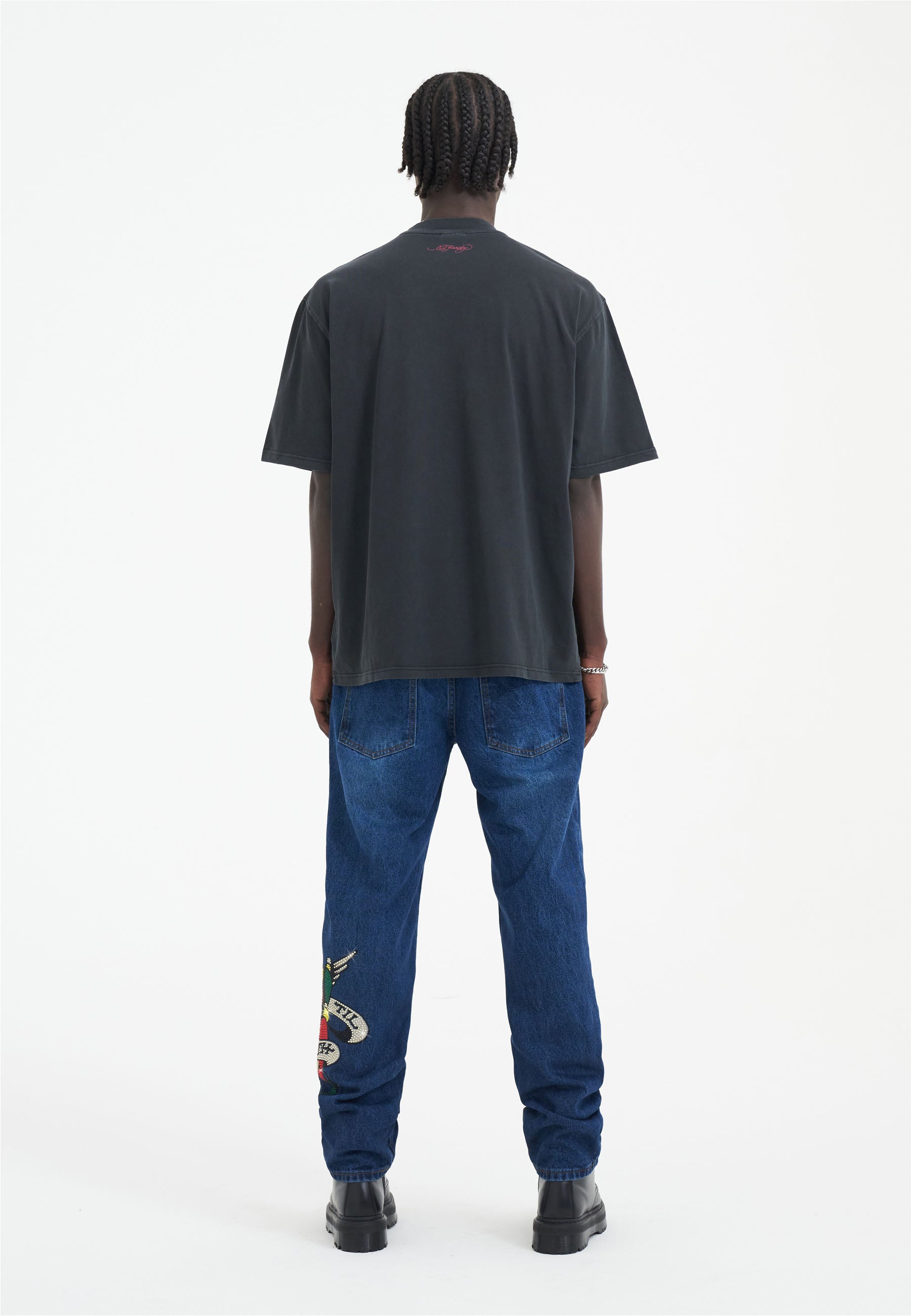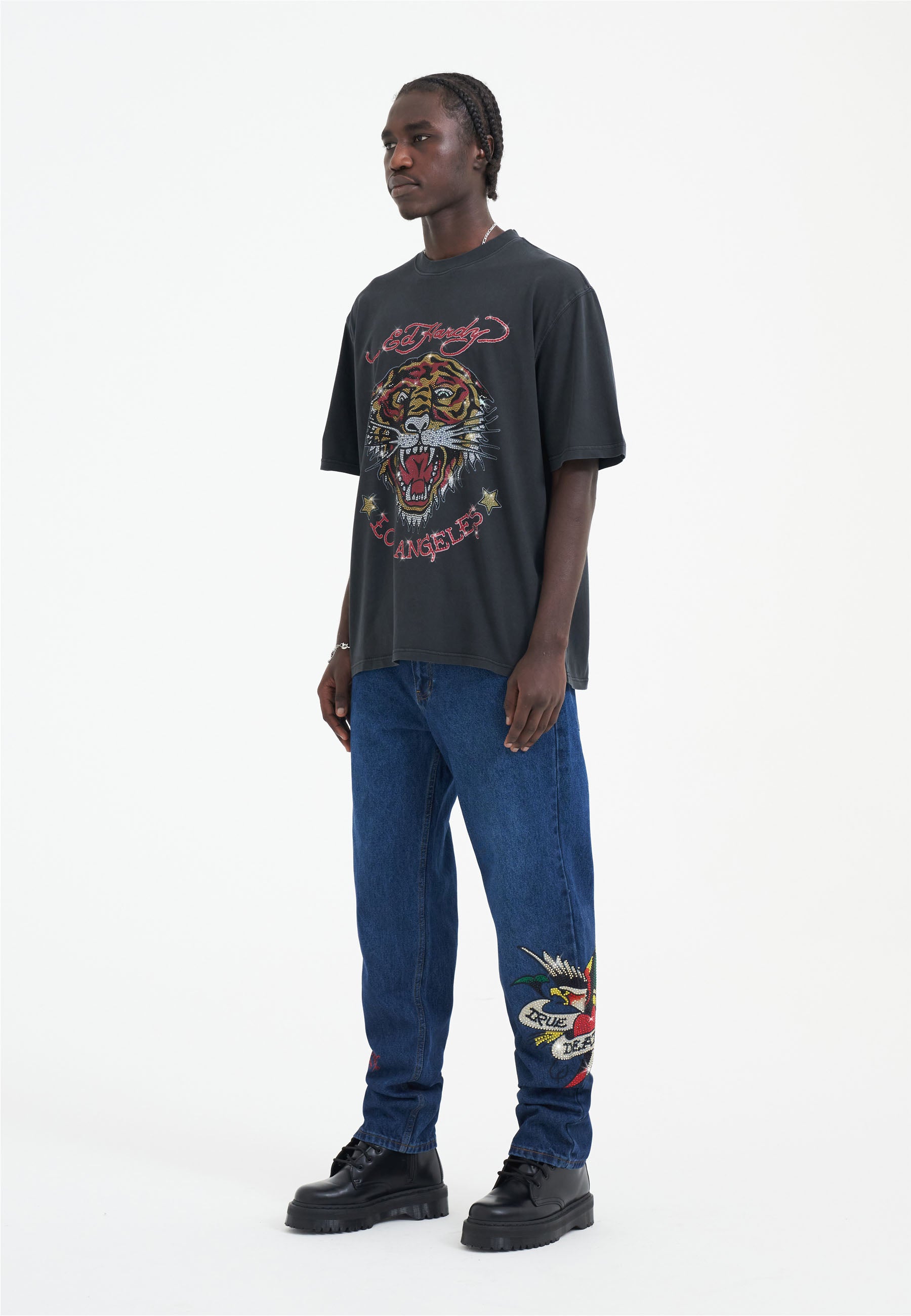Featuring a full-colour diamante graphic against a washed-black cotton, Ed says 'be bold' this season.