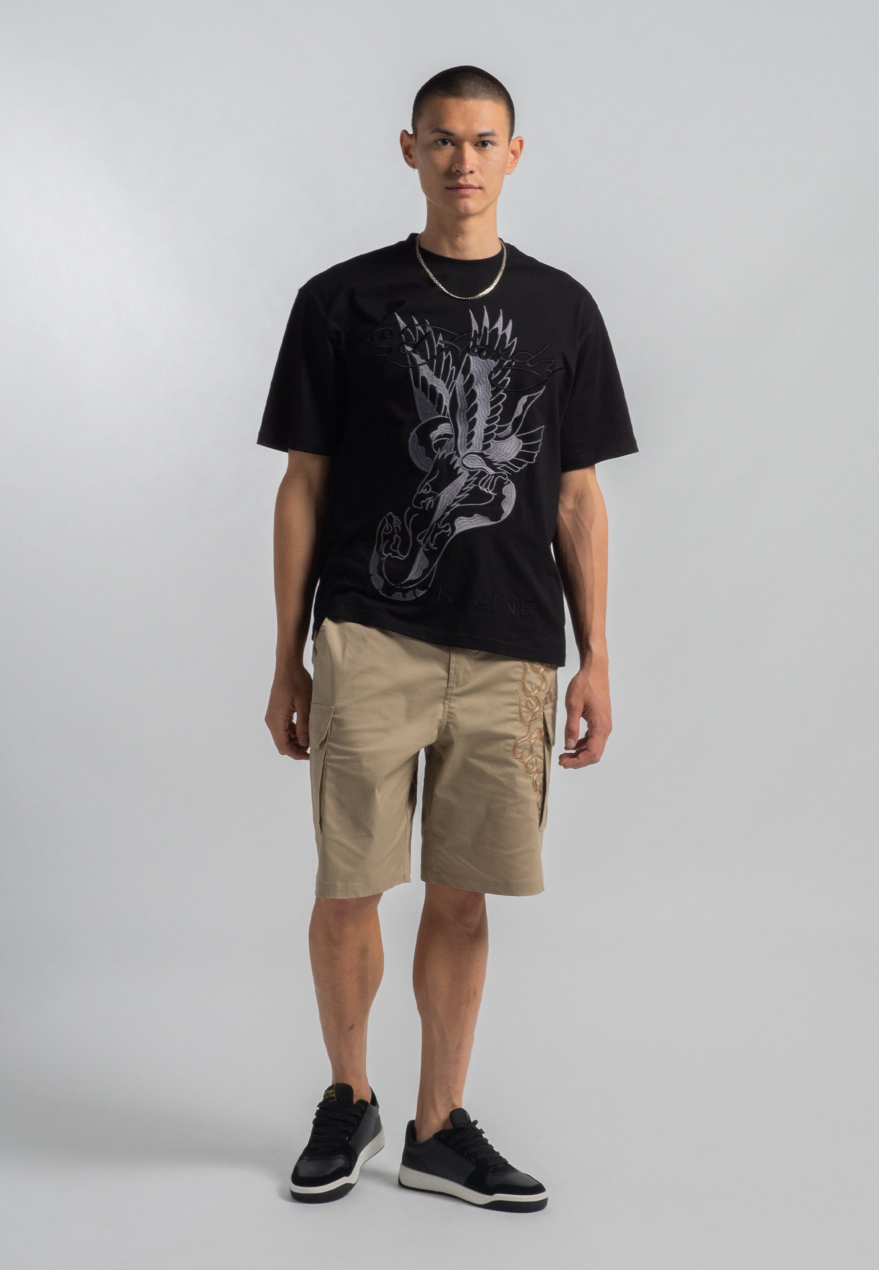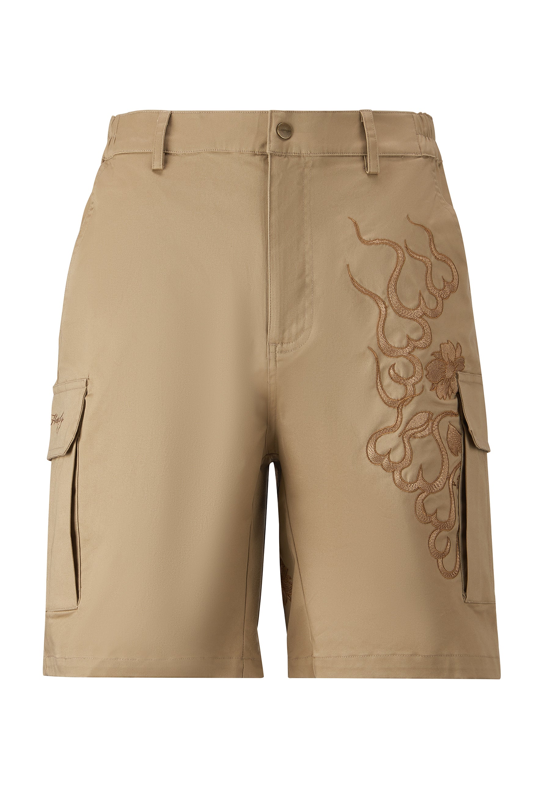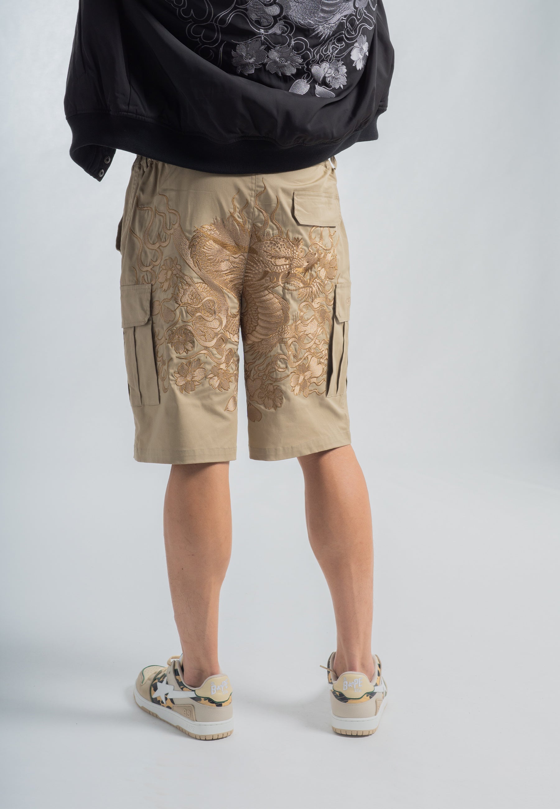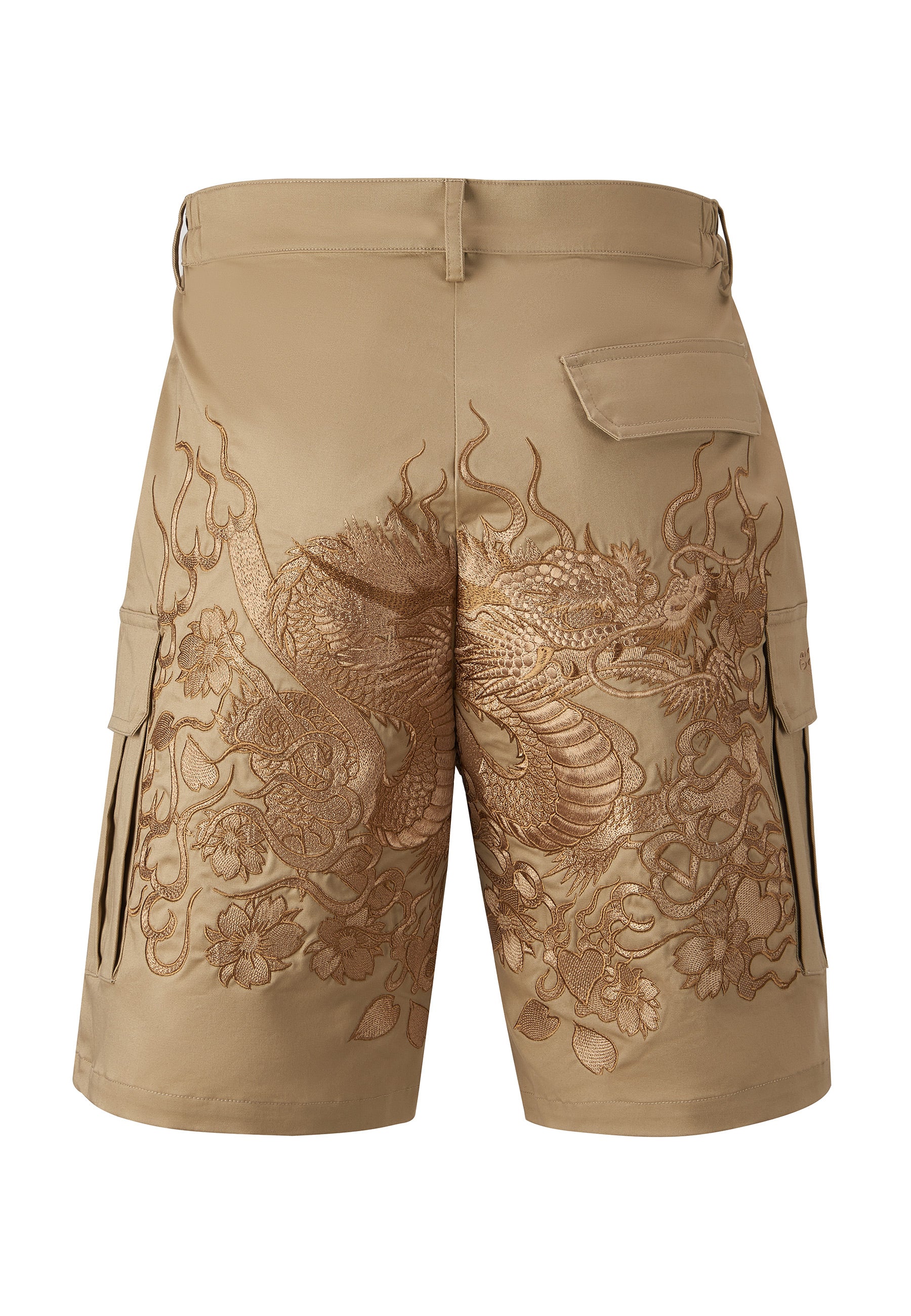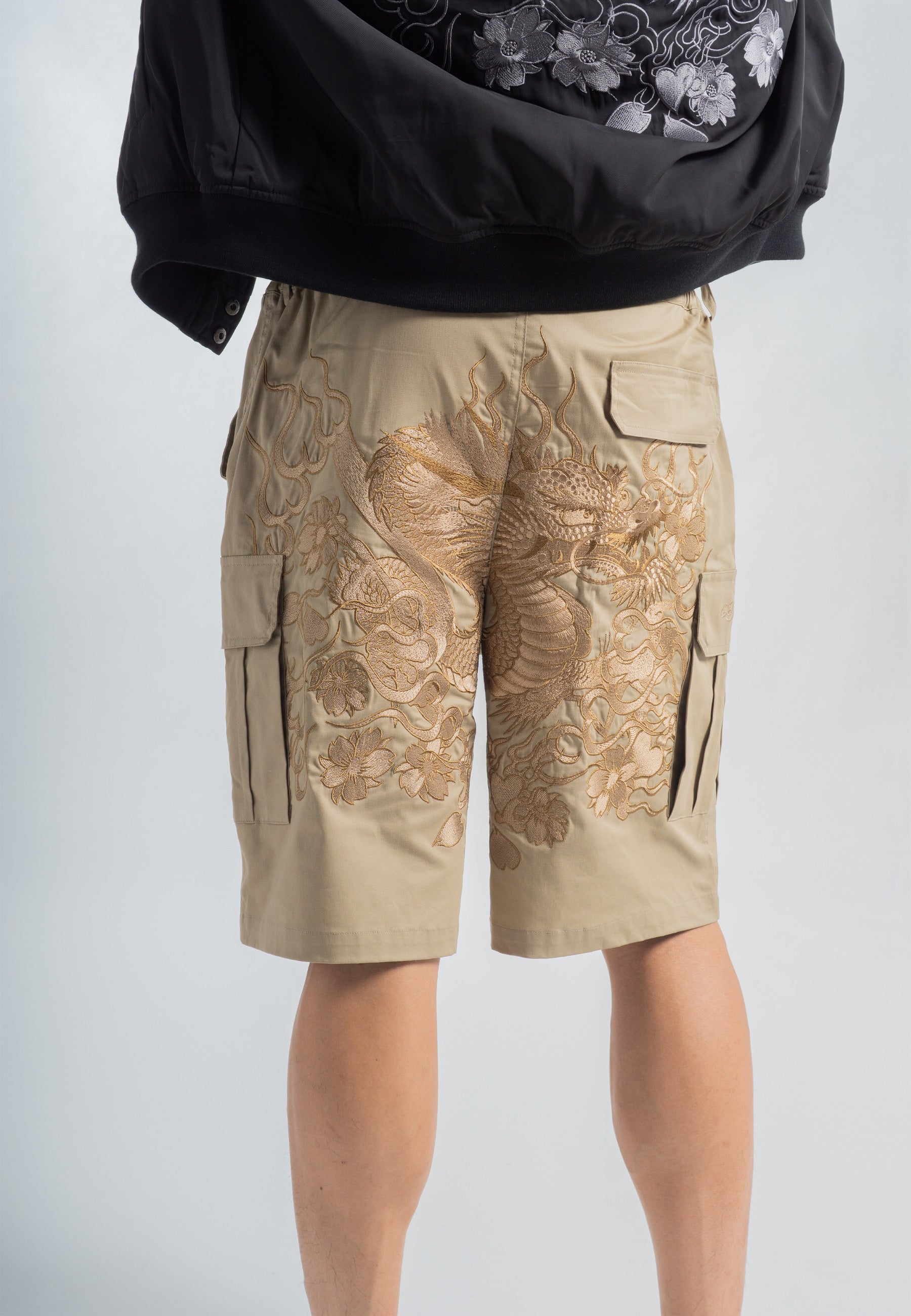 Mens Vintage-Dragon Embroidered Combat Trousers Shorts - Beige