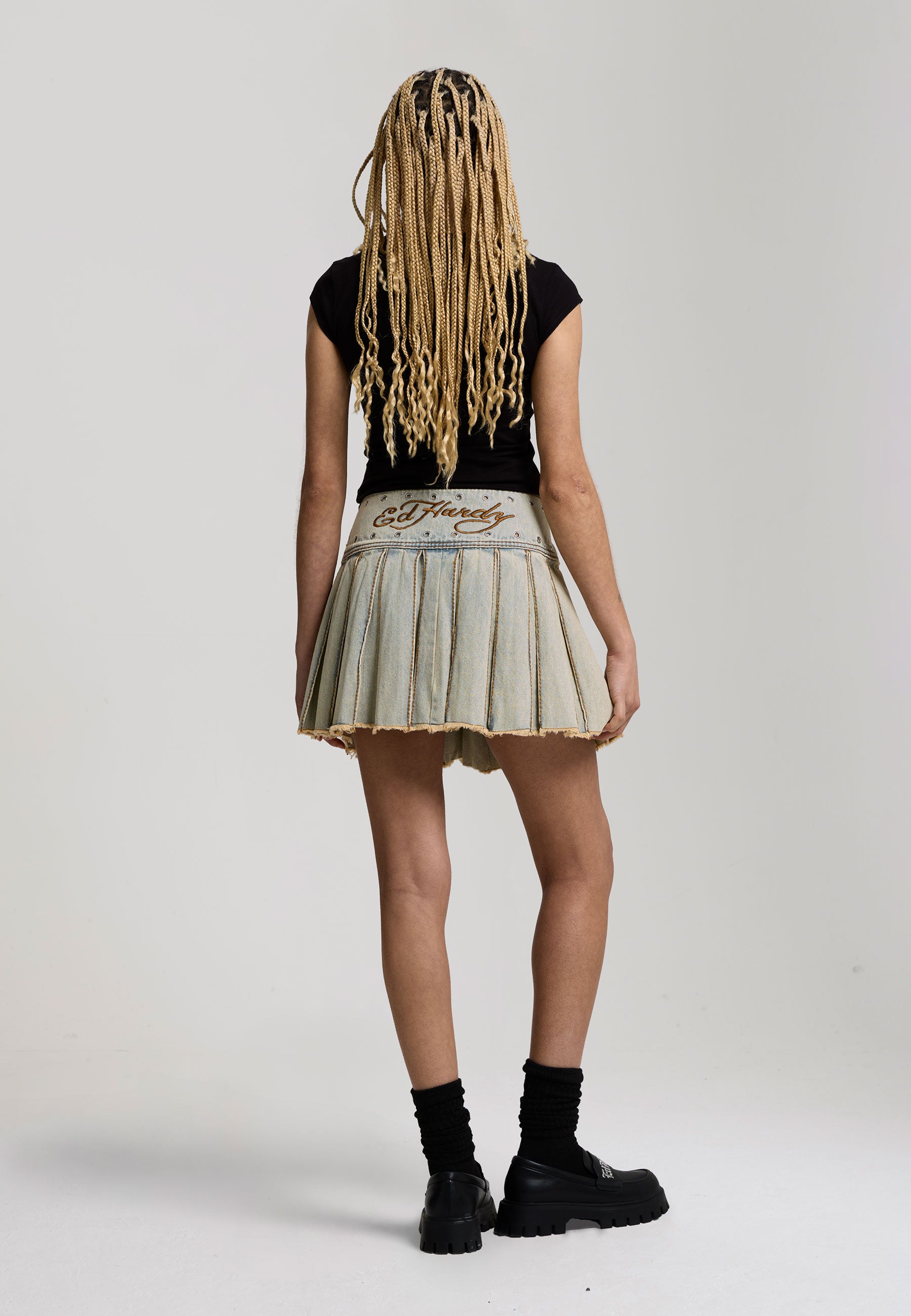REGULAR FIT 100% COTTON BLEACH WASH FLORALS EMBROIDERY TO FRONT ED HARDY EMBROIDERY TO BACK MINI LENGTH EYELET DETAIL CONTRAST STITCH DETAIL SIDE ZIP FASTENING RAW HEM PLEATED DETAILING 100% COTTON