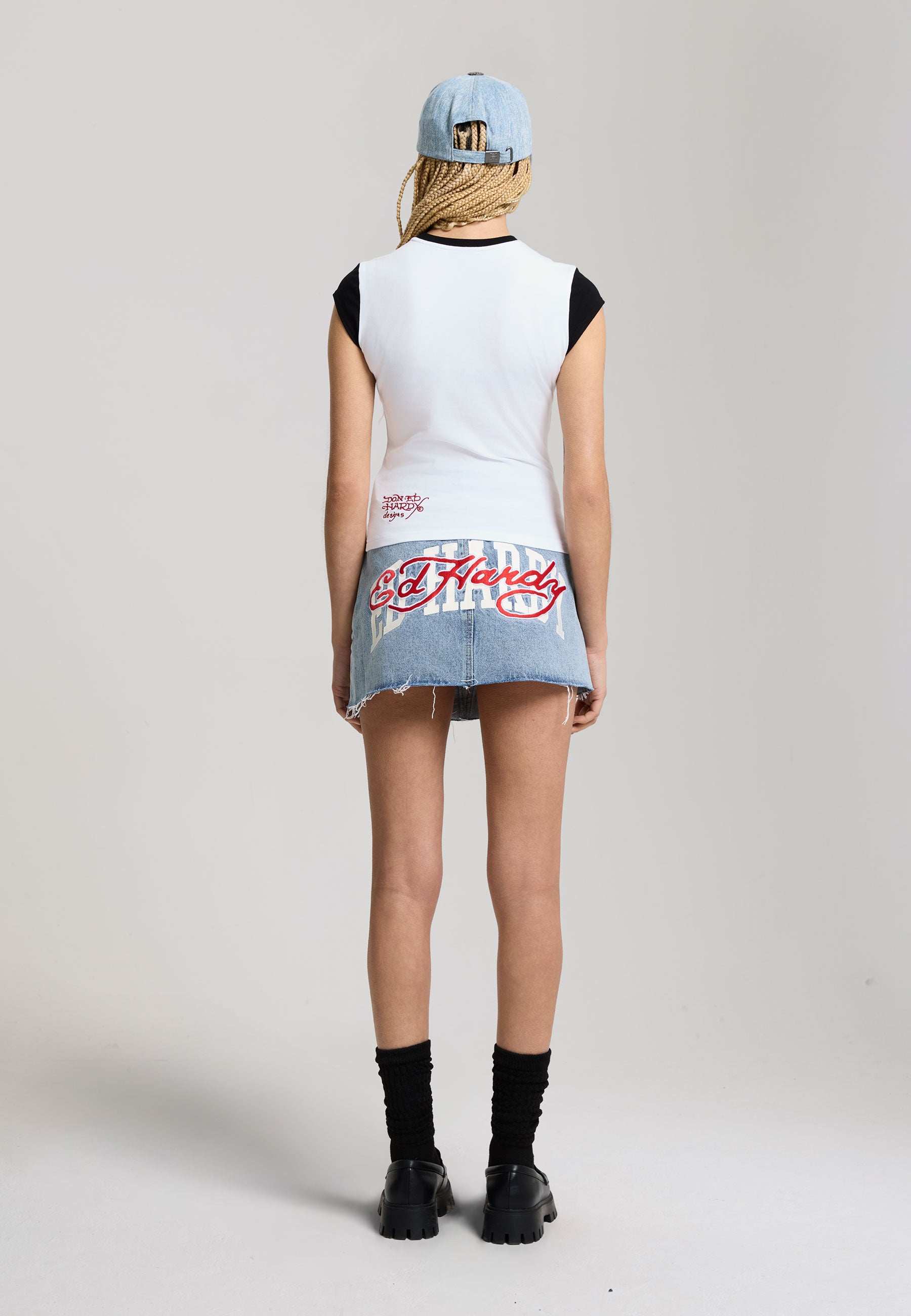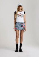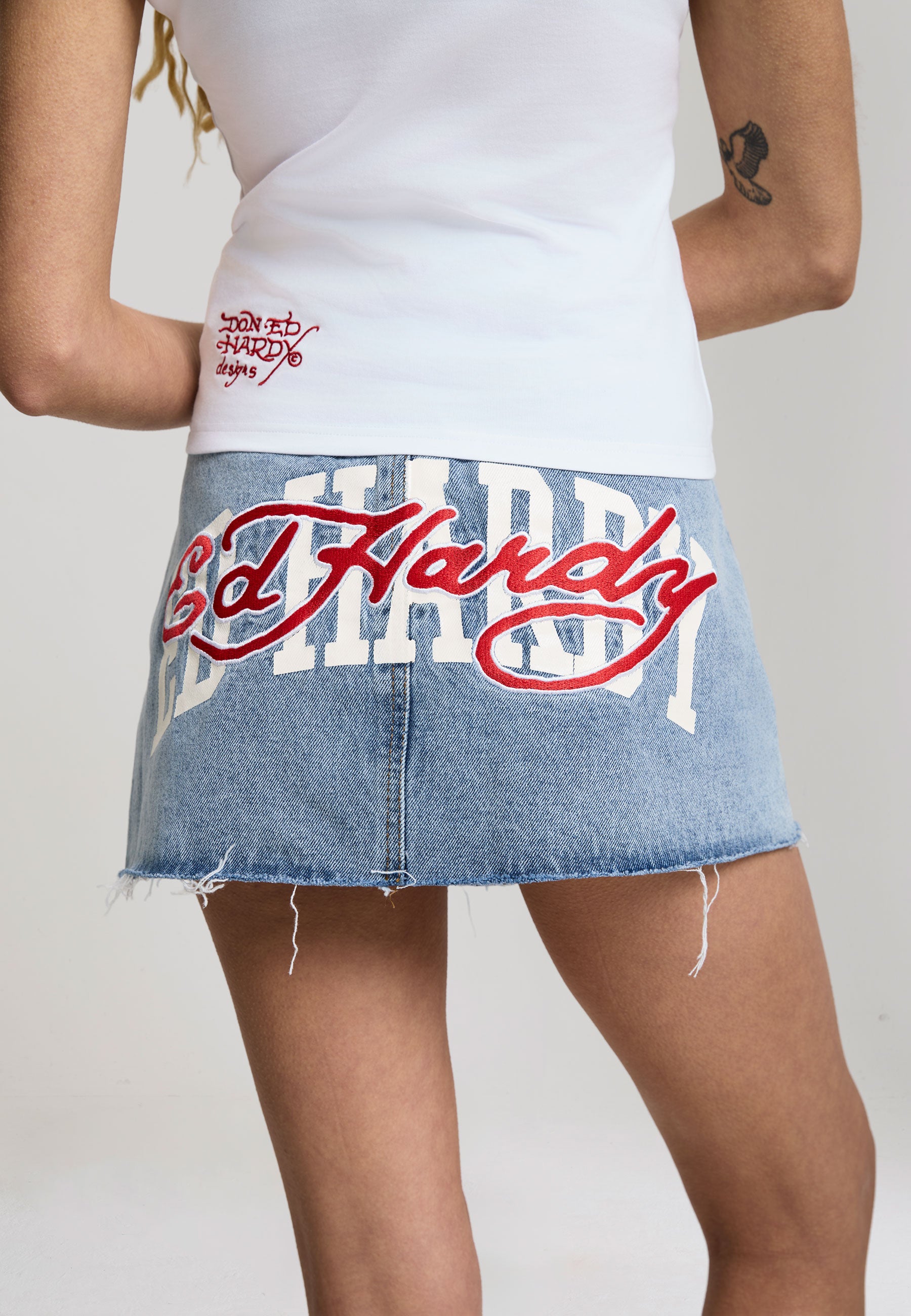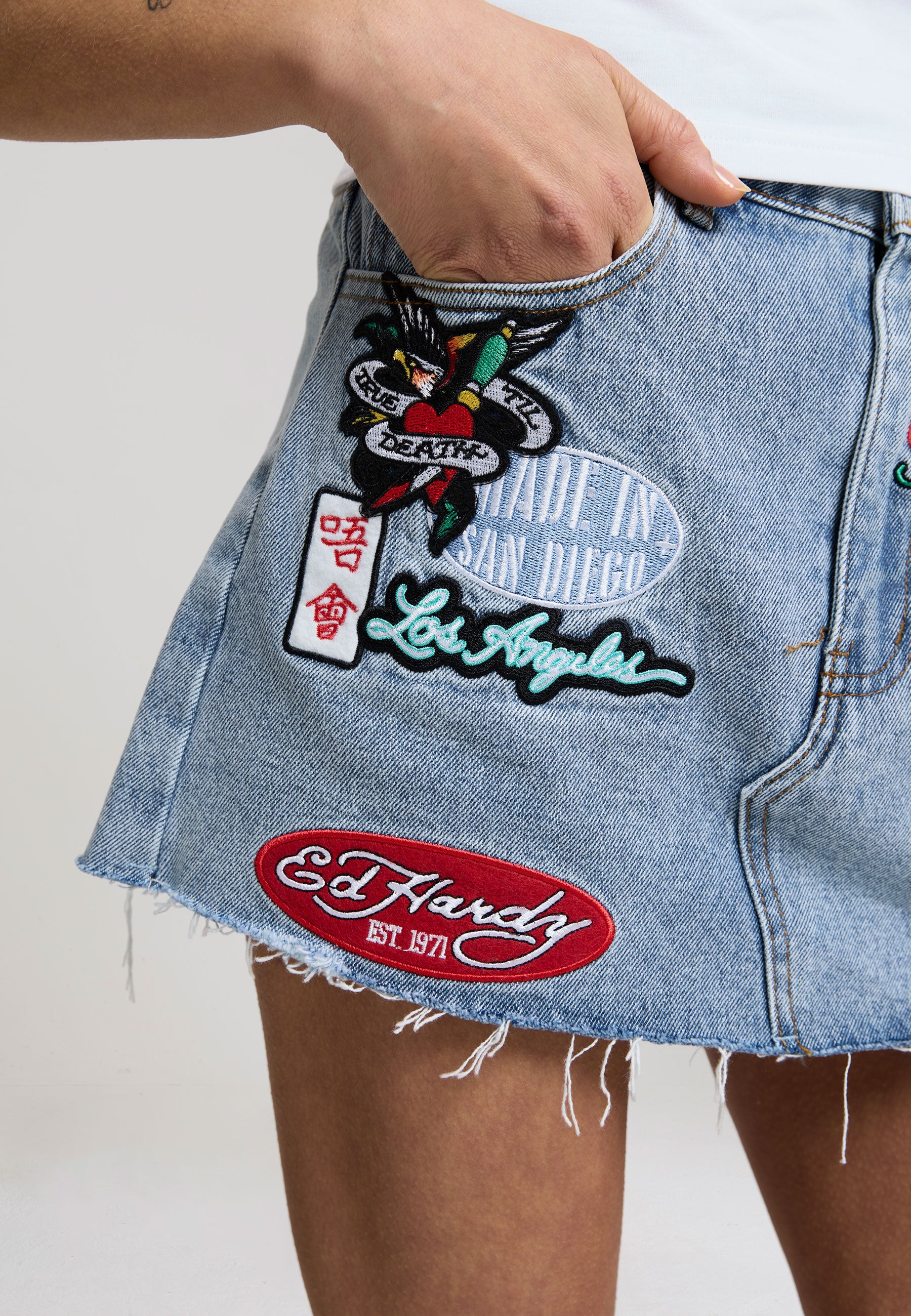 FITTED MINI LENGTH WASHED APPLIQUE BADGES TO FRONT PRINT / EMBROIDERY TO BACK RAW HEM 100% COTTON