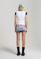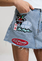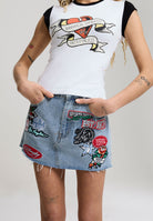 Womens Multi Badge Tattoo Denim Fitted Mini Skirt - Mid Blue
