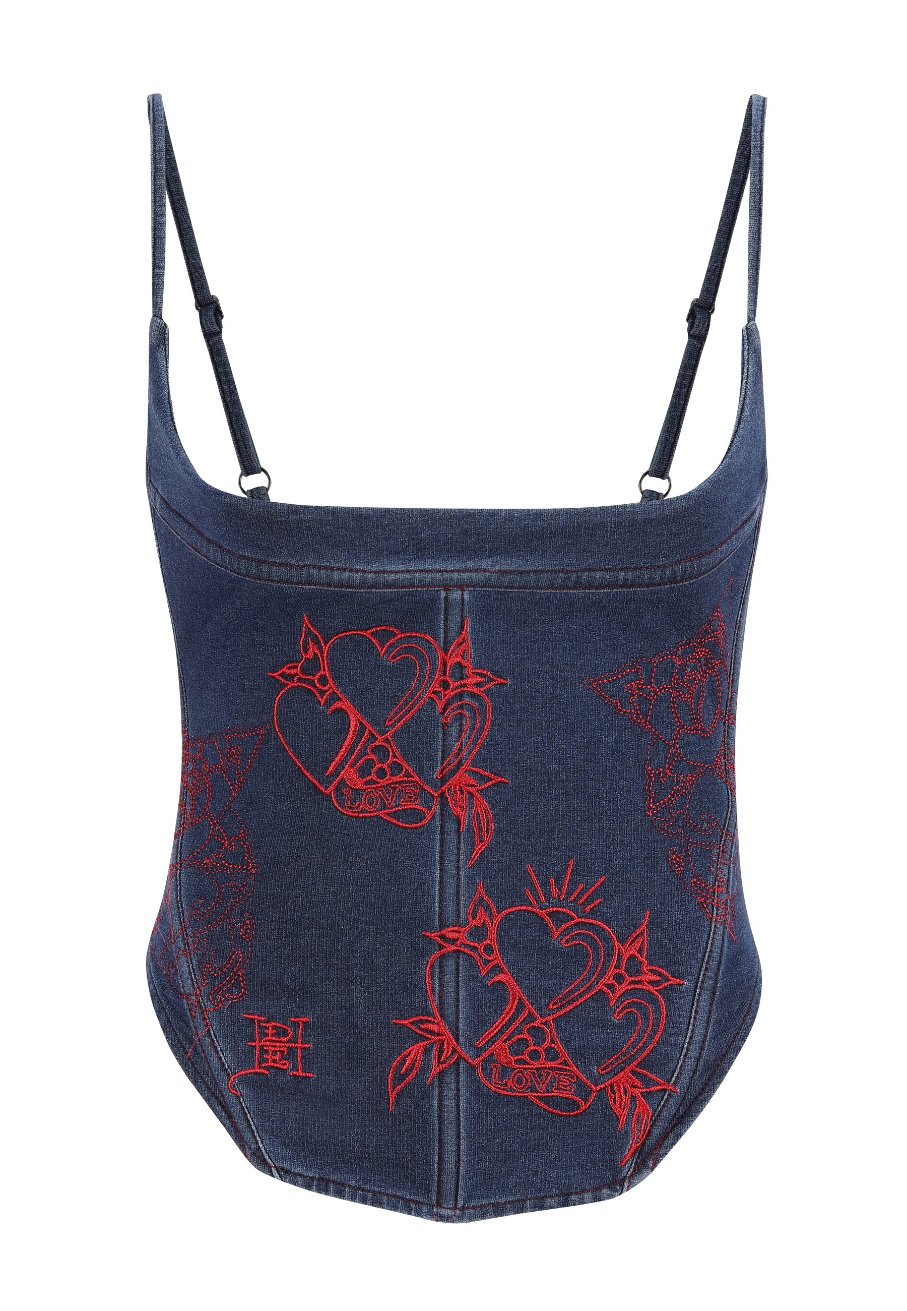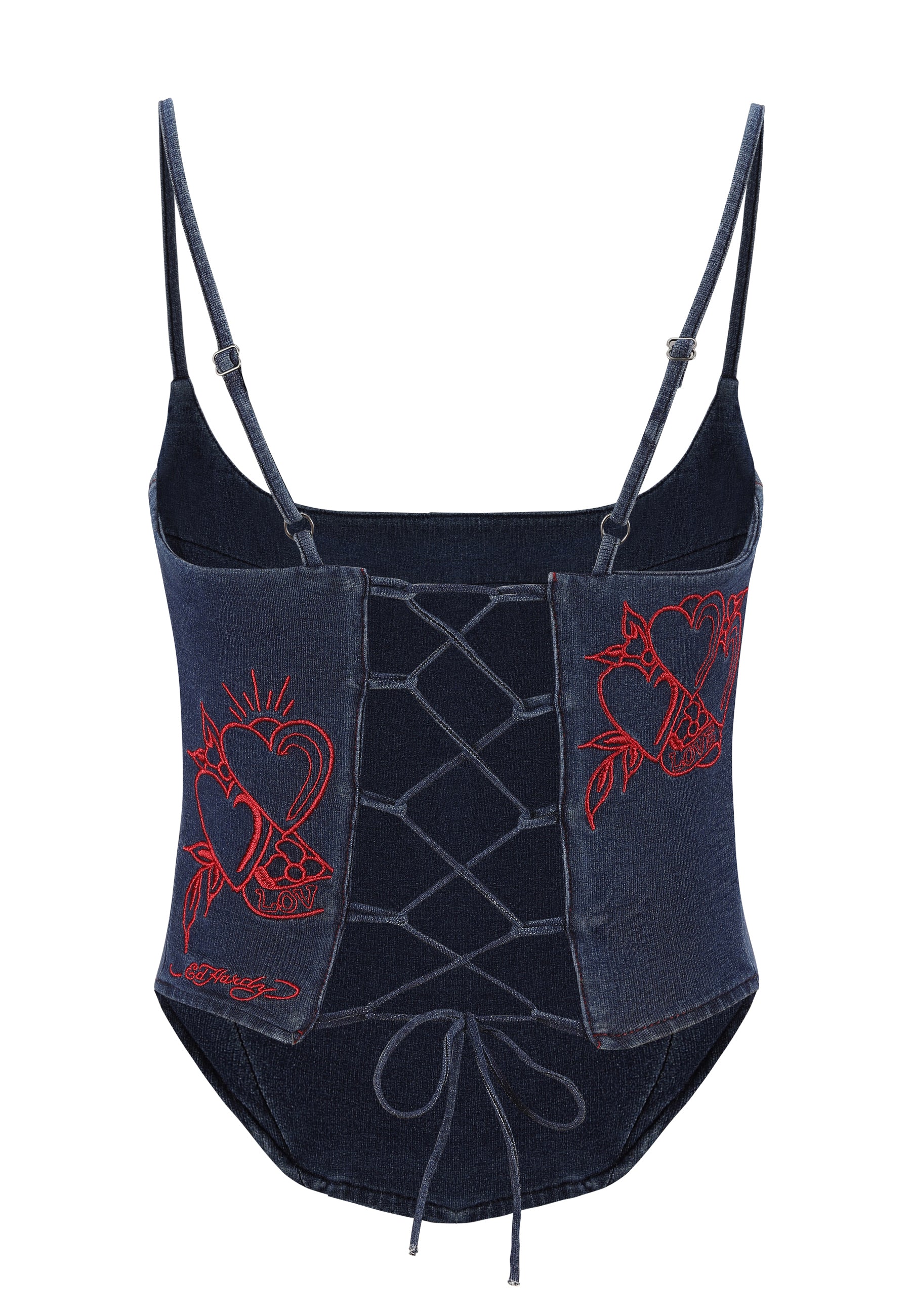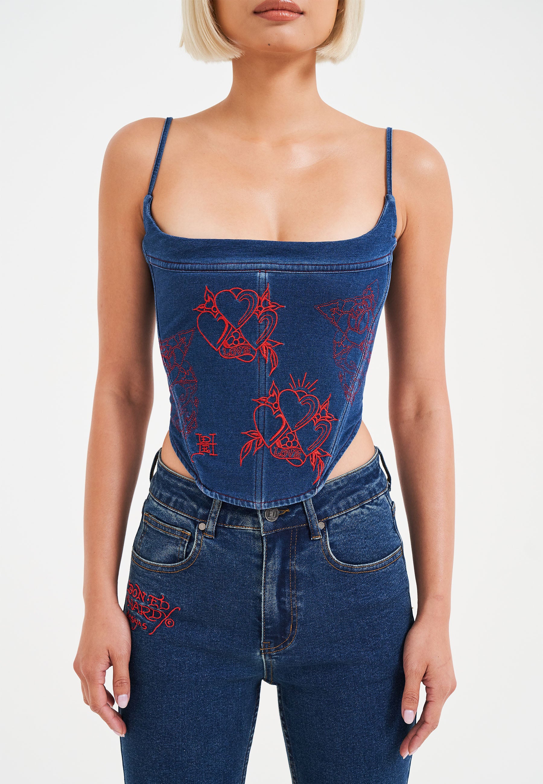 Womens Rouge Hearts Denim Corset Top - Indigo