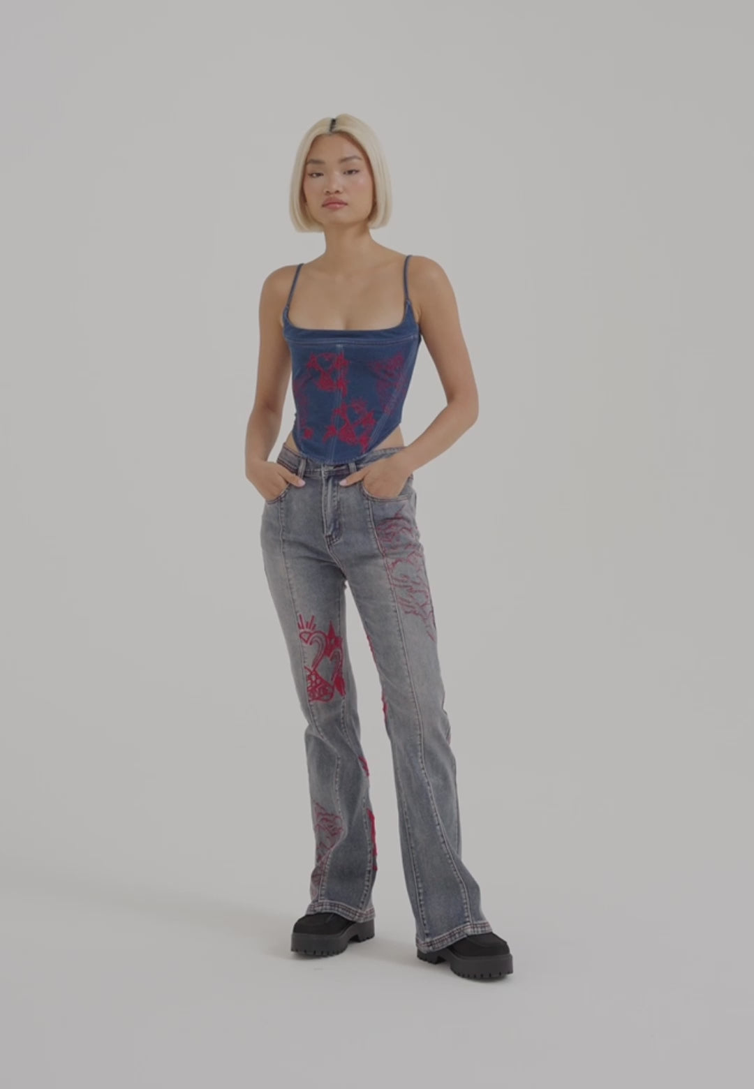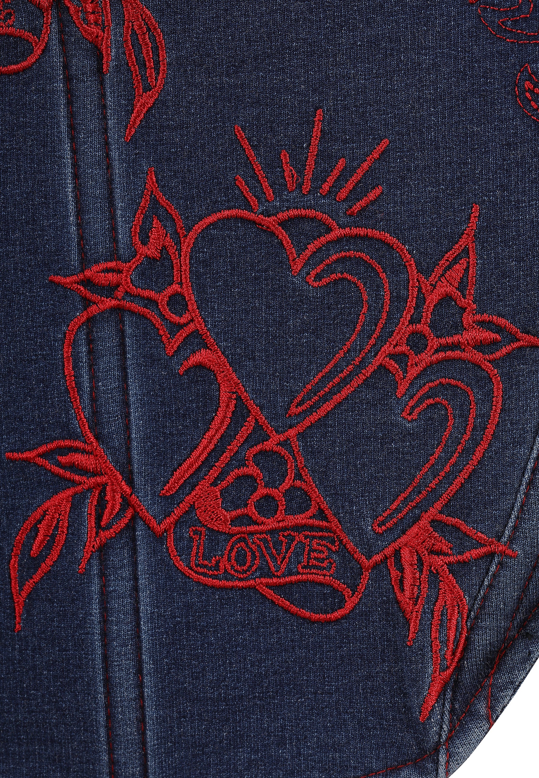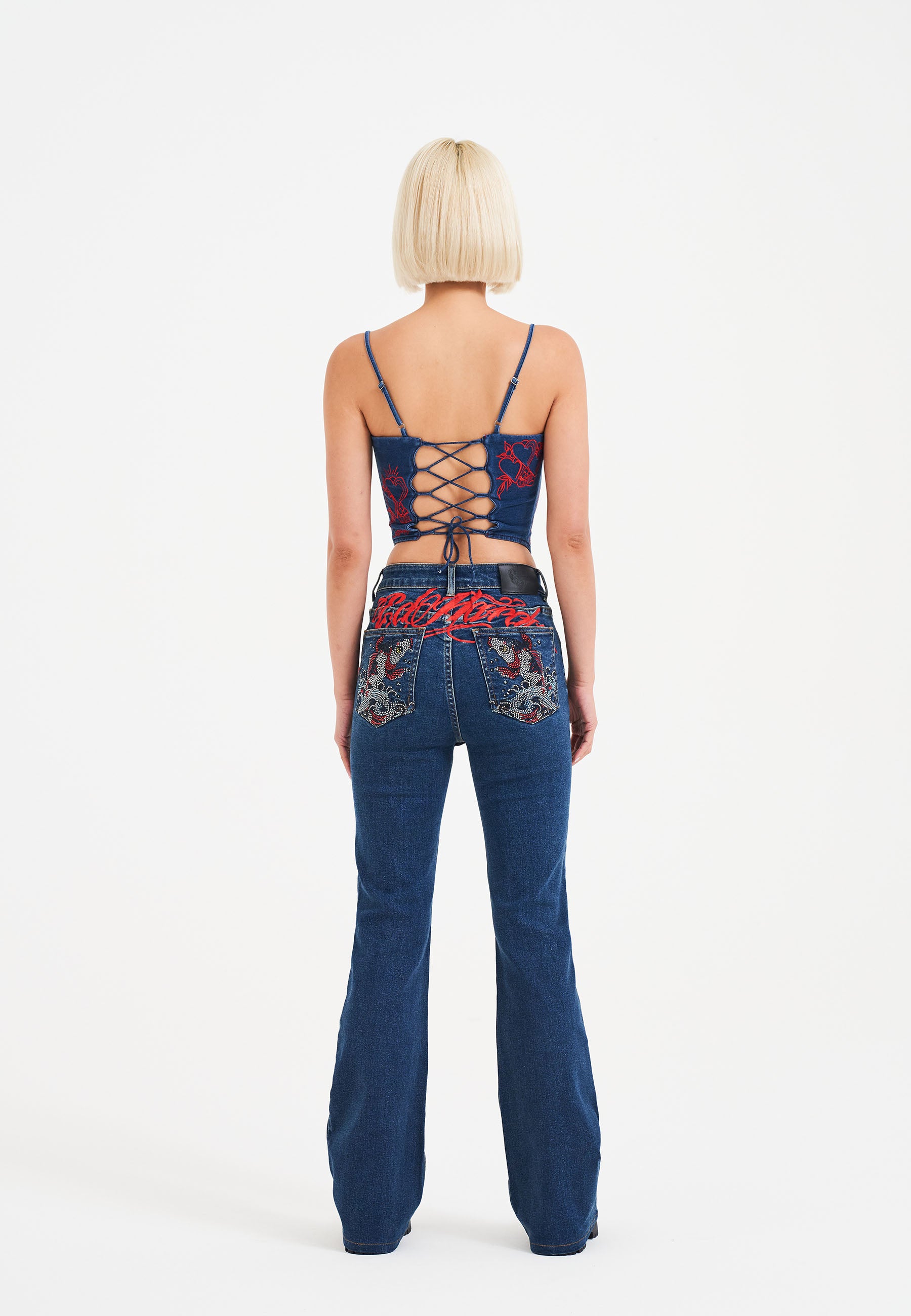 This indigo corset top features a striking red heart graphic that channels Ed Hardy’s bold tattoo artistry. Designed for a tight fit, it’s crafted from washed denim for a vintage feel. Adjustable straps and a lace-up back ensure a perfectly flattering fit that doesn’t compromise on style.
