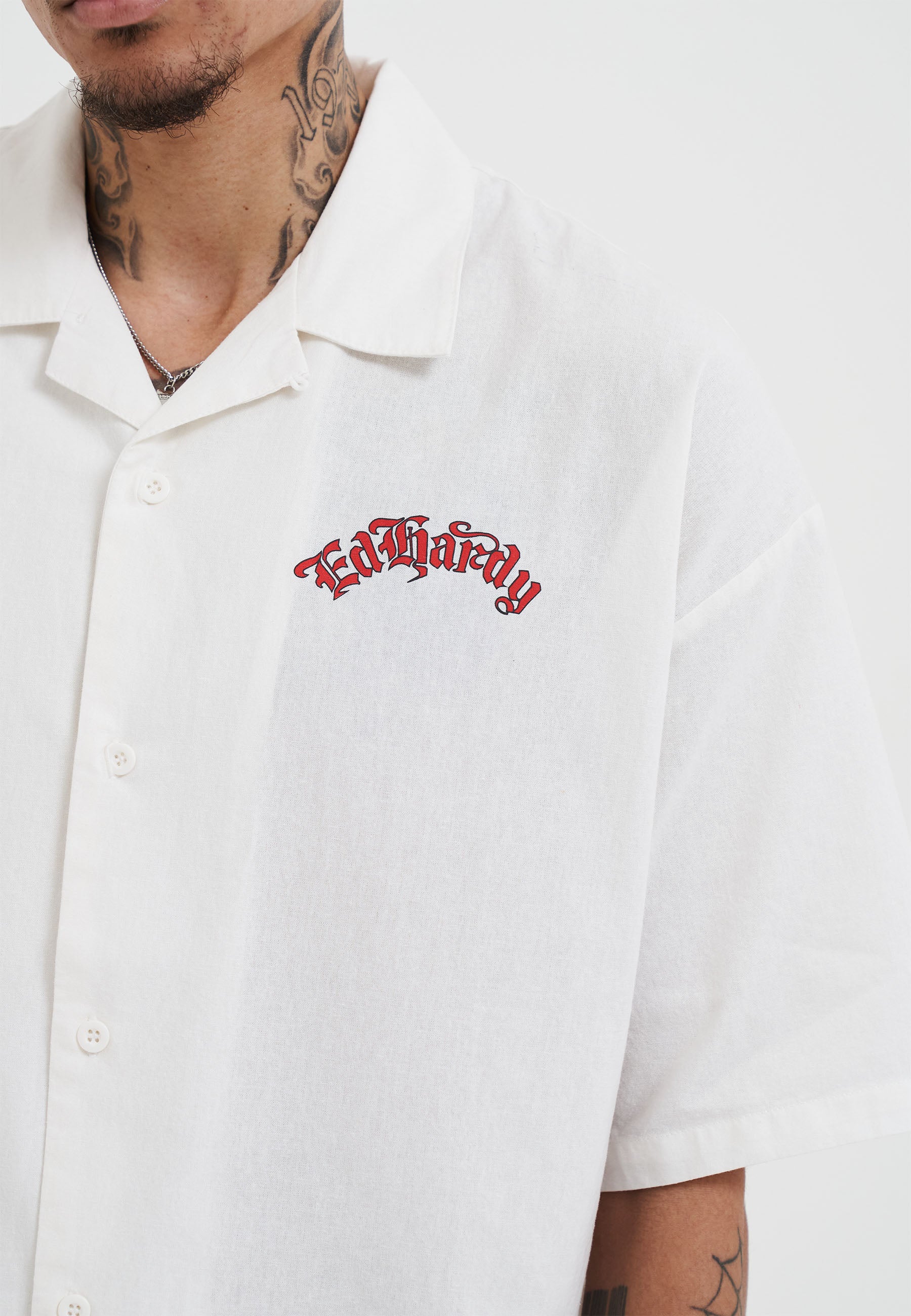 Mens Don Wolf Dragon Printed Camp Shirt - Ecru