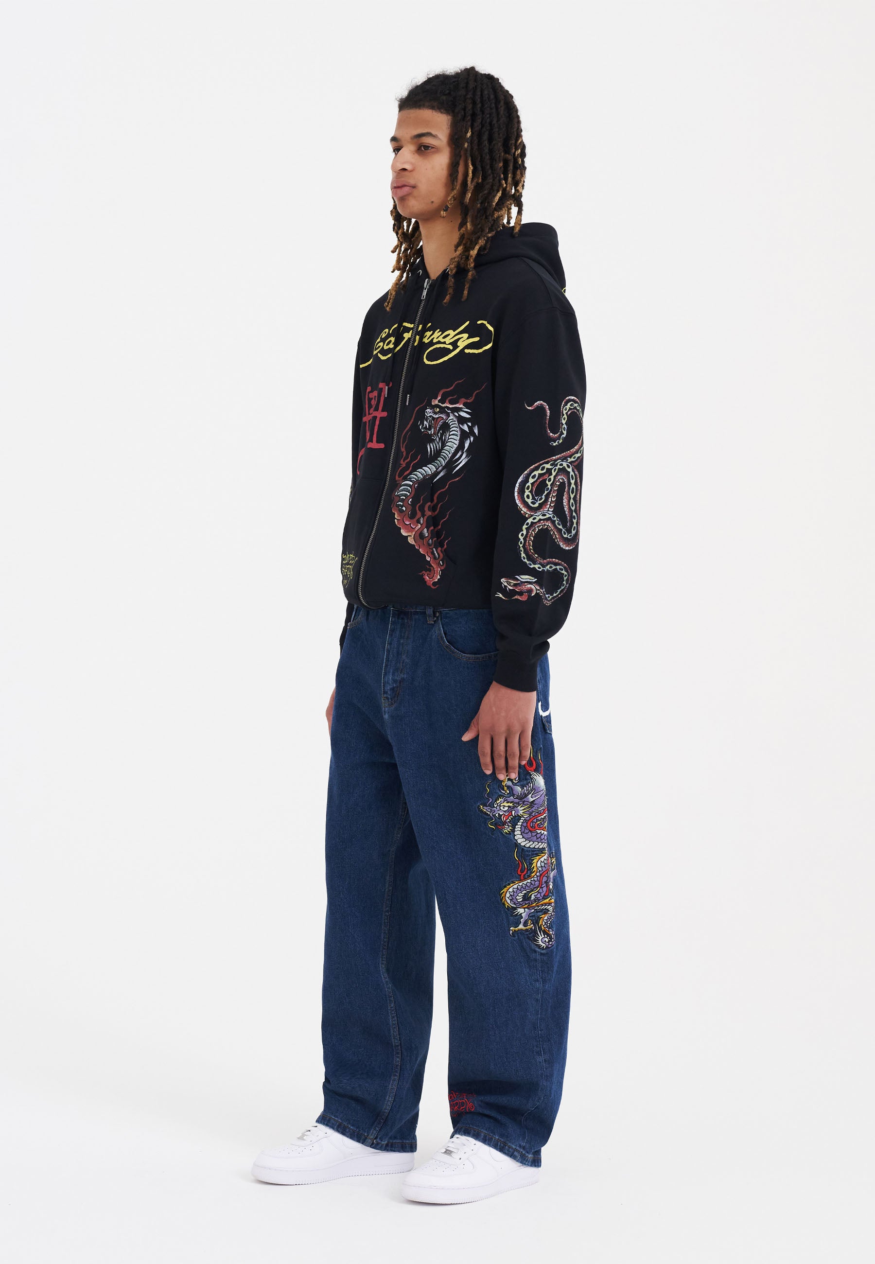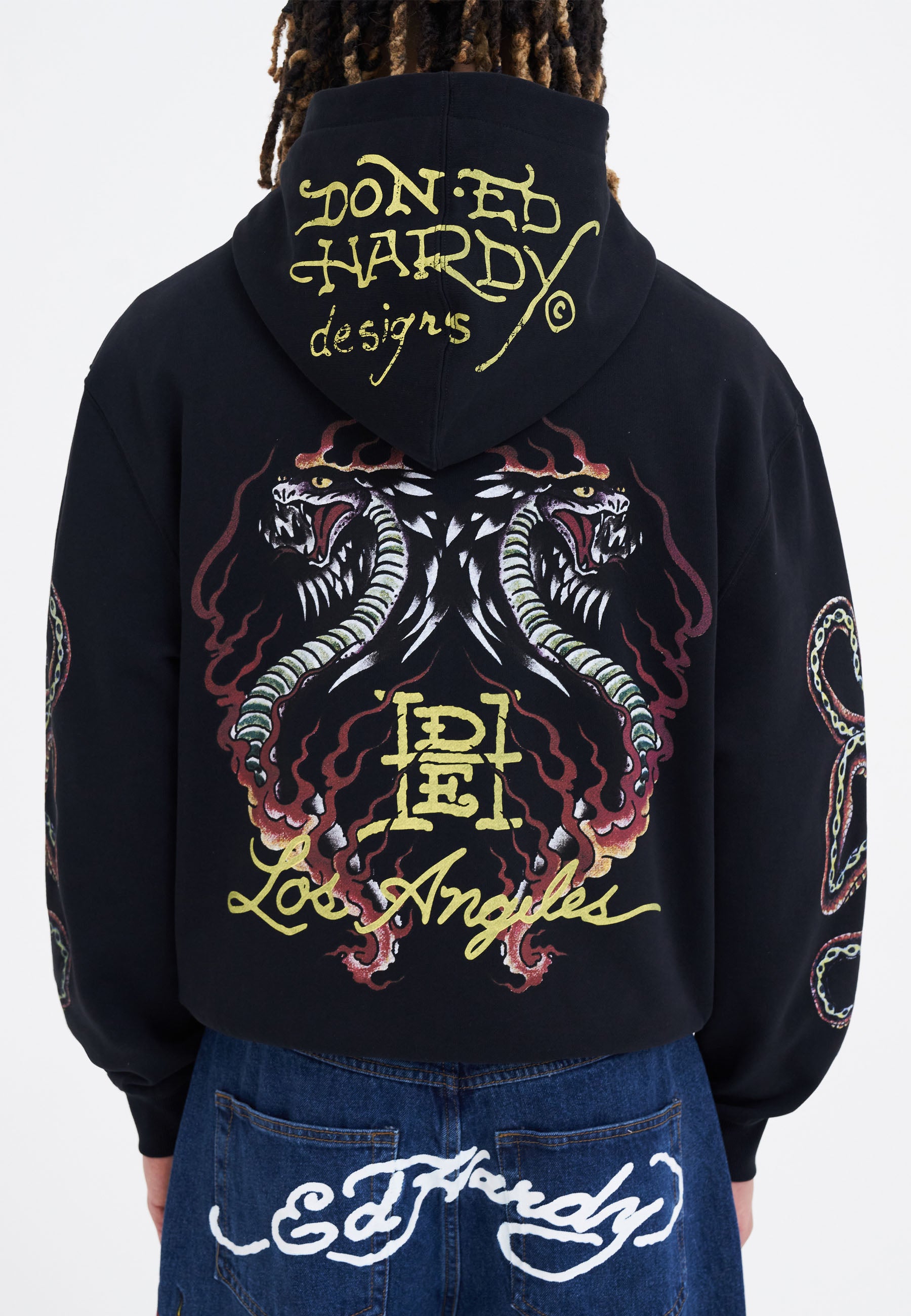Showcasing Ed Hardy’s bright yellow signatures on the hood, across the chest, and at the back, this black, zipped hoodie shouts Ed Hardy from every angle. It also features “DEH” initials in red on its right breast. Yet, the intense, blazing, double cobra design printed on the back and the twisted snake graphic on both sleeves are the true focal points of this garment.100%Cotton Terry 320GSM.