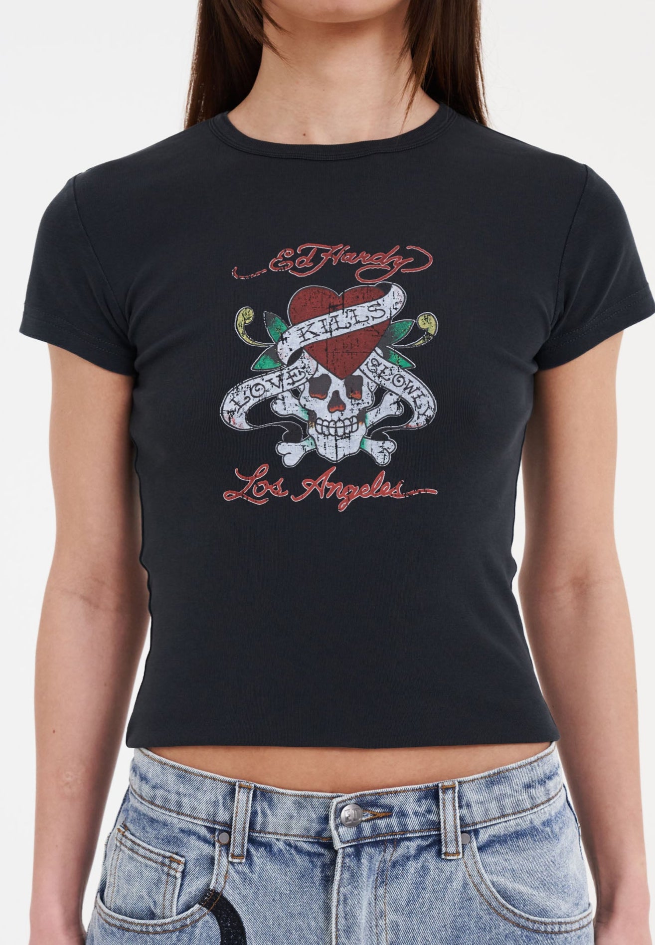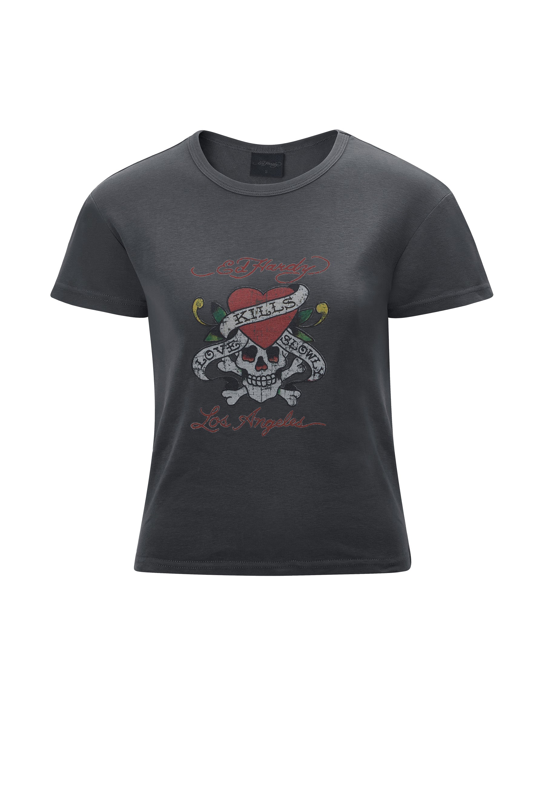 The Love-Kills Slowly Baby Tee features one of Ed Hardy's much-adored original tattoo illustrations from The Archive, in full-colour distressed print, framed with his signature and script.