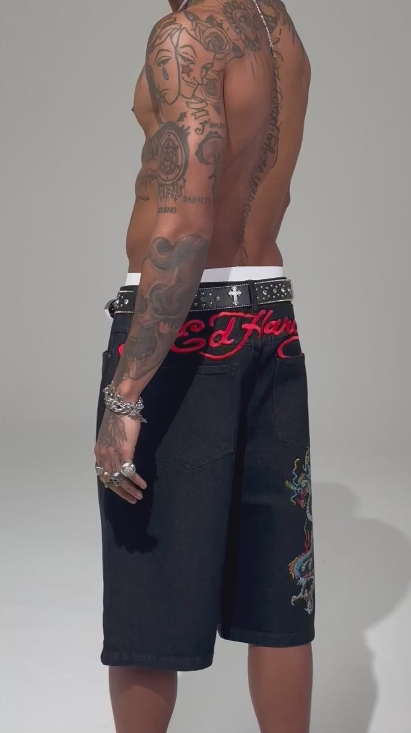 The vivid, embroidered battle dragon tattoo design to the back left leg of these denim shorts truly stands out against their darker colouration, grey wash, and red Ed Hardy logos on the front and upper back of this summer Ed Hardy piece.