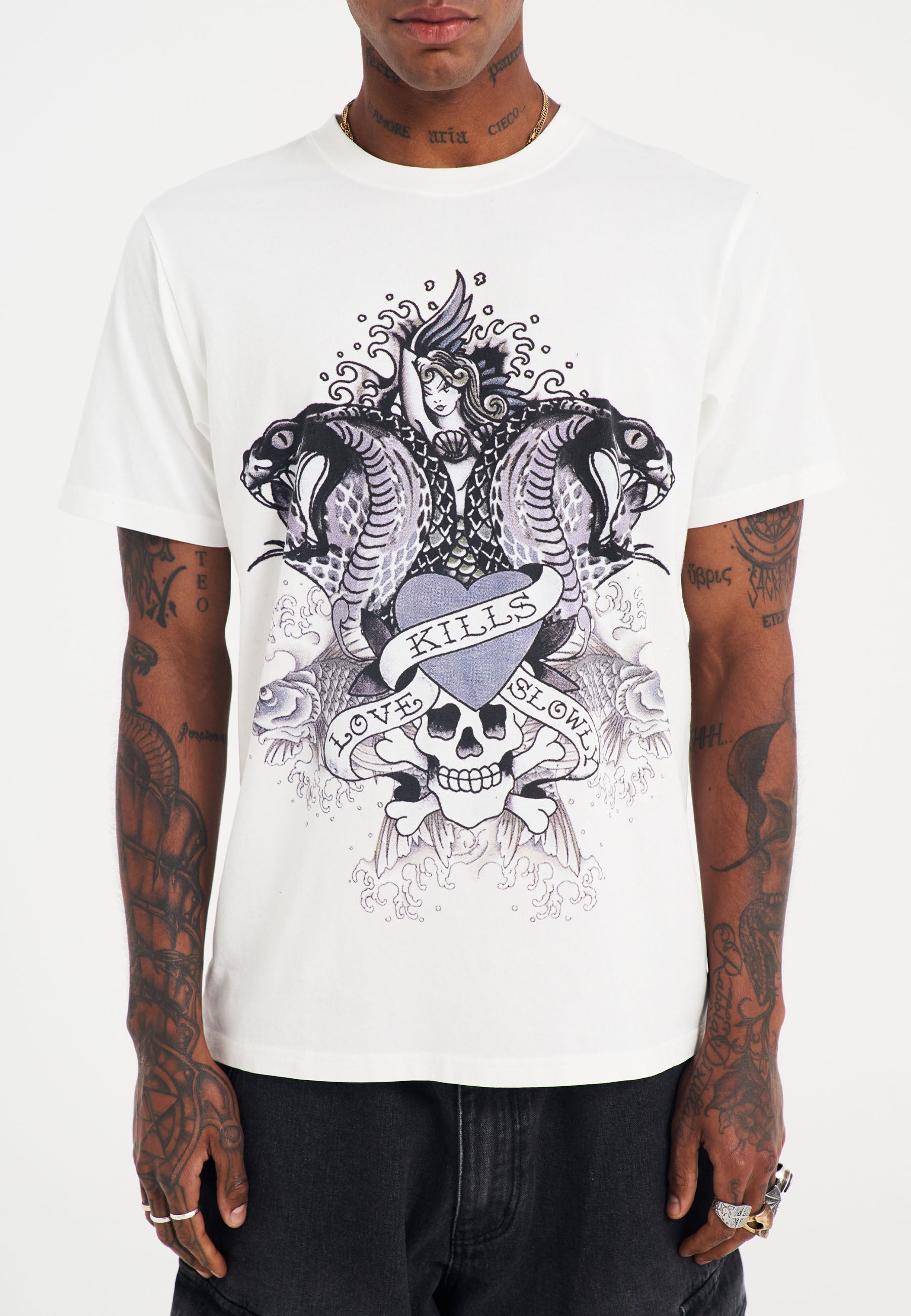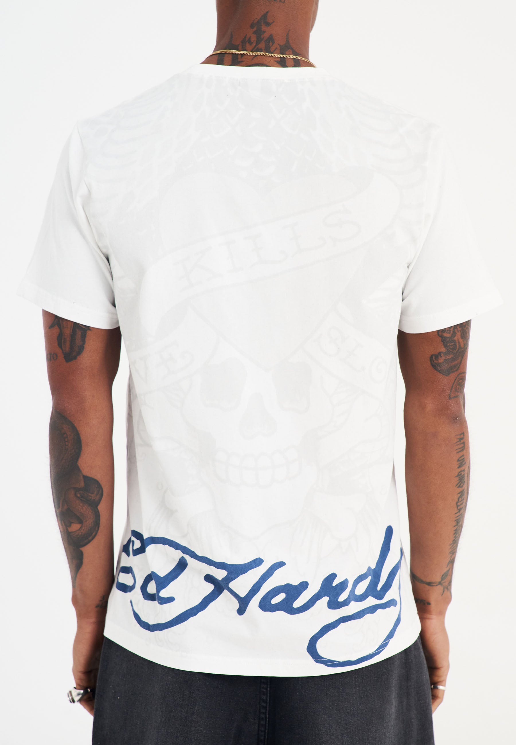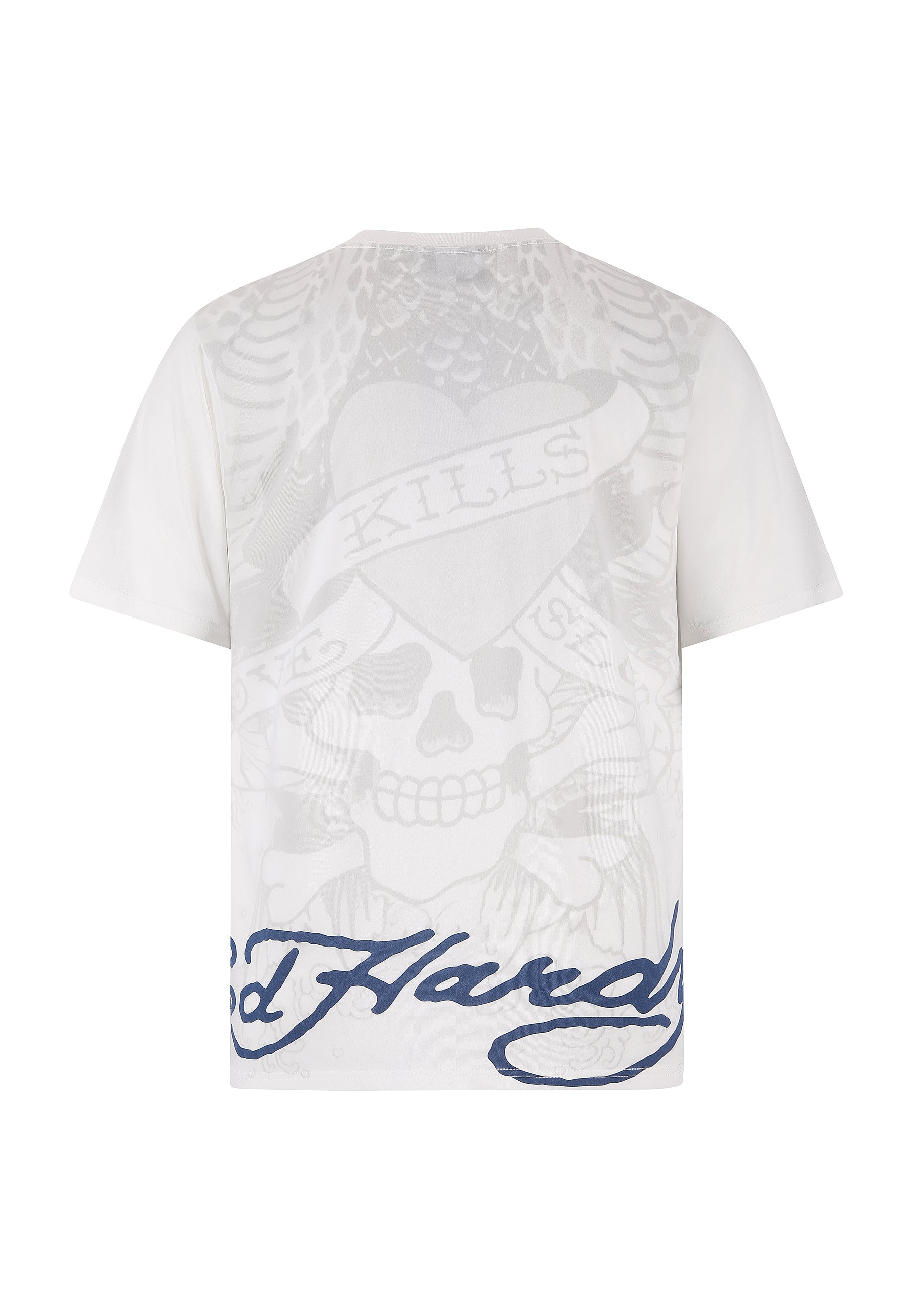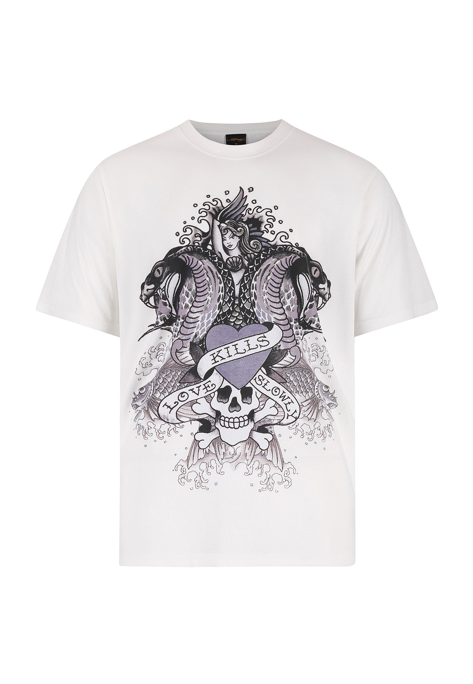 Make a statement with the Men's Cobra Kills Slowly Graphic T-Shirt in white. This regular-fit t-shirt features Ed Hardy’s bold tonal cobra graphic on the front, with a subtle shadow print and signature logo on the back hem.