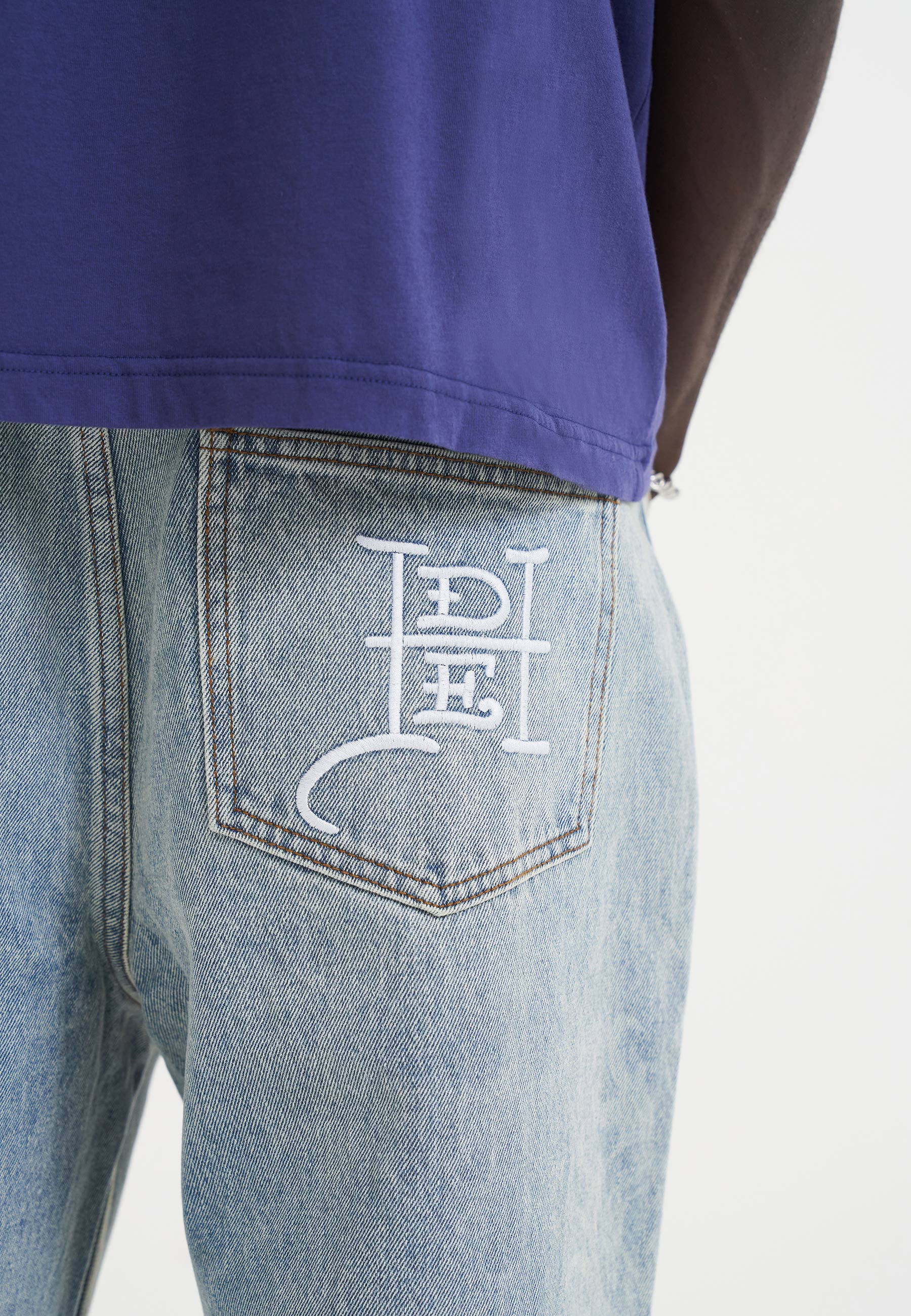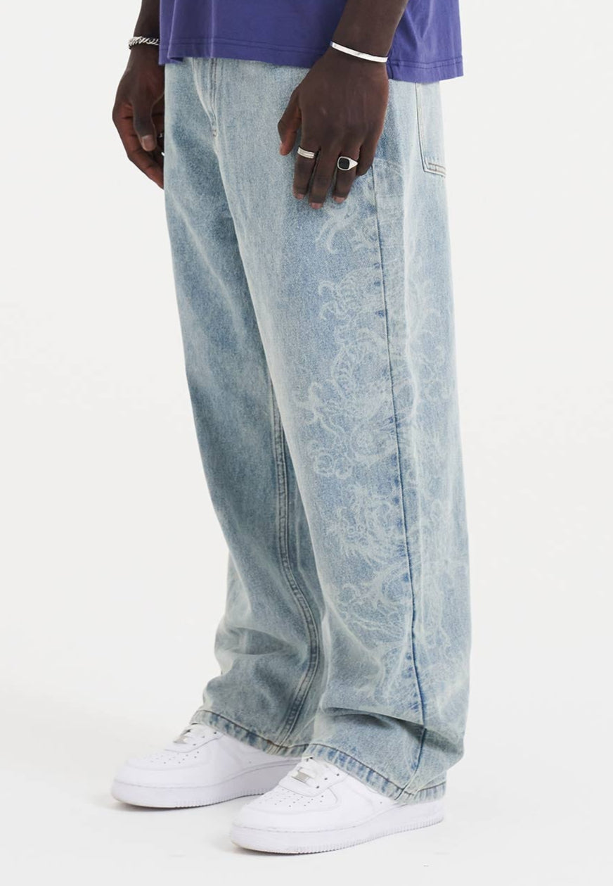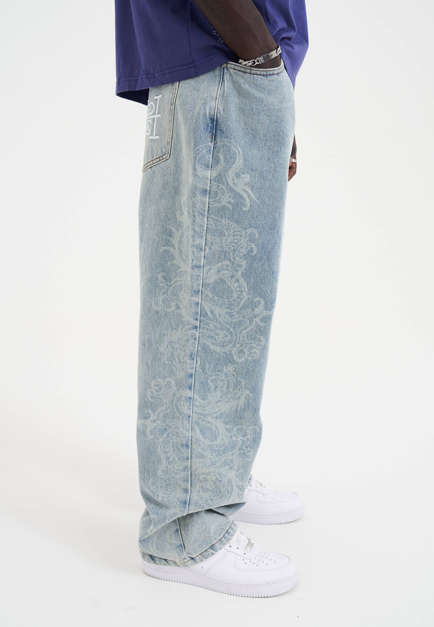 Mens Laser Etched Dragon Repeat Denim Trousers Jeans - Bleach