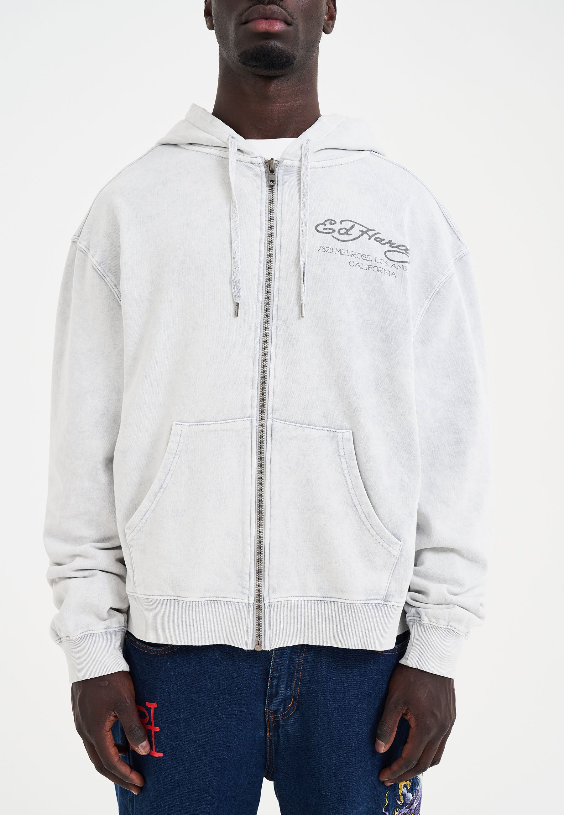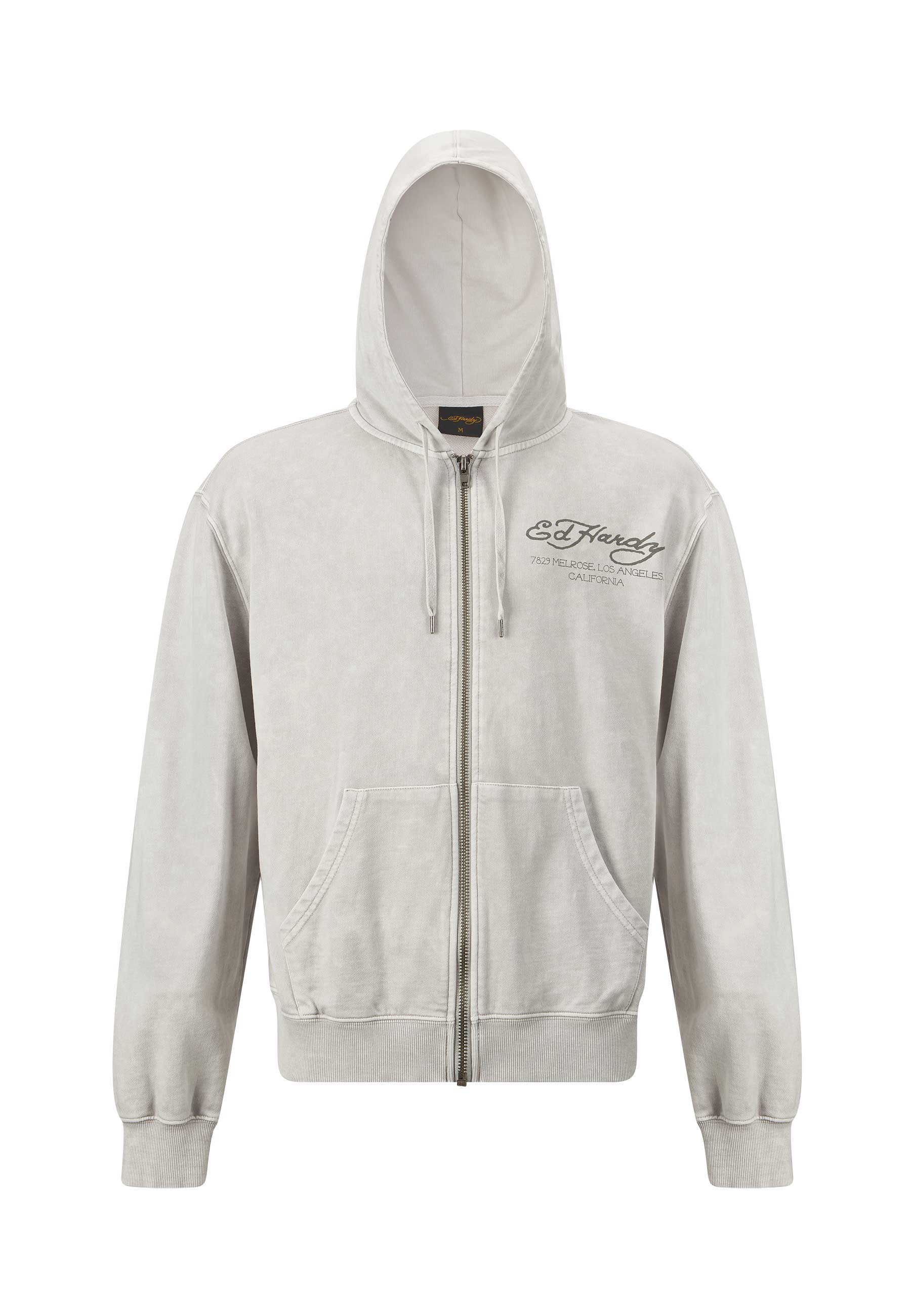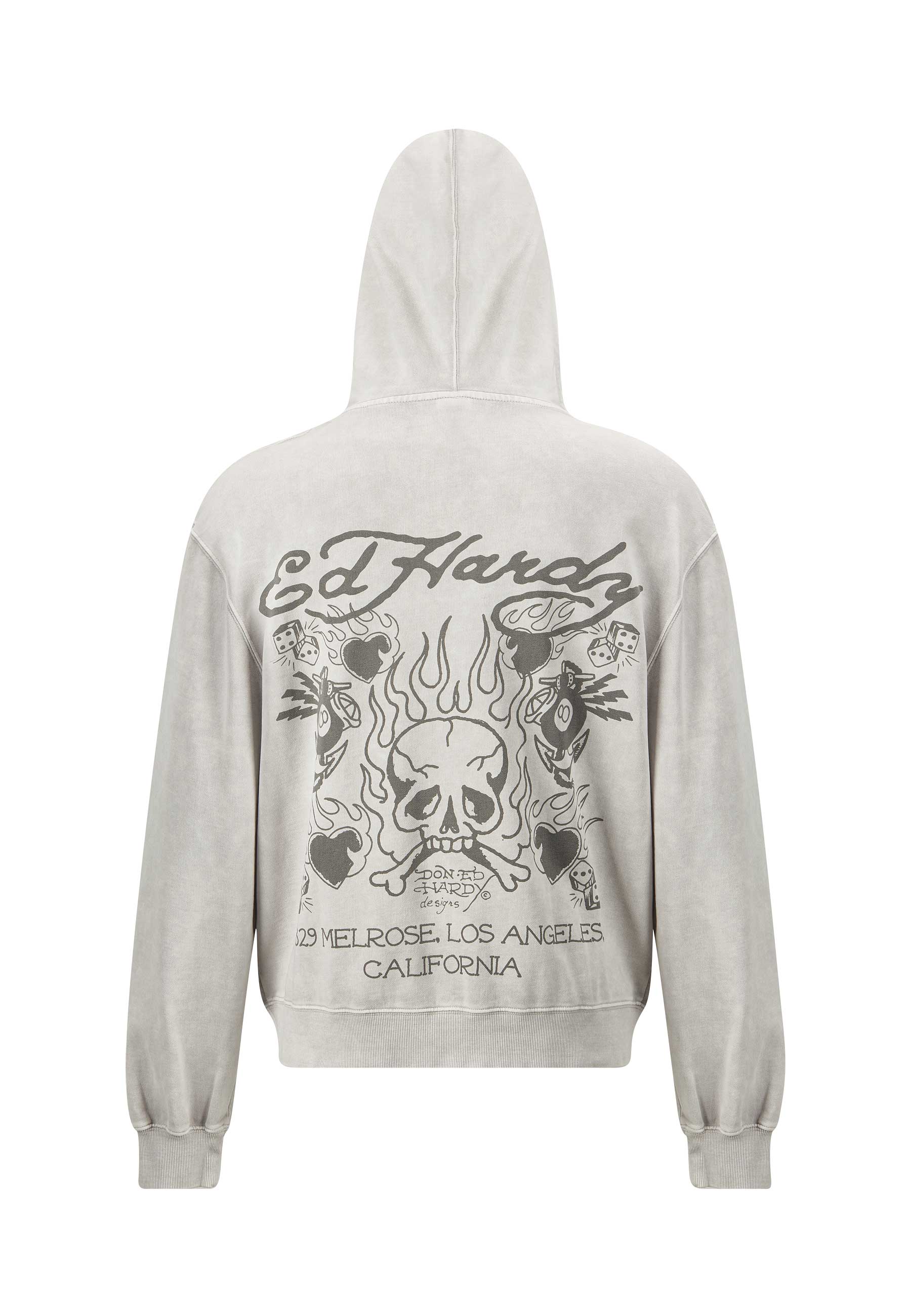 Mens Mono Acid Flaming Skull Zip Through Hoodie - Grey