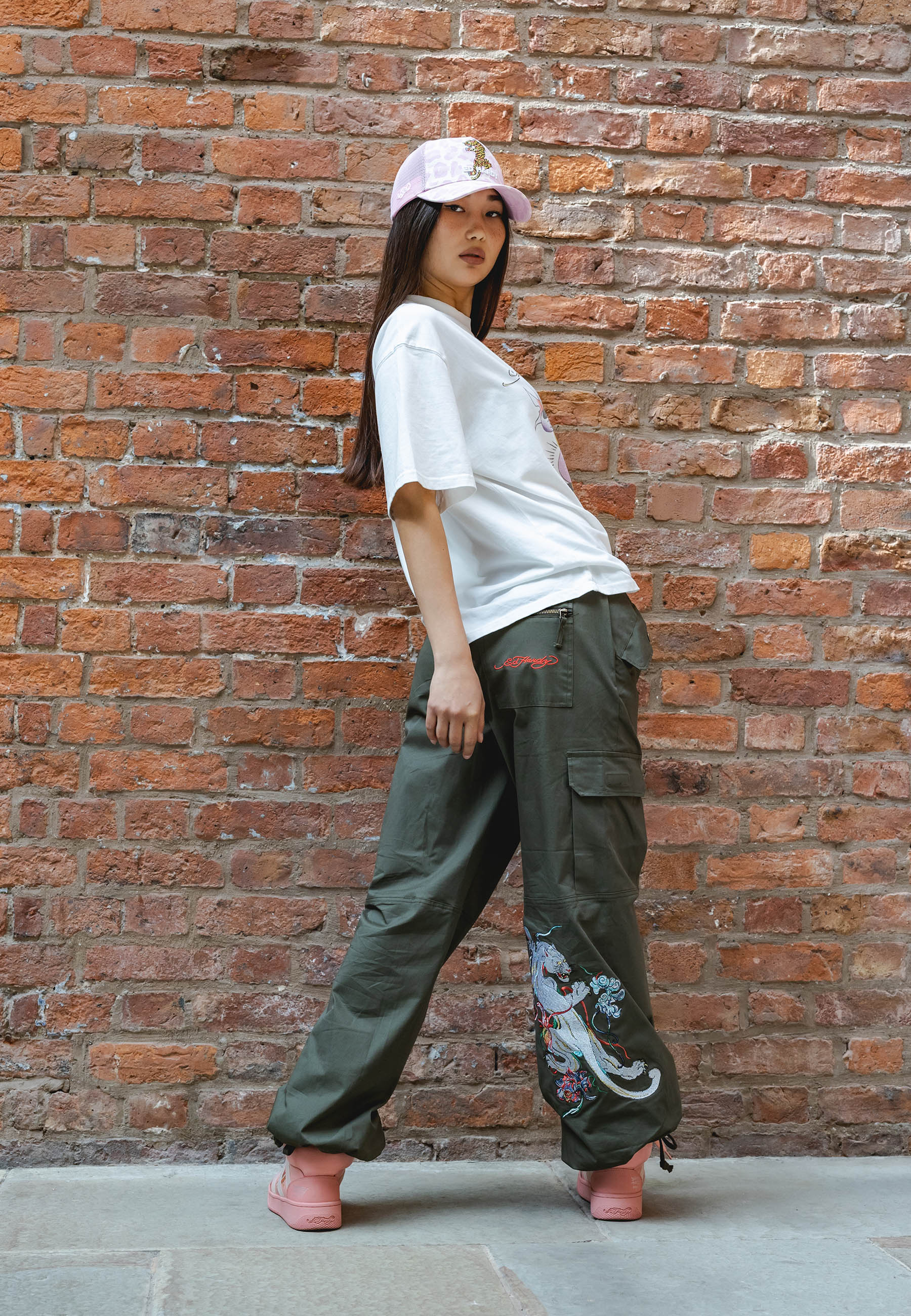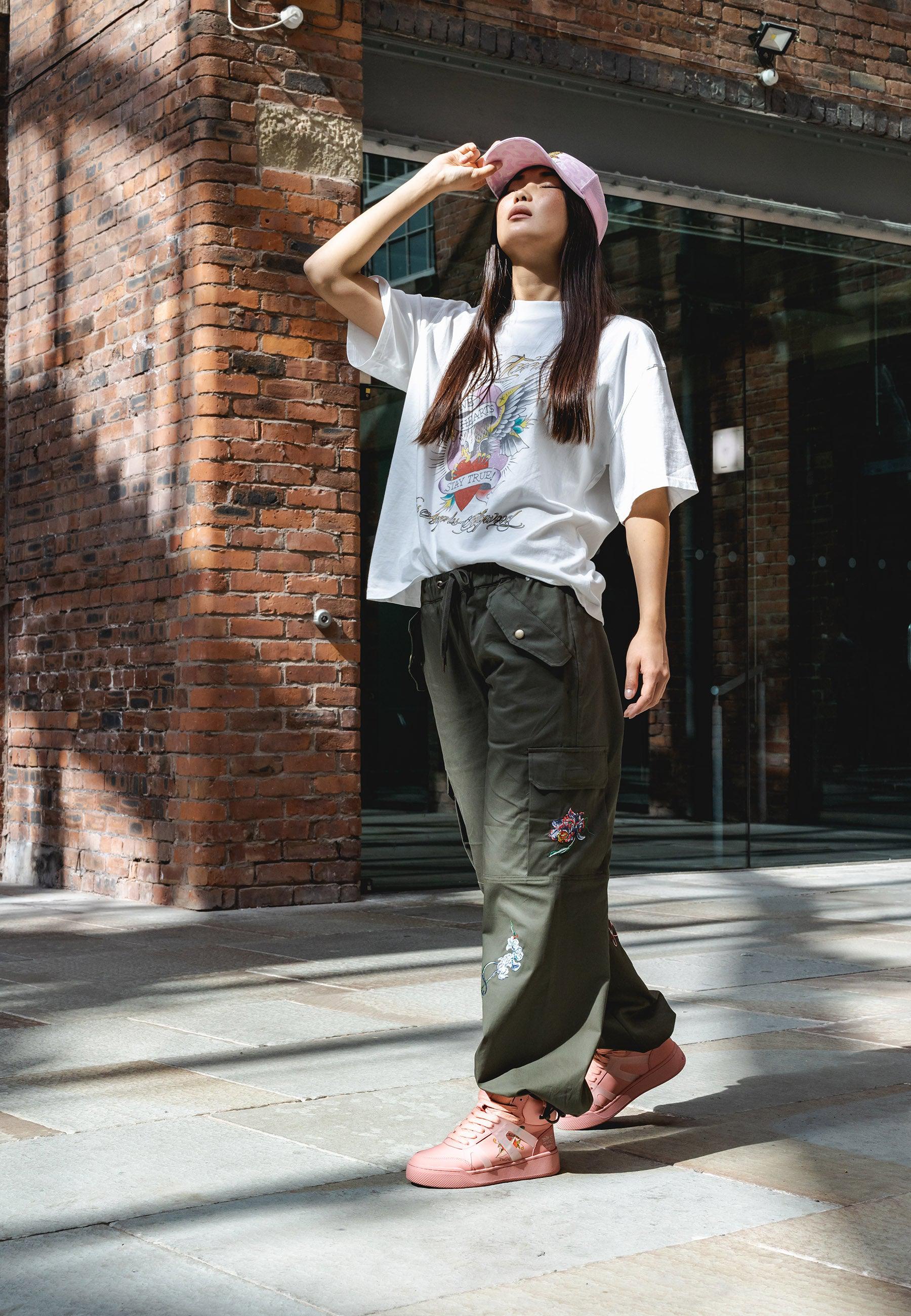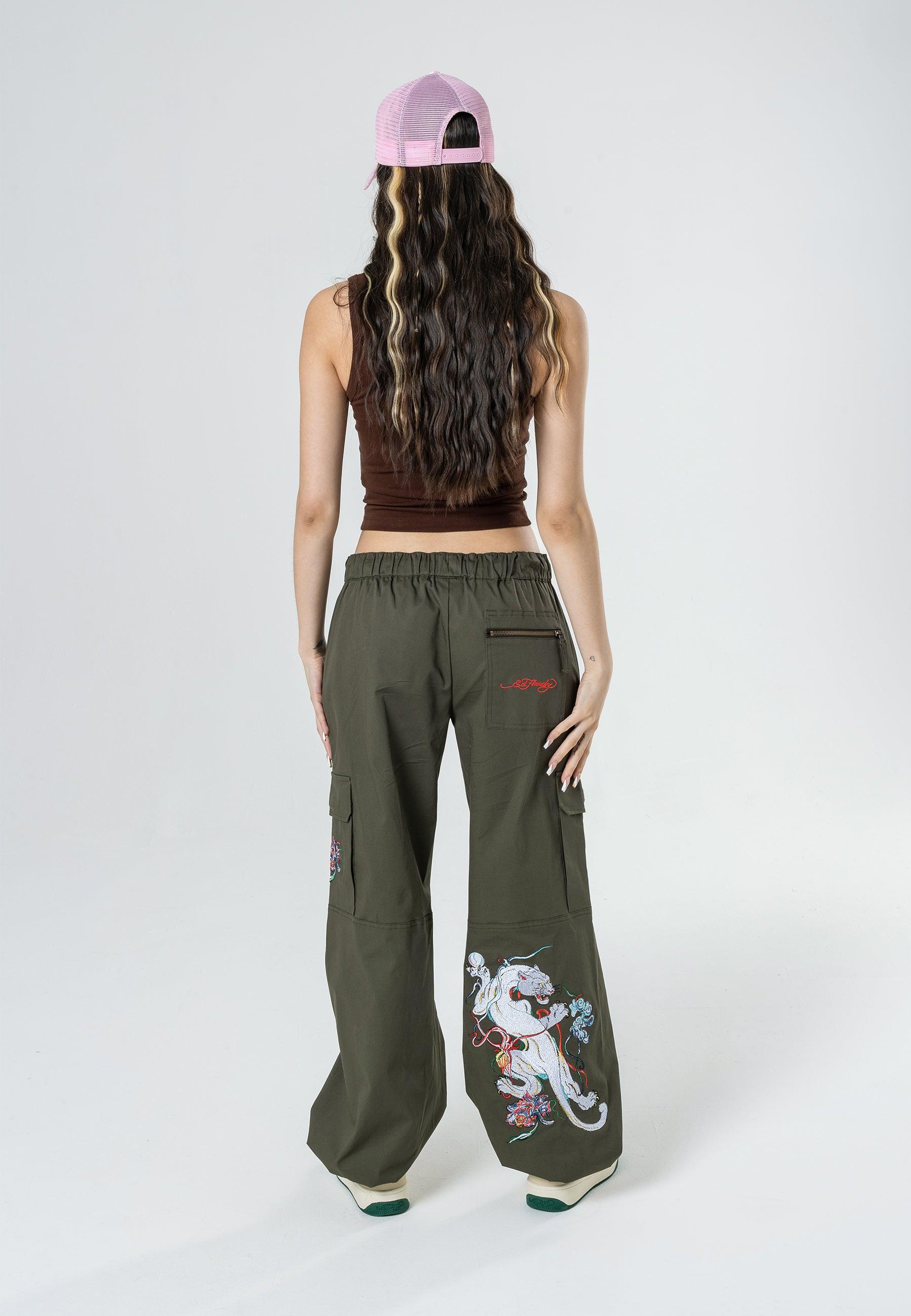 Mystic Panther Cargo Pant-Dusty Olive features the infamous Eds archive of high-definition embroidered Panther at the lower back right leg that come round to the front, as well as the embroidered Ed Hardy logo on the back zip pocket and floral embroidery on left pocket. These comfy cargos are perfect for chill, day and night vibes.