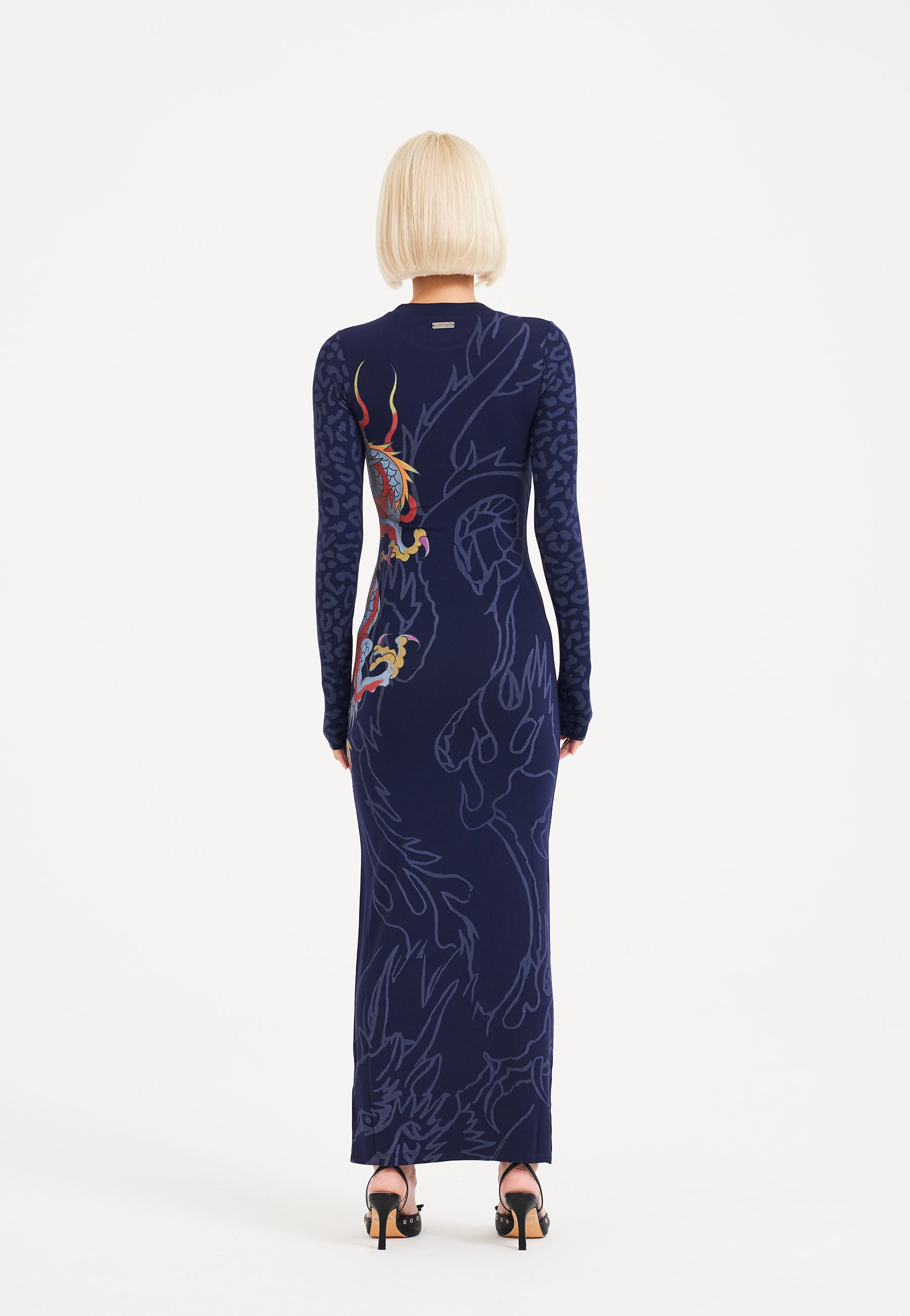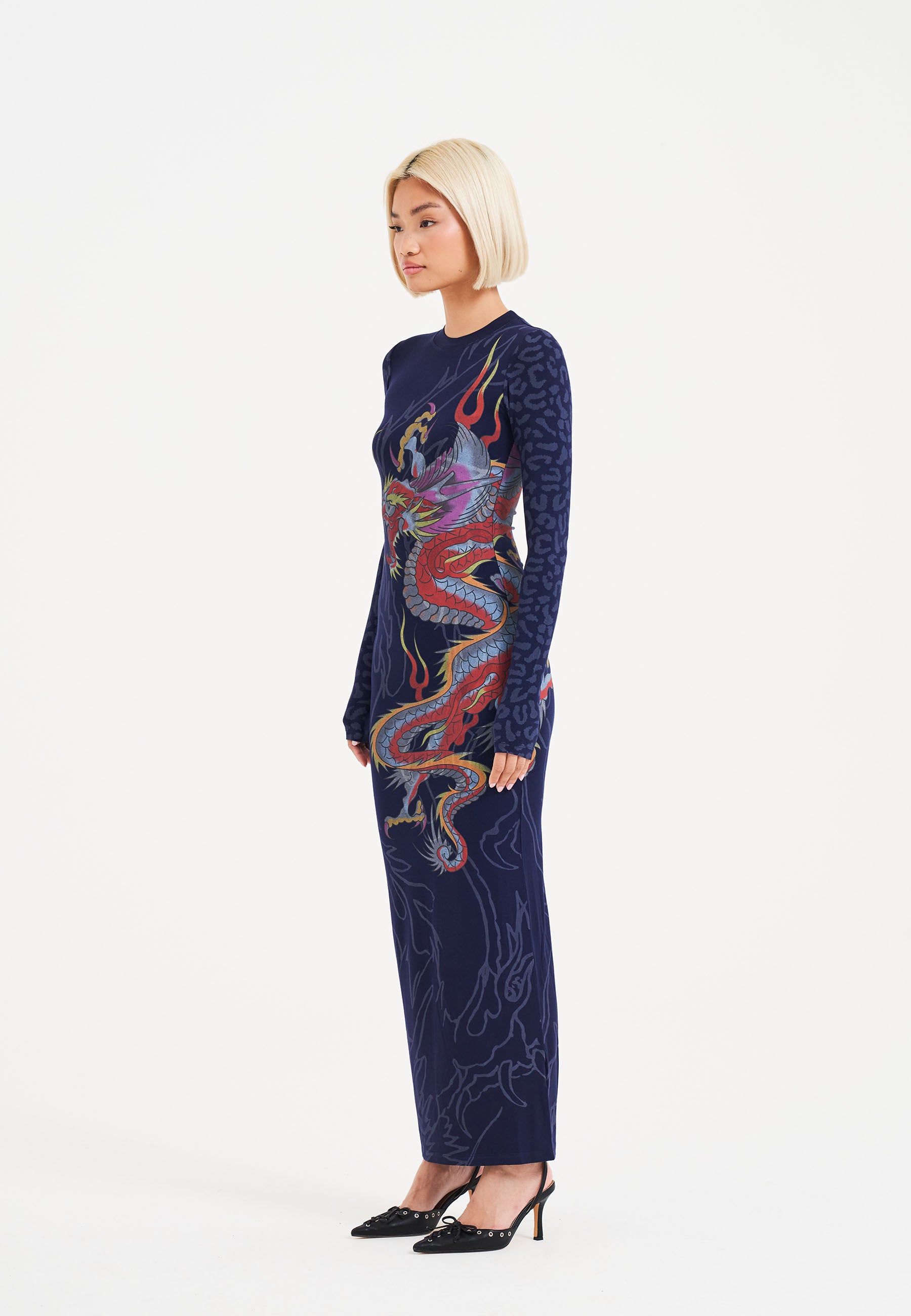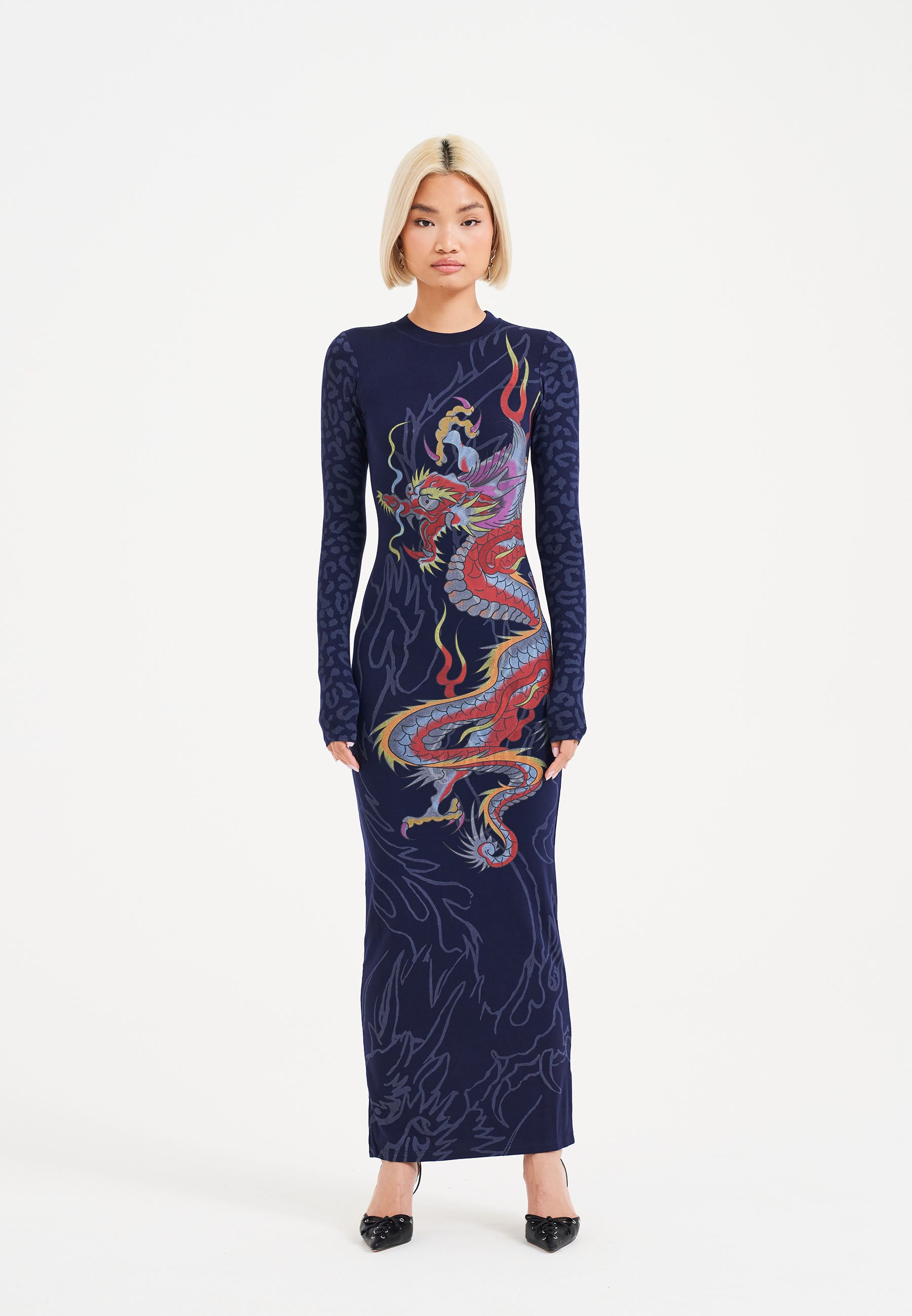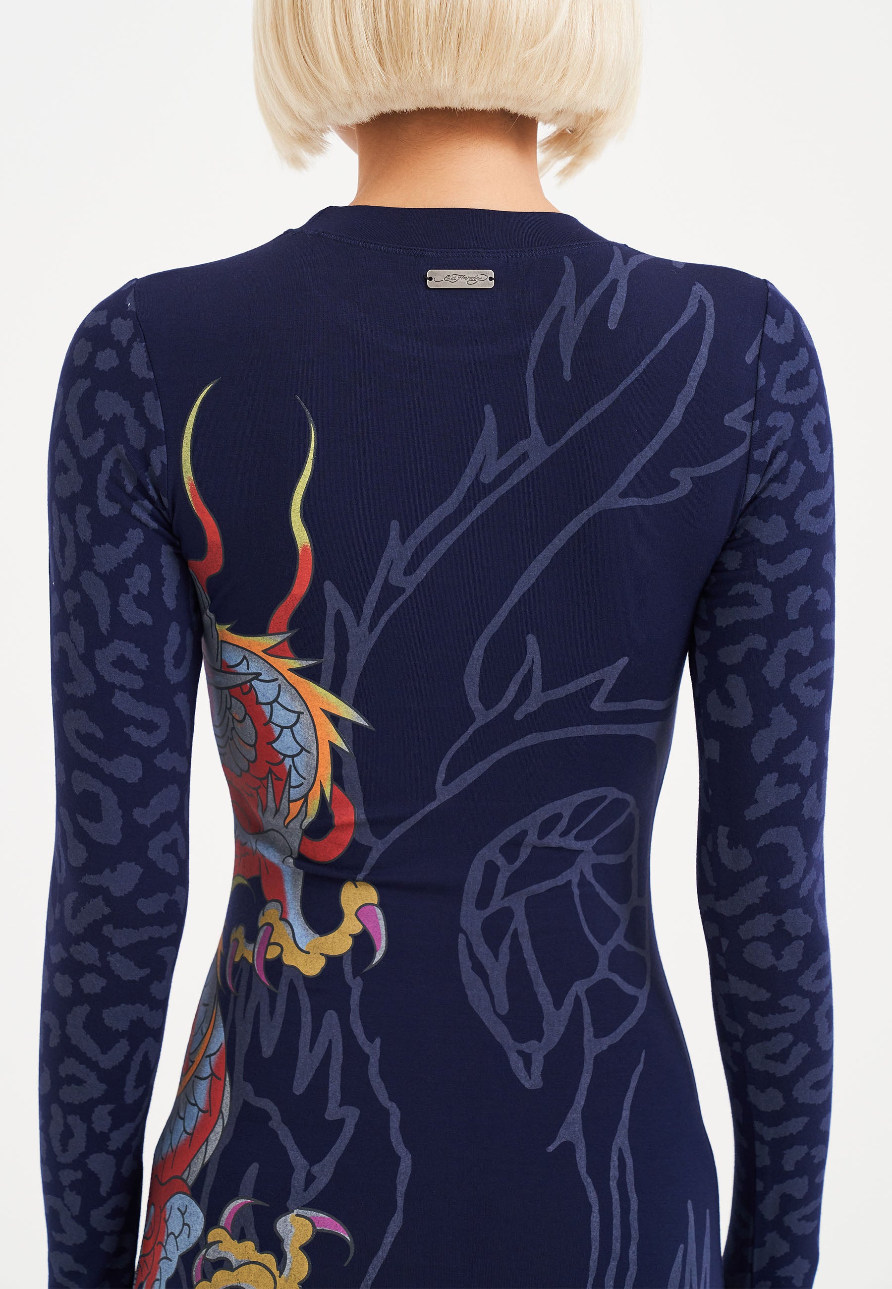 Womens Dragon Flame Long Sleeve Dress - Mood Indigo