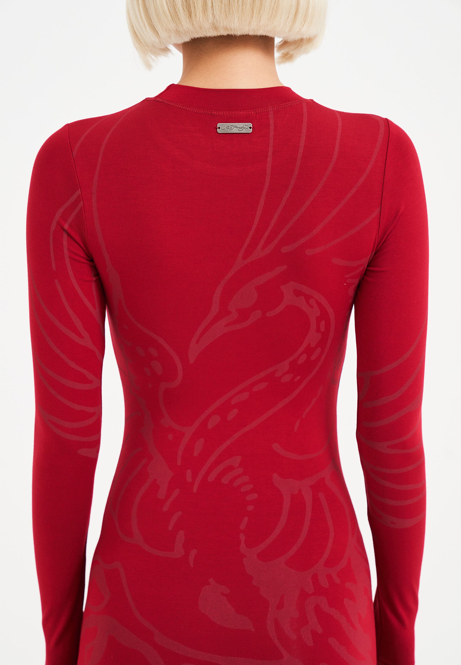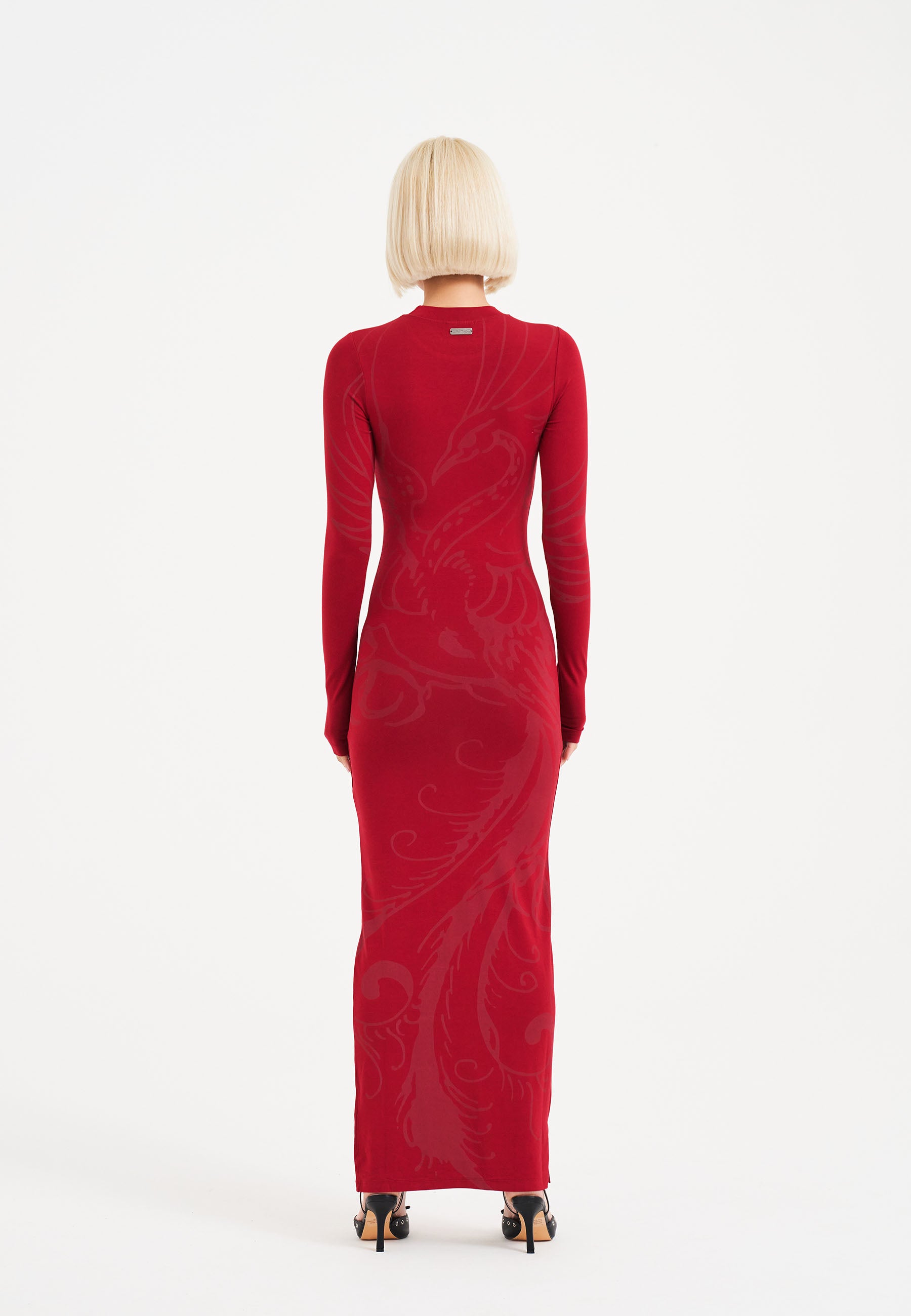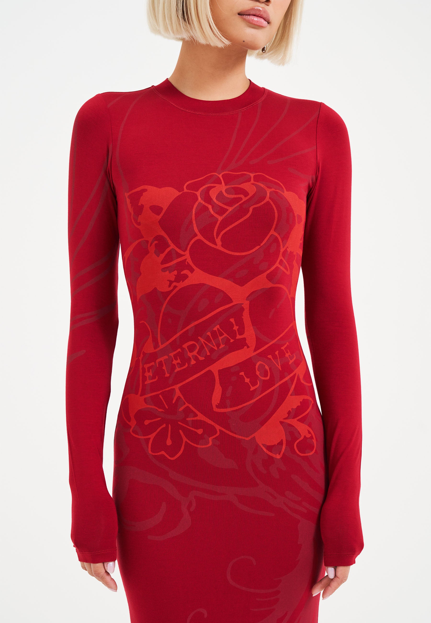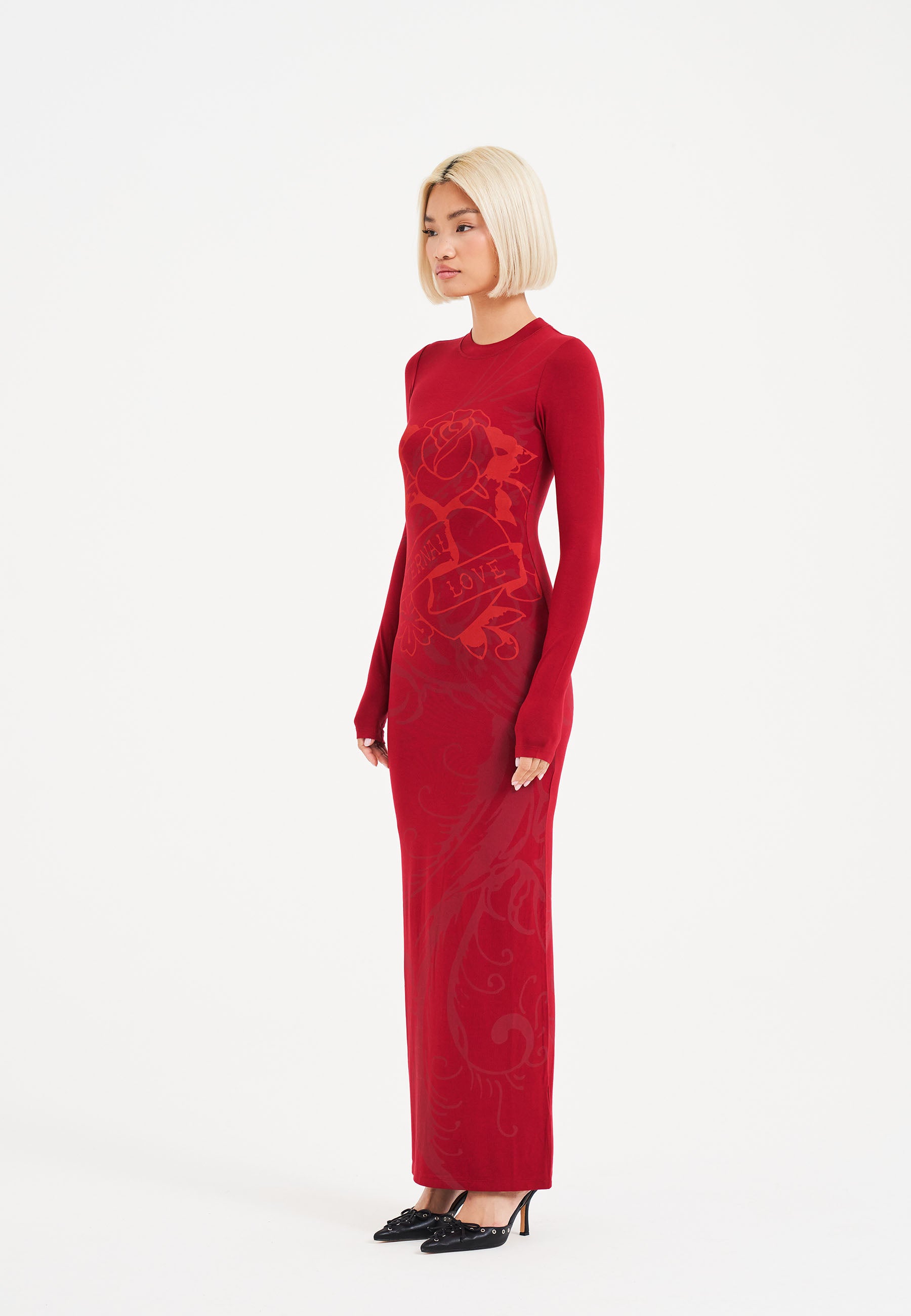 The Eternal Love Long Maxi Dress layers art, from tonal shadow graphics to a striking crimson contrast piece to the front and back. Subtlety isn't Ed's style, and it isn't yours, either.