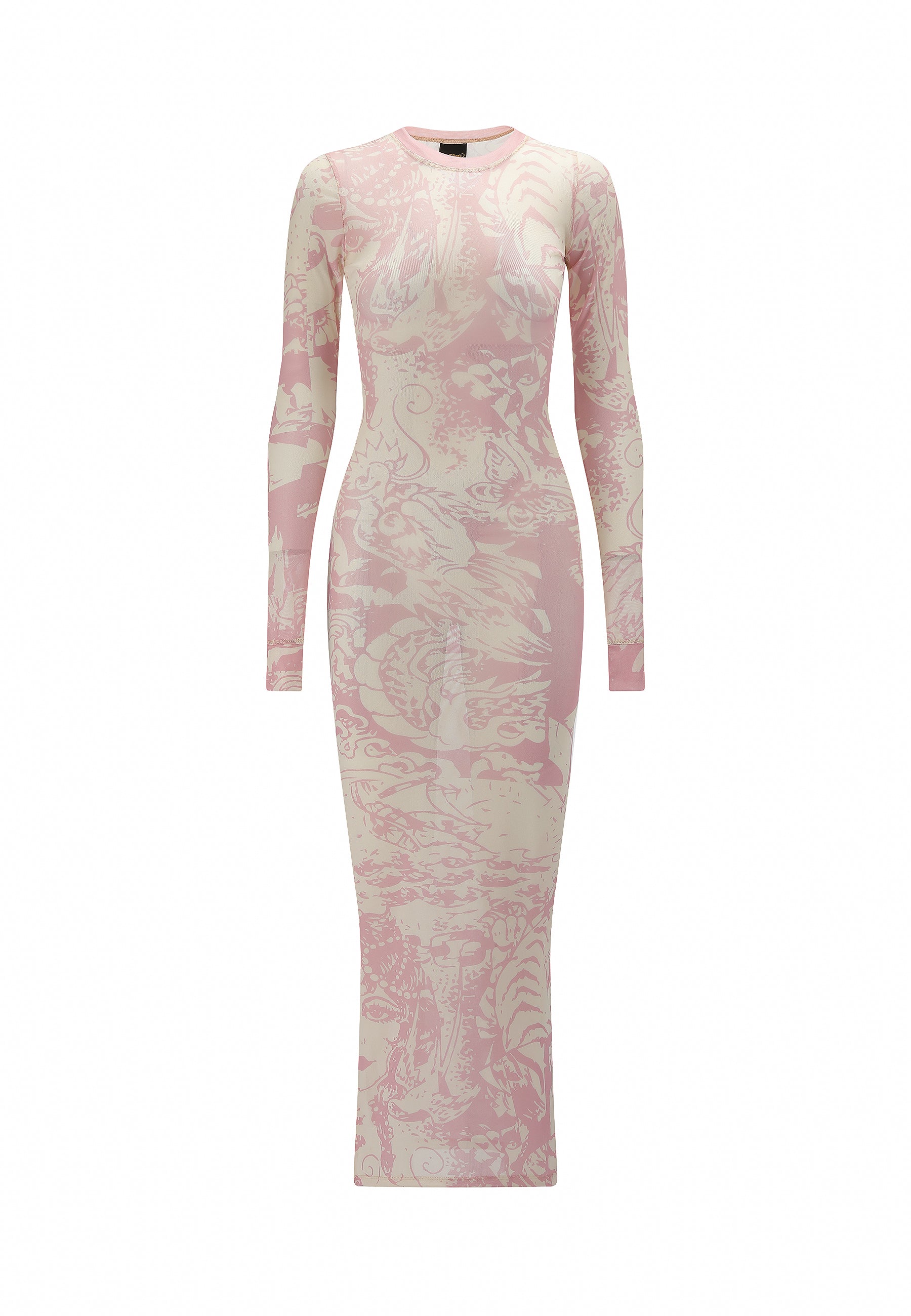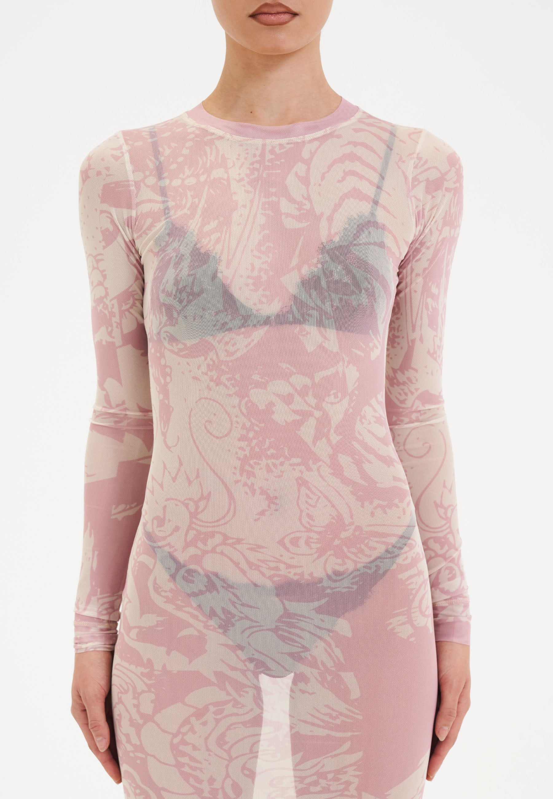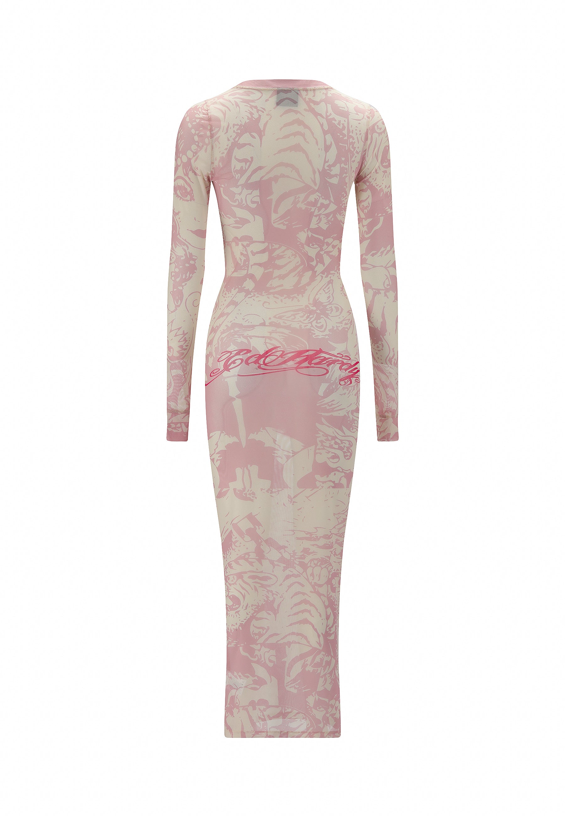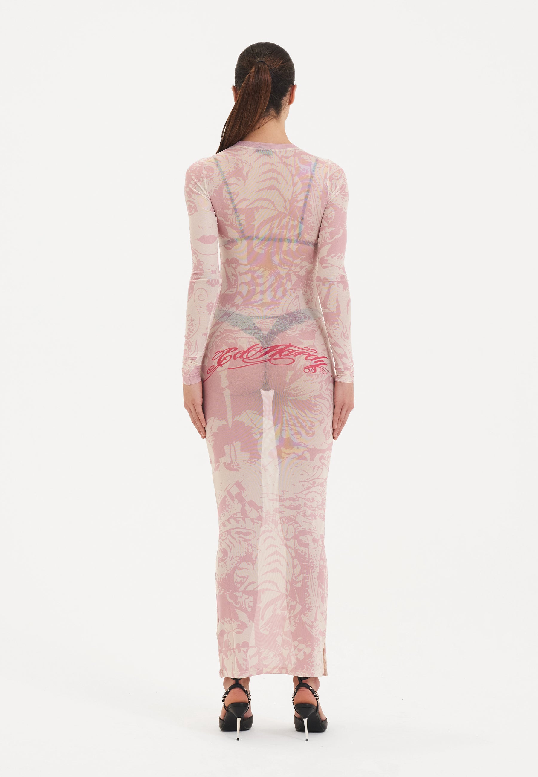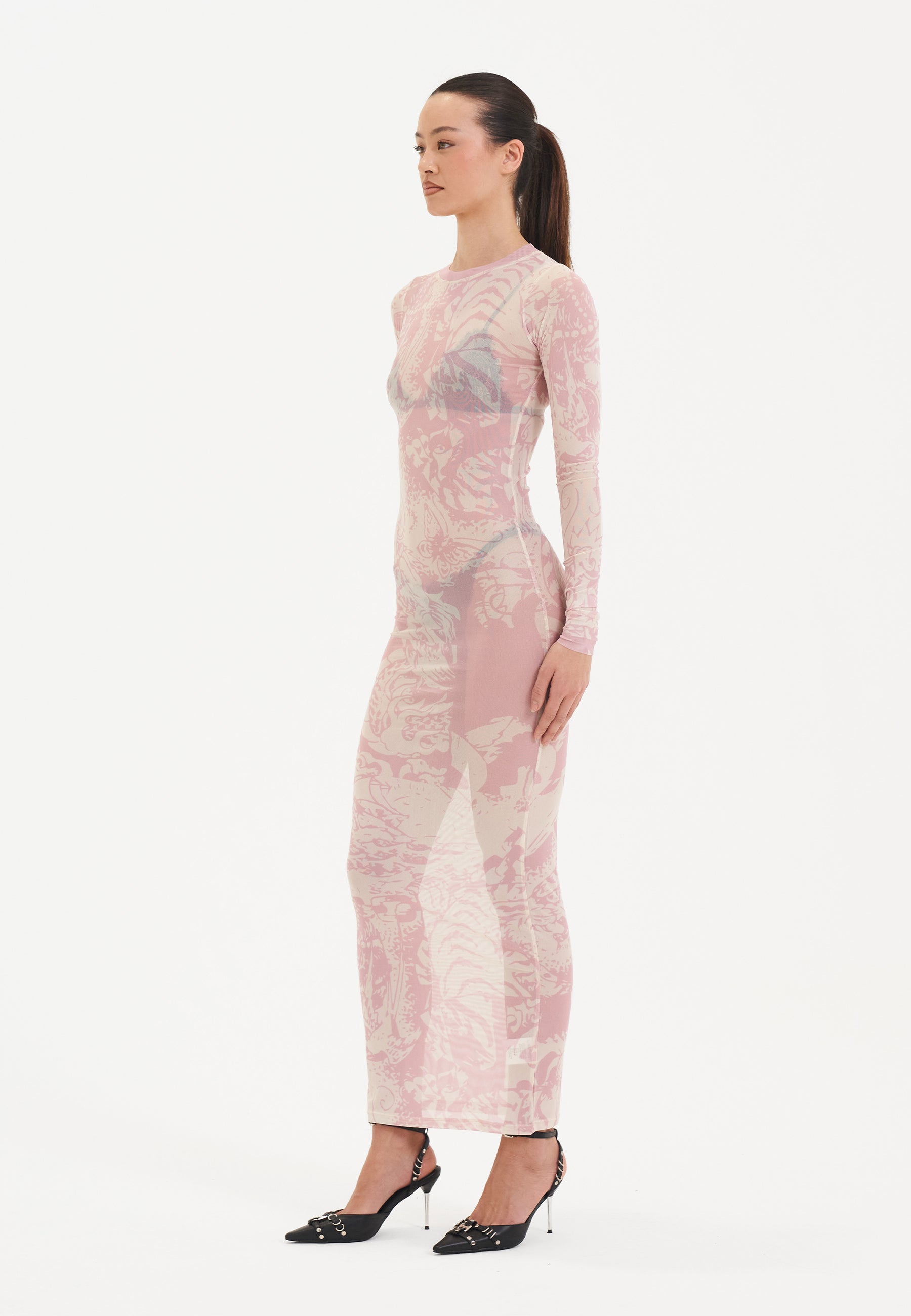 Womens Flash Sheet Mesh Long Sleeve Maxi Dress - Pink