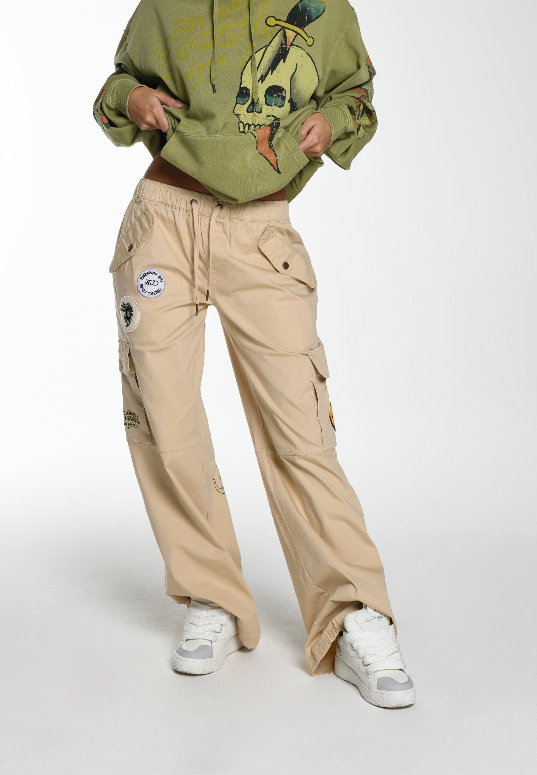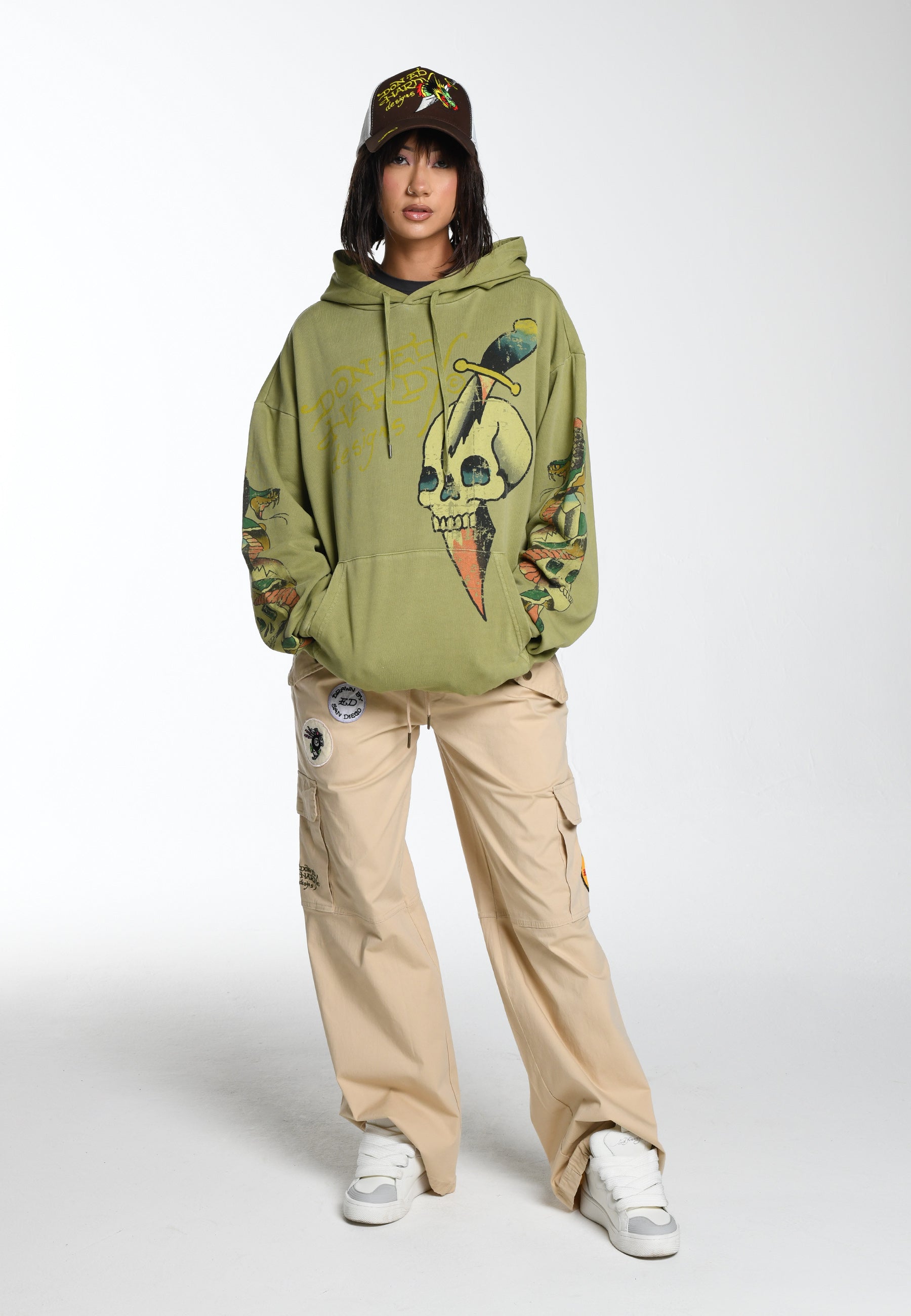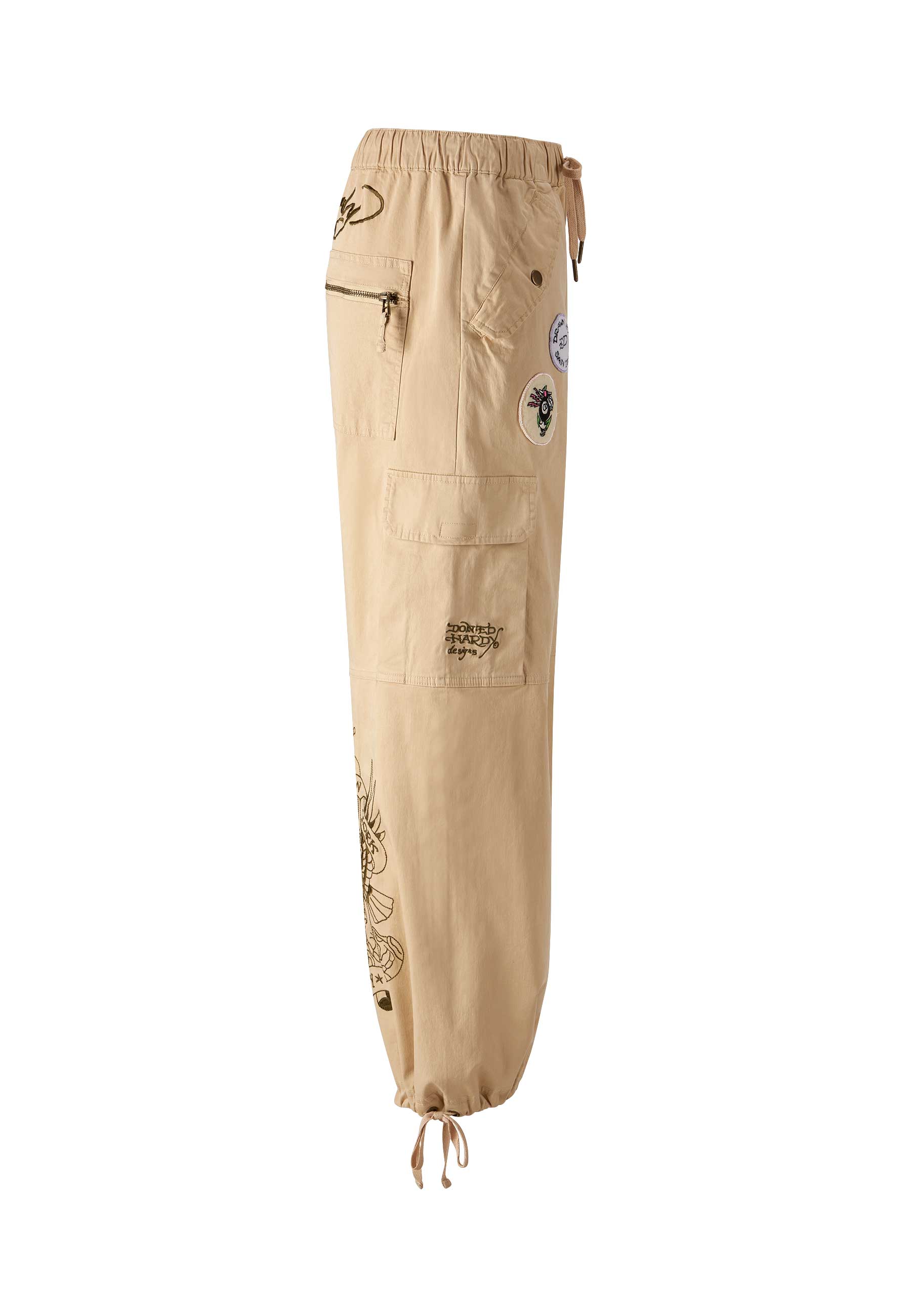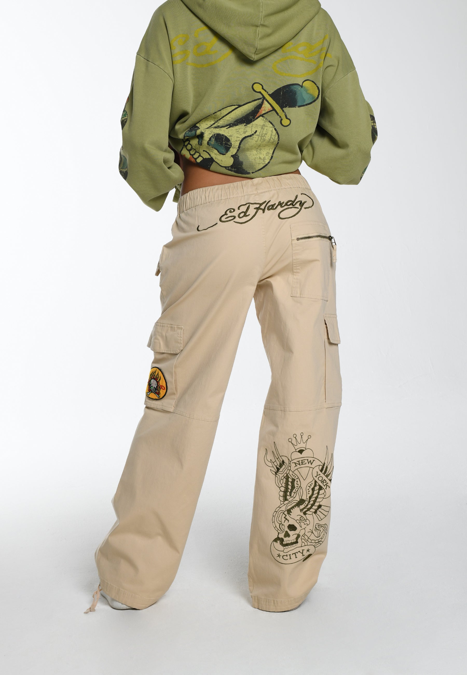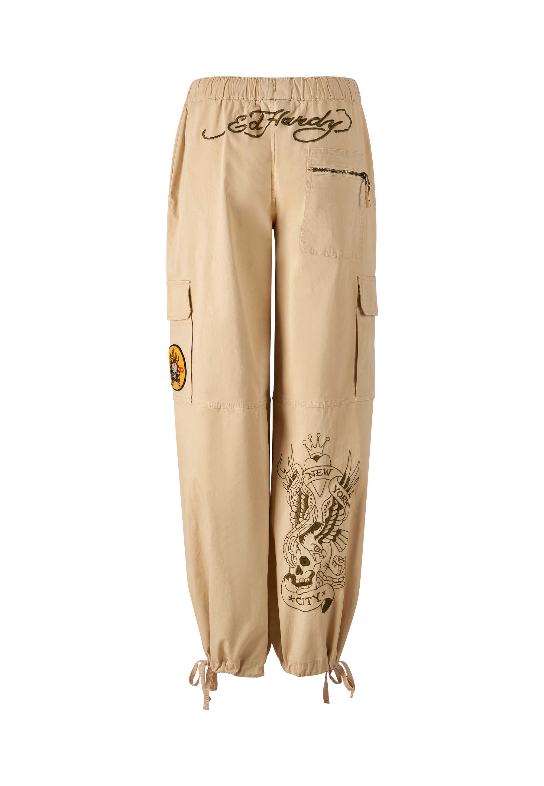 The garment features stunning tonal embroidery and applique badges of Ed's iconic tattoo designs, set against the cotton camouflage to effortlessly blend fashion and art.