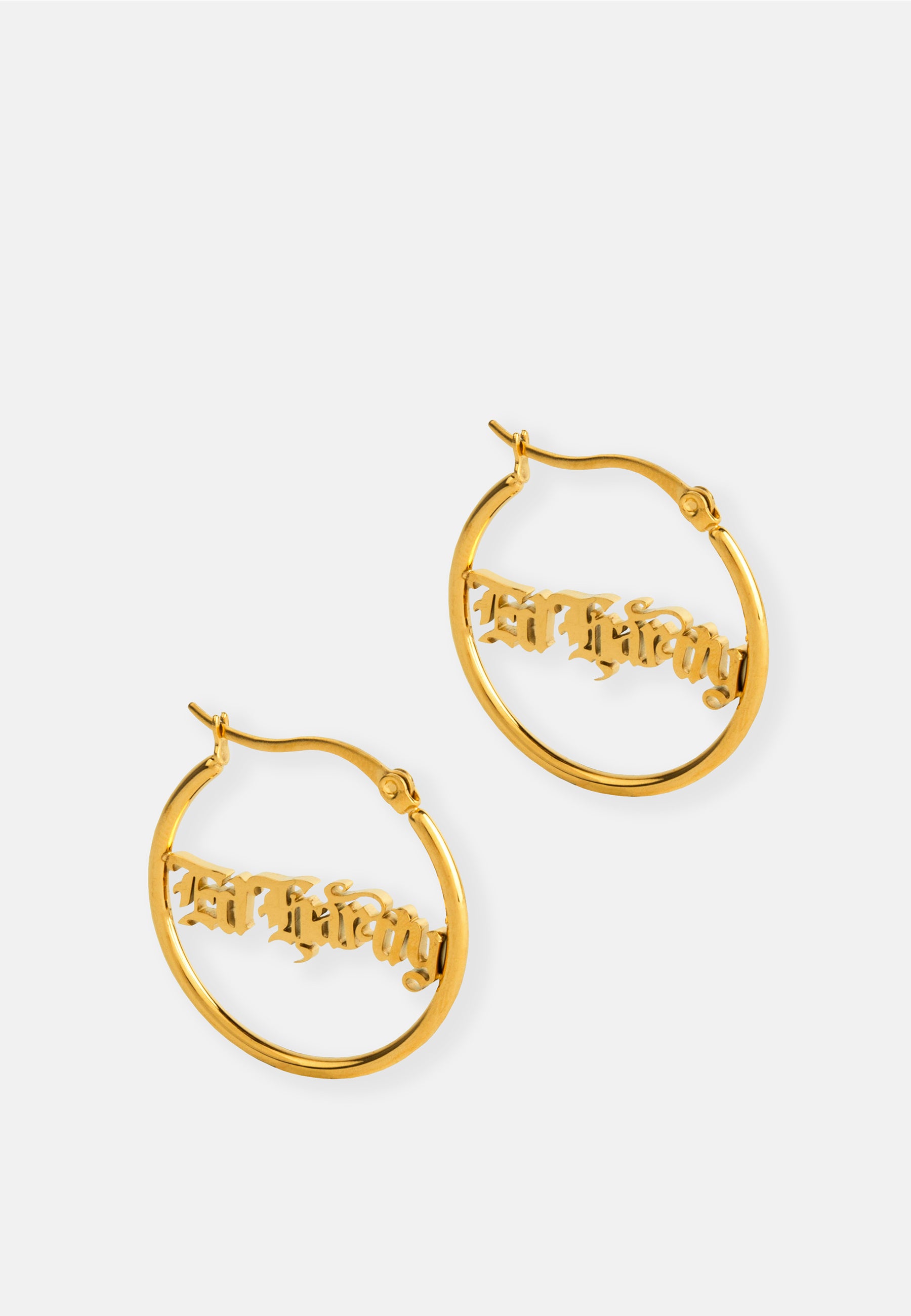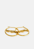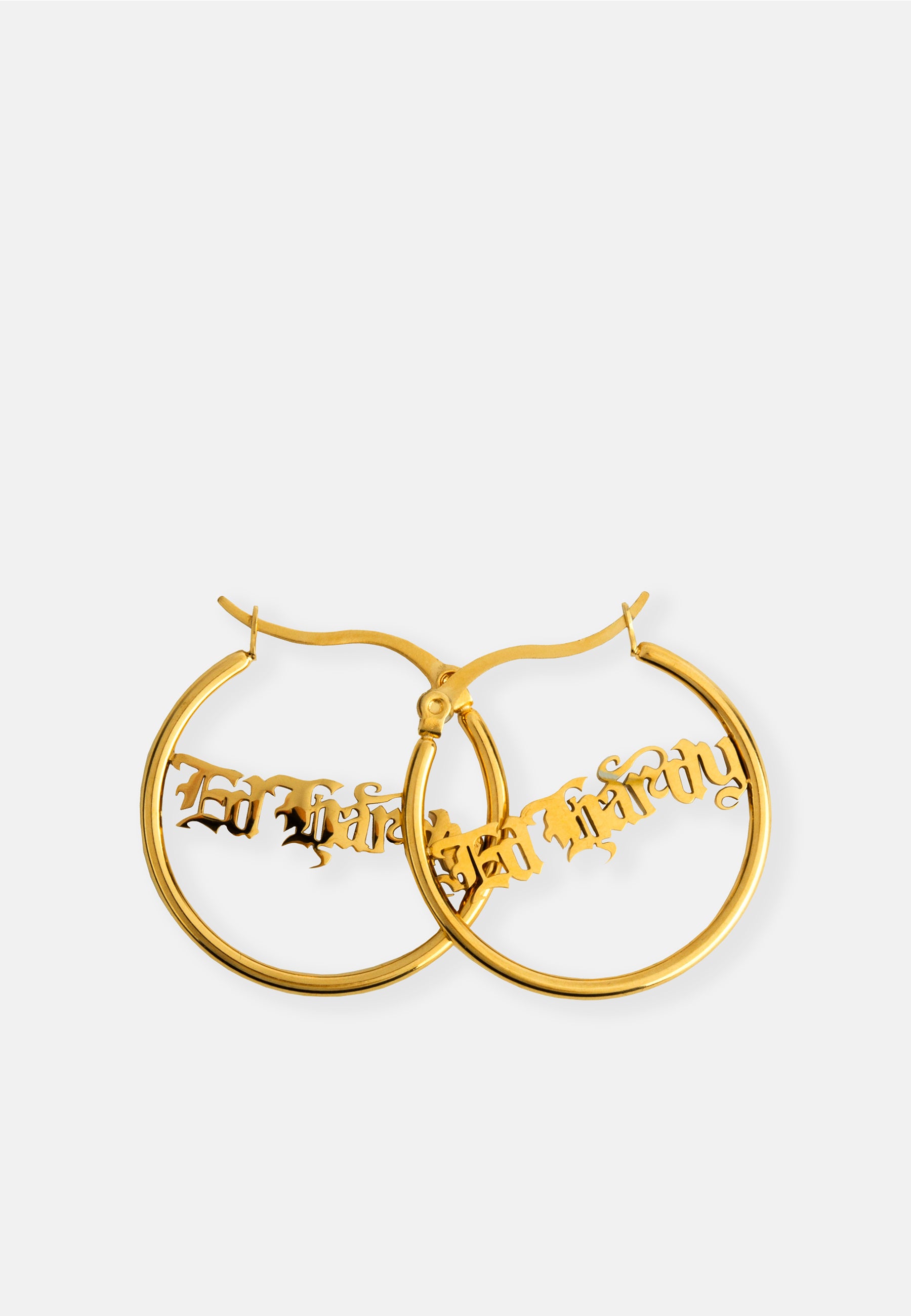 Stainless steel 30mm hoop earring with custom cast gothic ED HARDY logo in a gold finish.