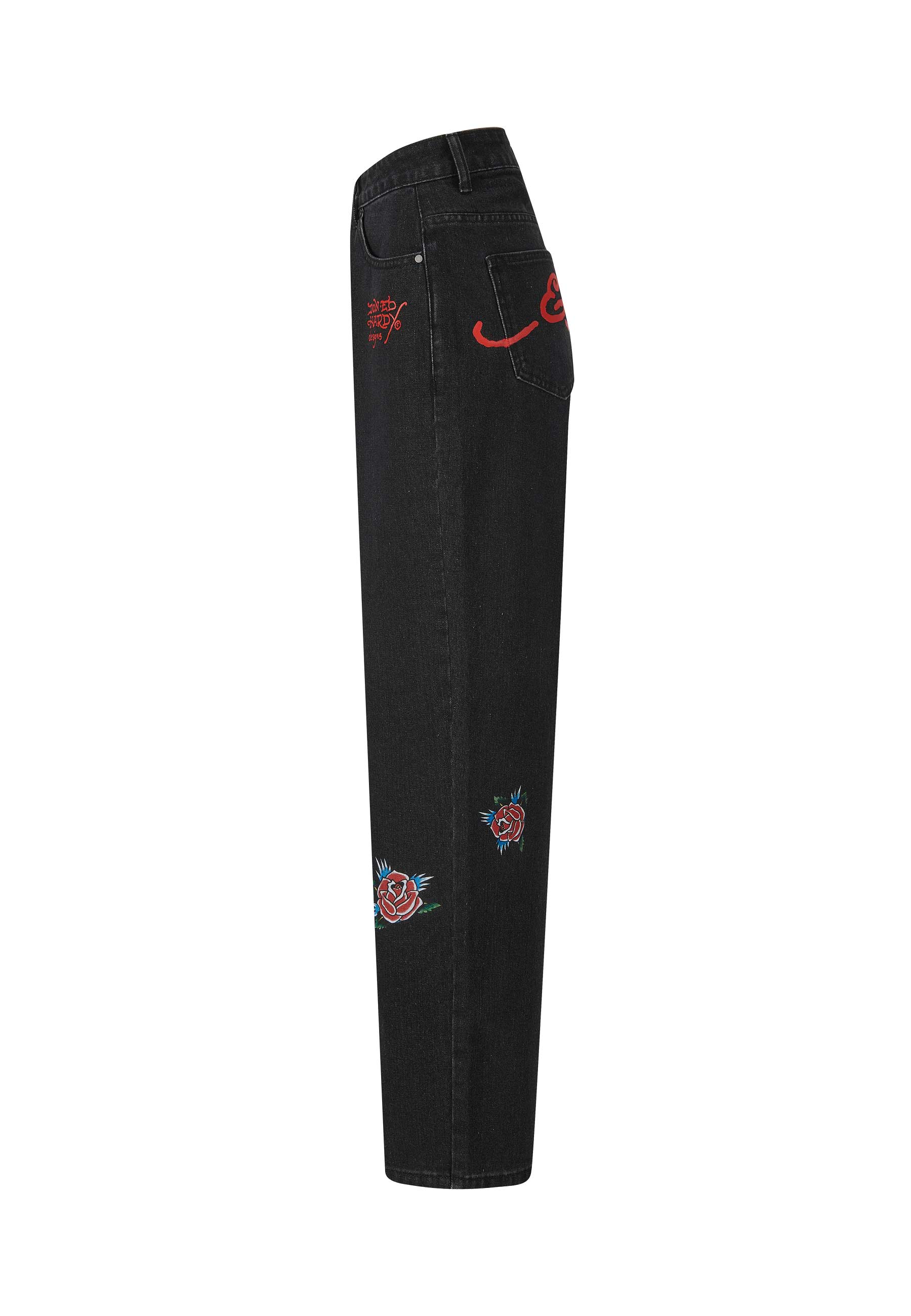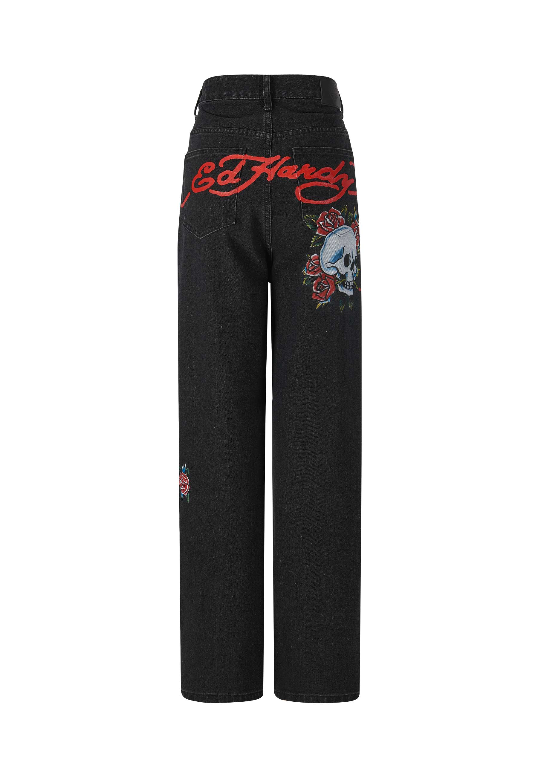 The Relaxed-Fit leg showcases intricate full-colour embroidery, featuring Ed Hardy's iconic Blooming Skull and original Rose graphics from his sketchbook. Crafted from 100% Black Cotton Denim, they merge art and comfort, capturing Ed Hardy's enduring style, from sketchbook to street. We recommend sizing down for the best fit.