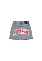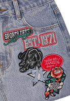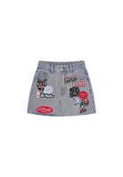 Womens Multi Badge Tattoo Denim Fitted Mini Skirt - Mid Blue