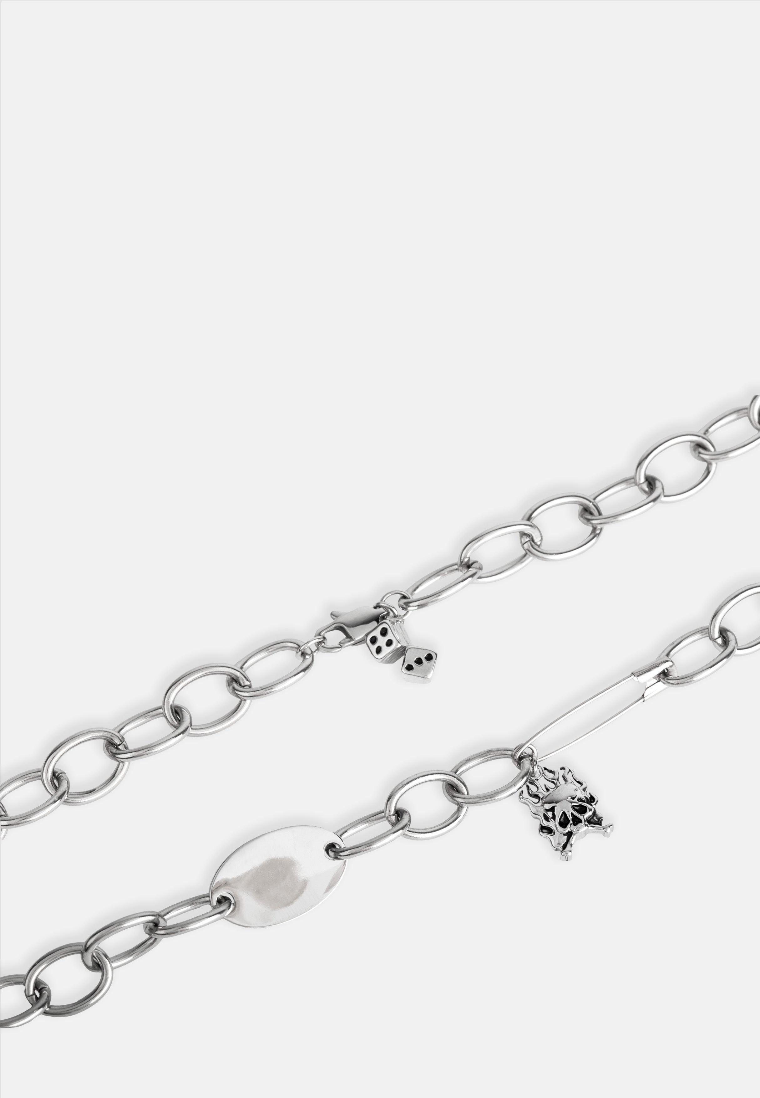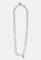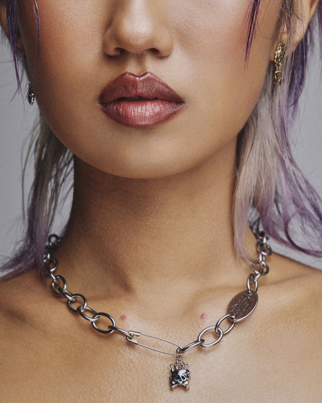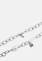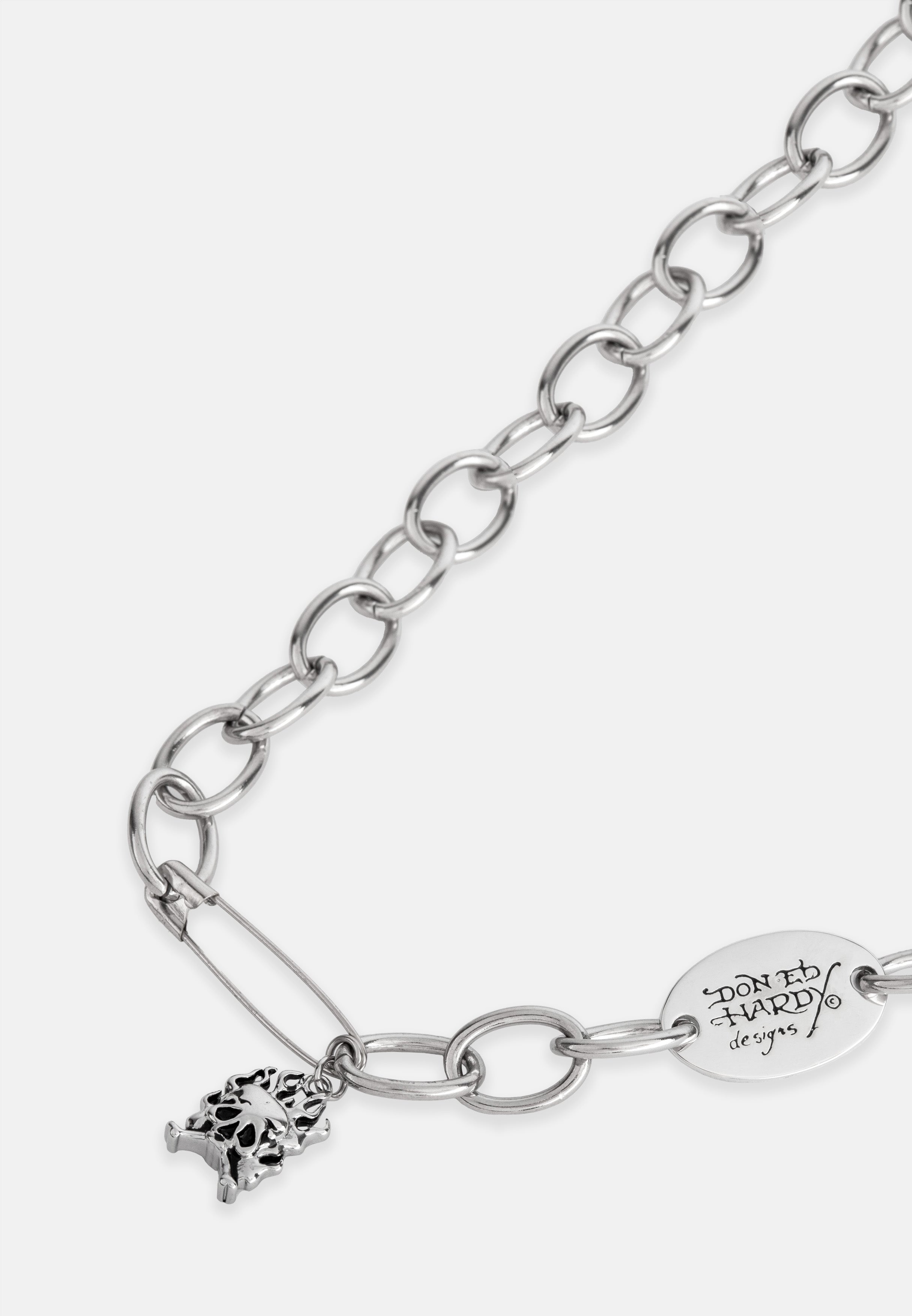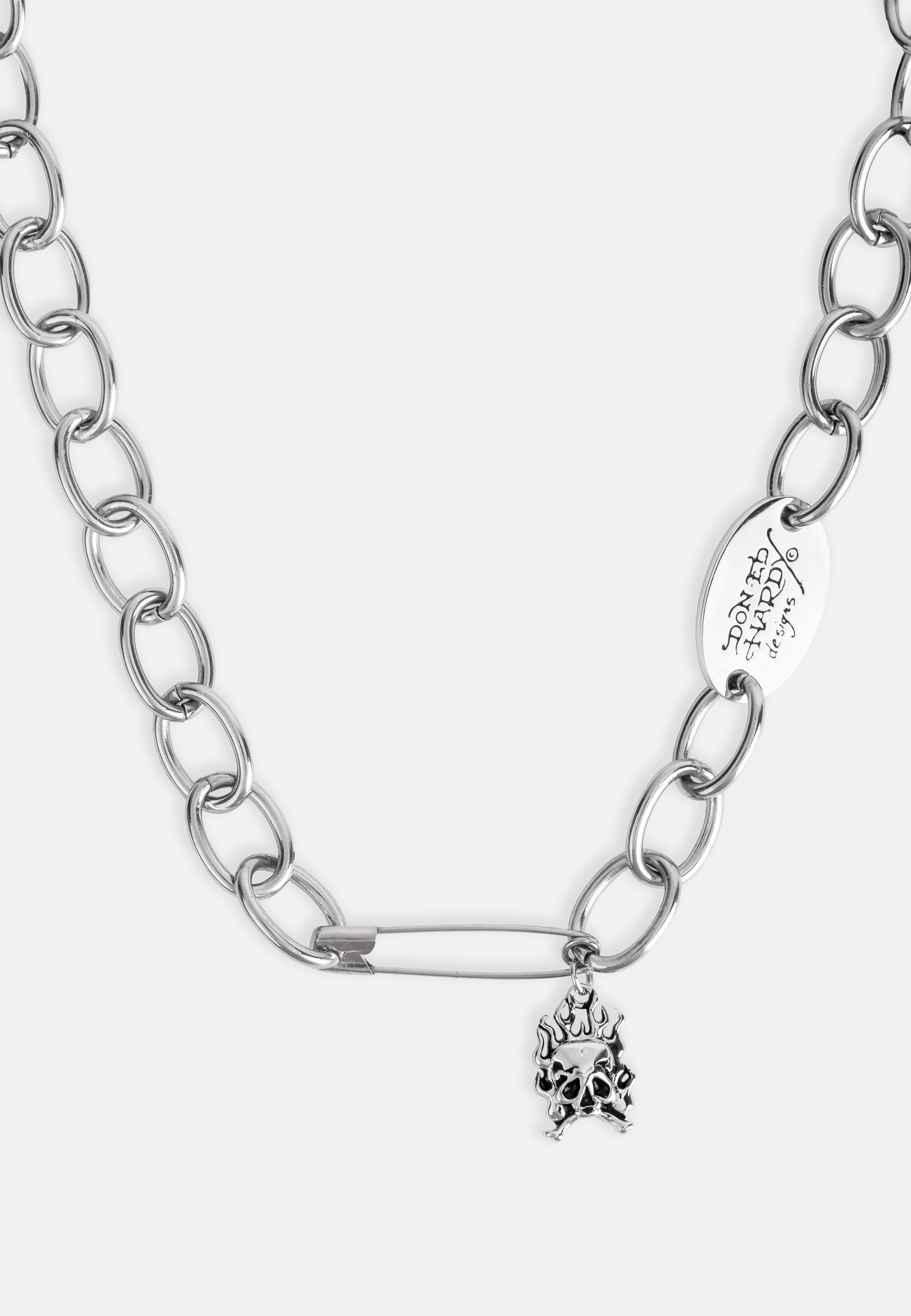 Stainless Steel oval link chunky chain necklace with Oval Don Ed Hardy charm, safety pin and Flaming Skull charm in a silver finish.