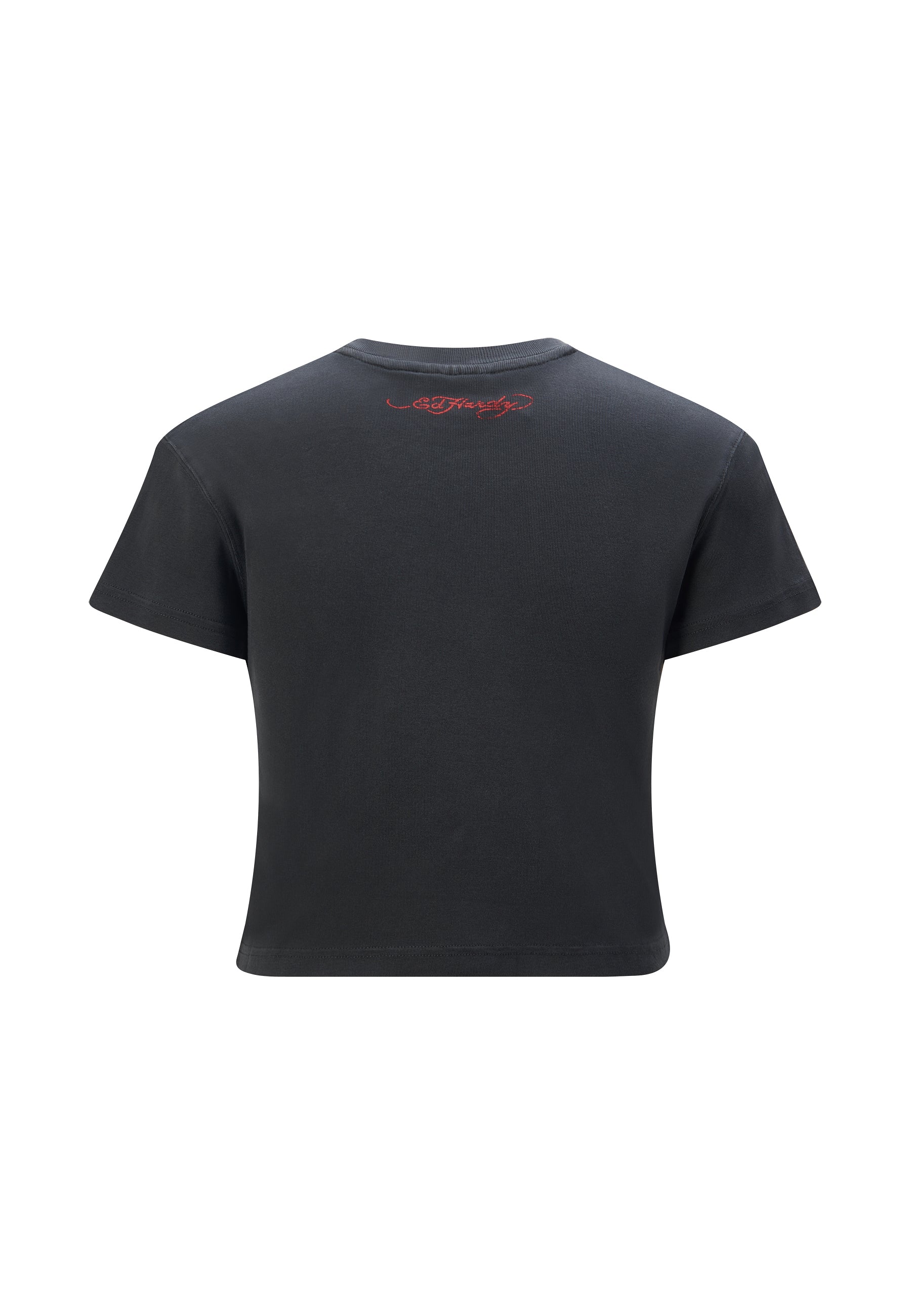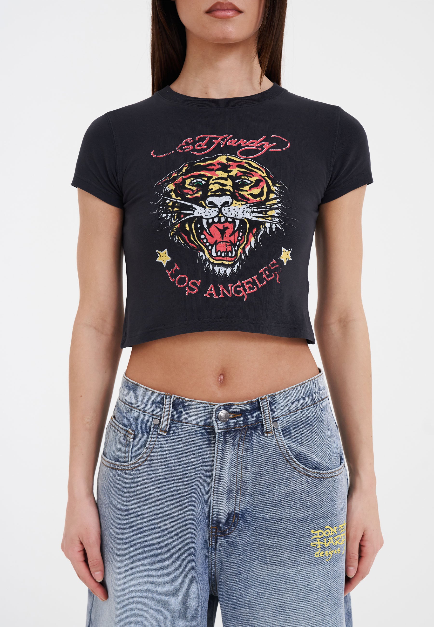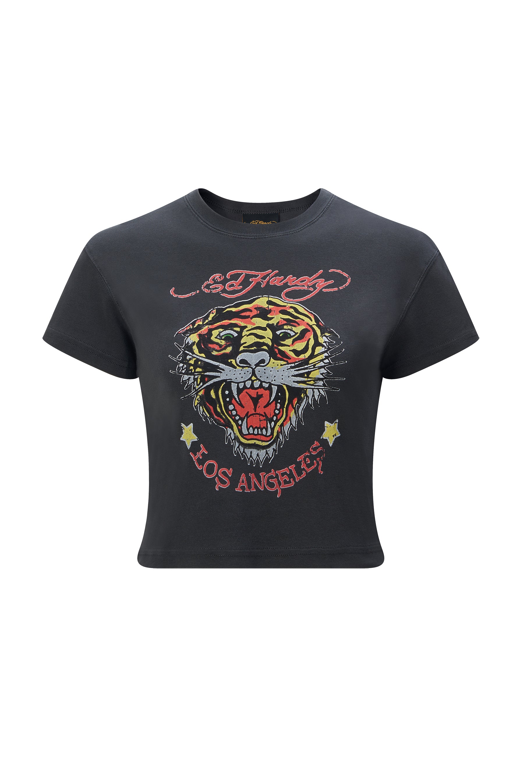 This 100% cotton cropped baby tee in washed black features a classic tattoo-inspired tiger graphic and Los Angeles typography for a lived-in, vintage appeal.