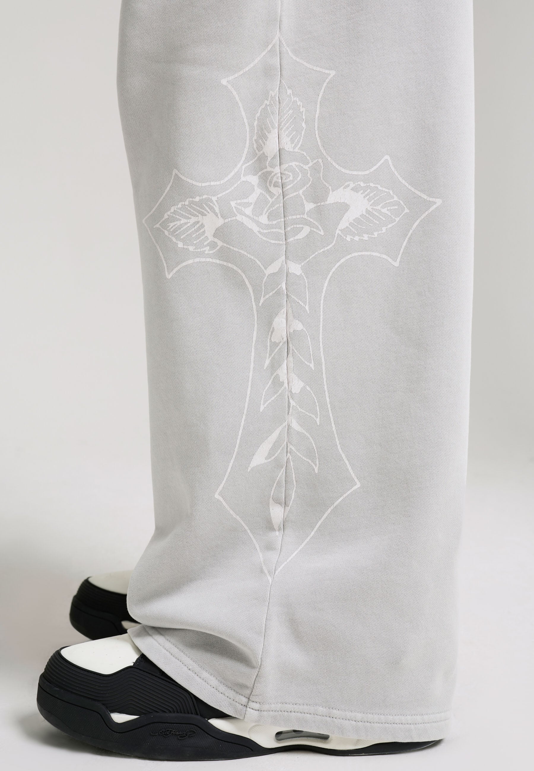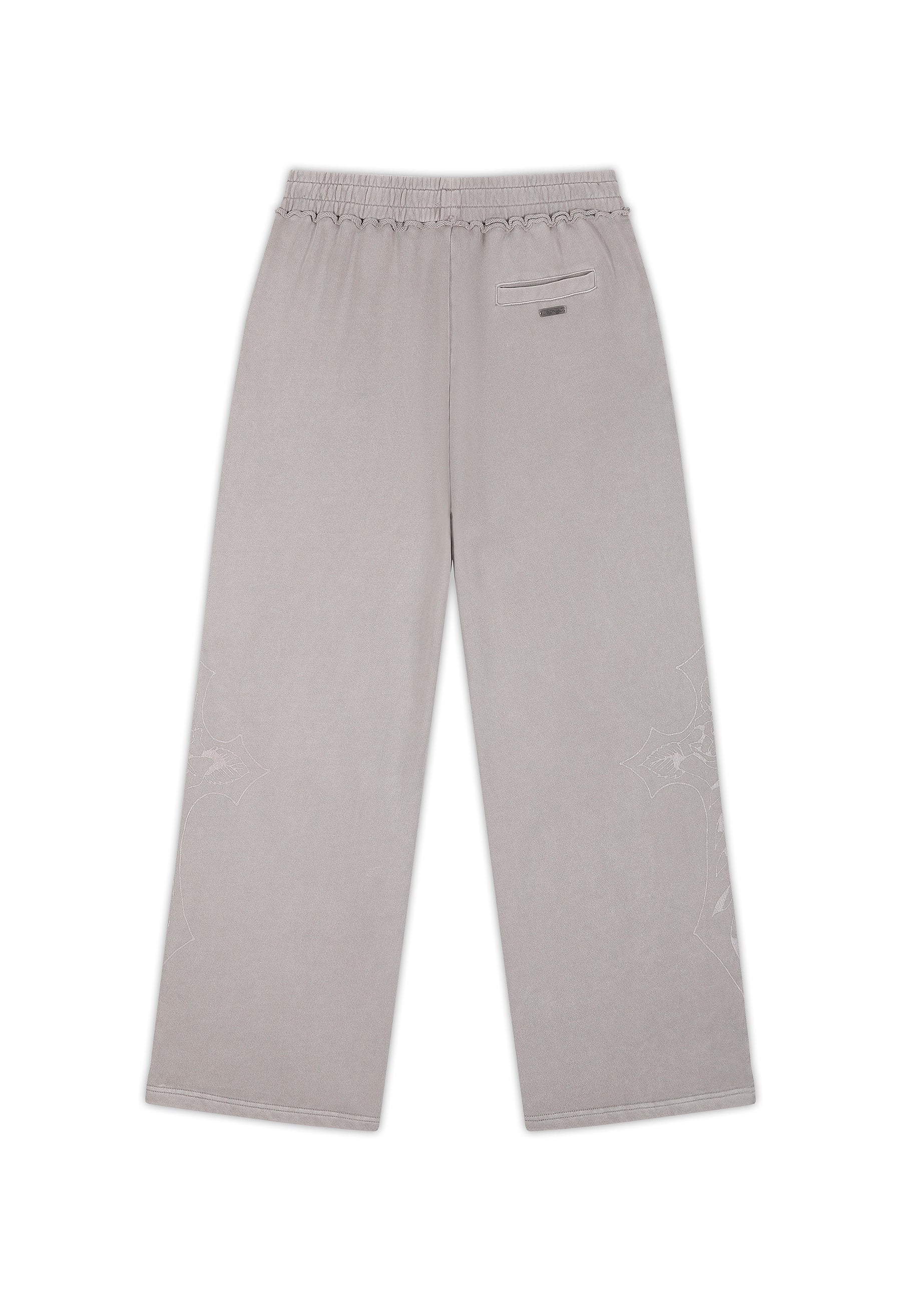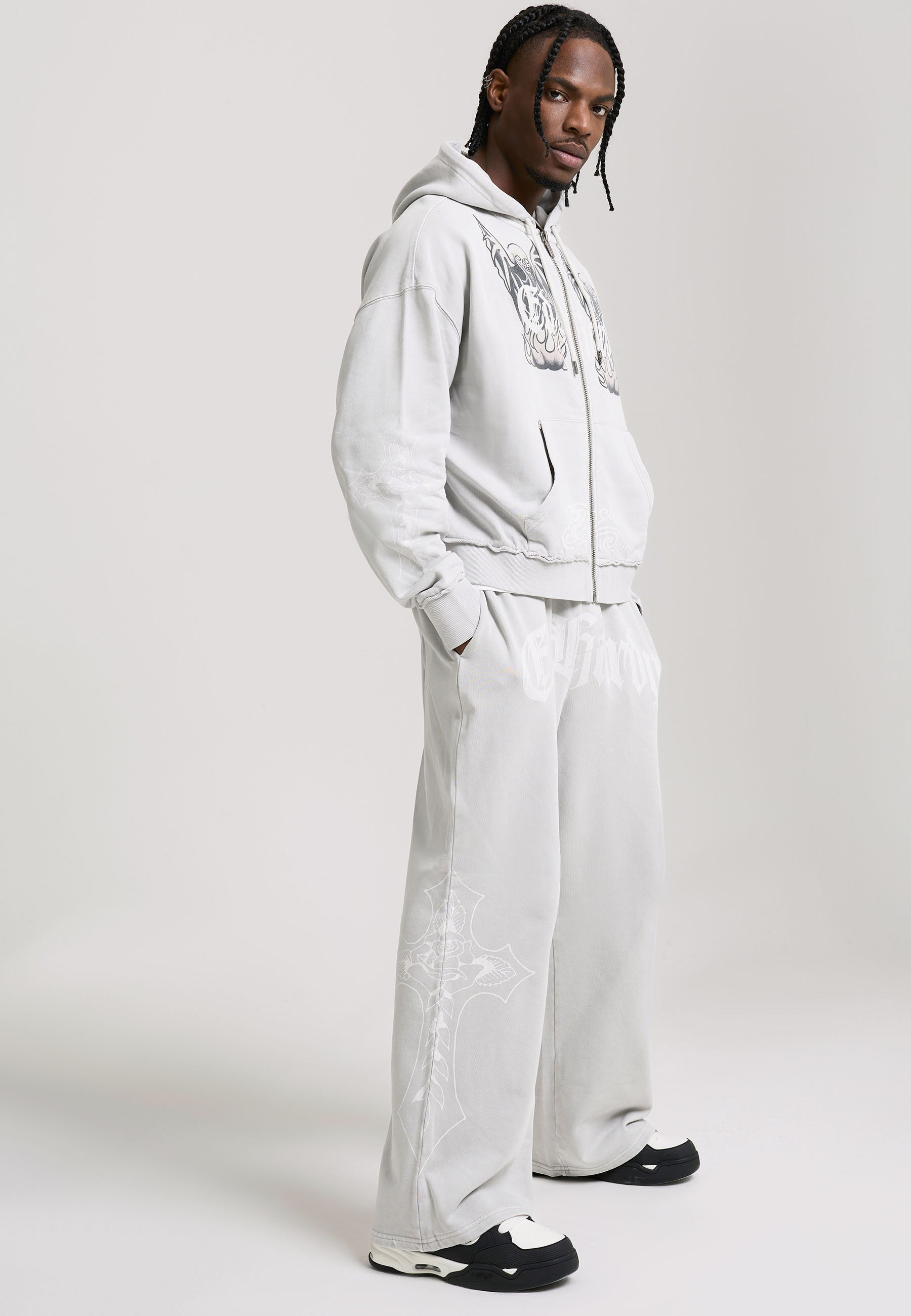 100% COTTON 350GSM RELAXED FIT GARMENT DYE GOTHIC PRINT DISTRESSED SEAMS CROSS PRINT DETAIL BACK POCKET