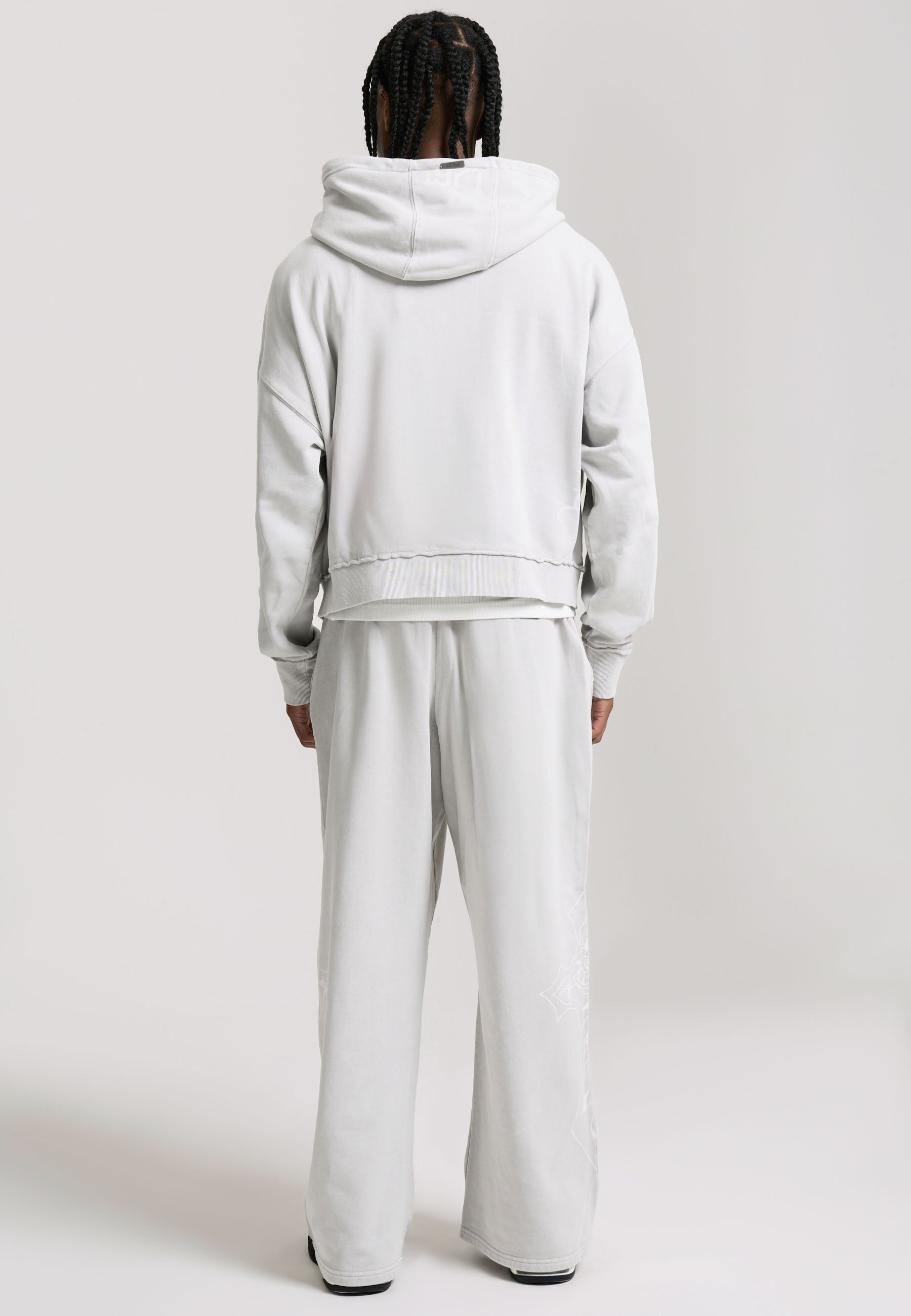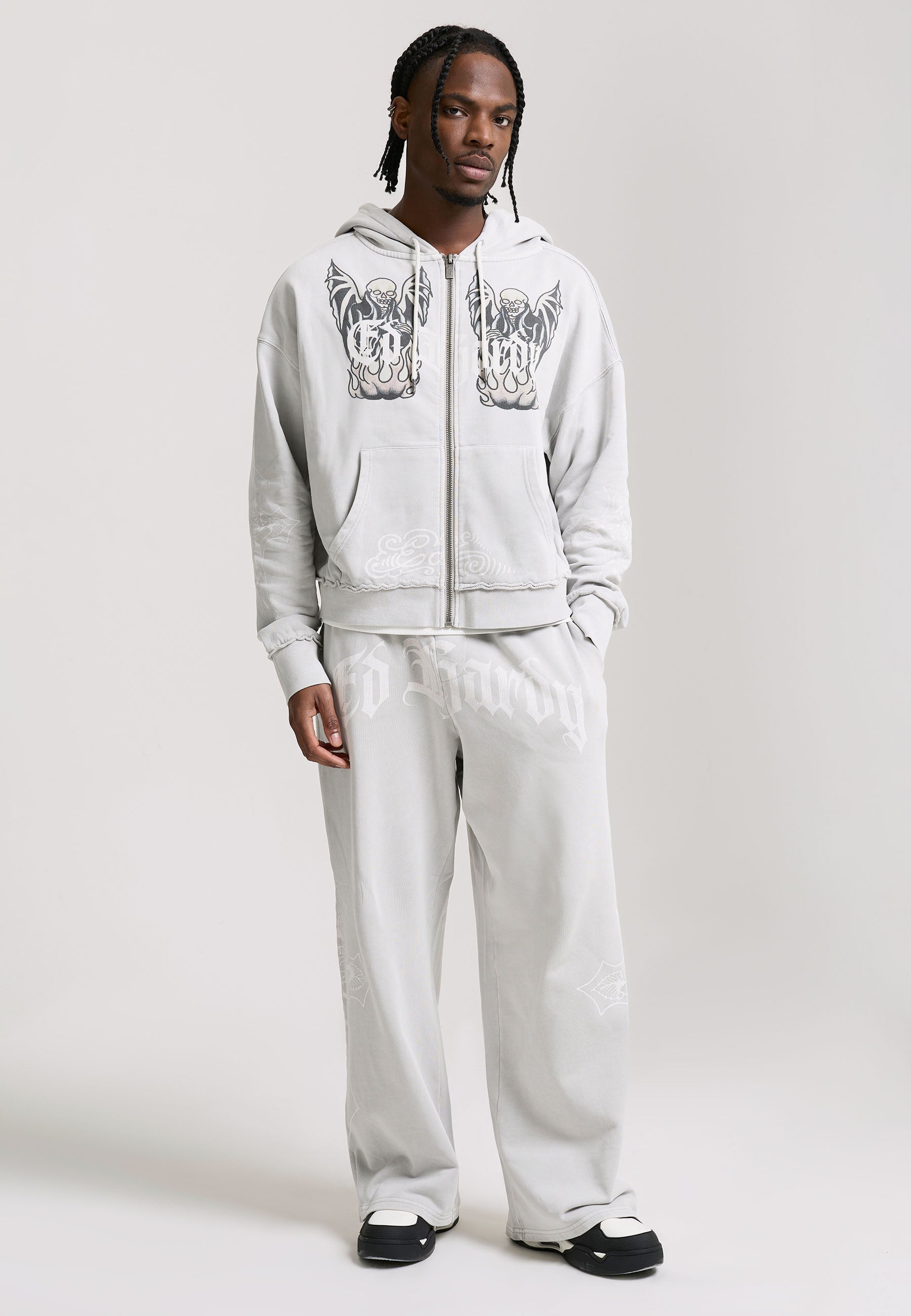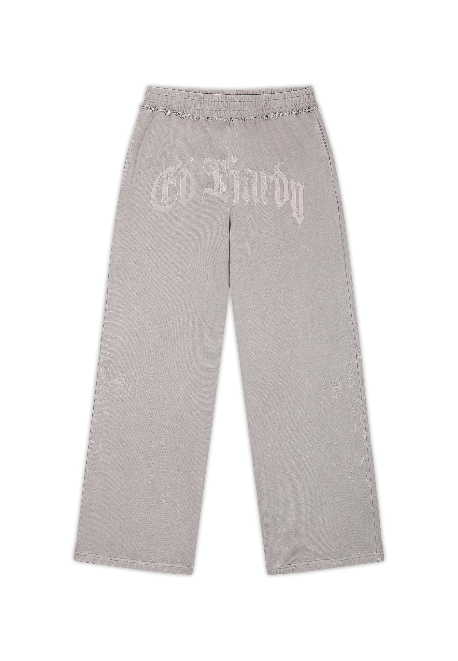 100% COTTON 350GSM RELAXED FIT GARMENT DYE GOTHIC PRINT DISTRESSED SEAMS CROSS PRINT DETAIL BACK POCKET