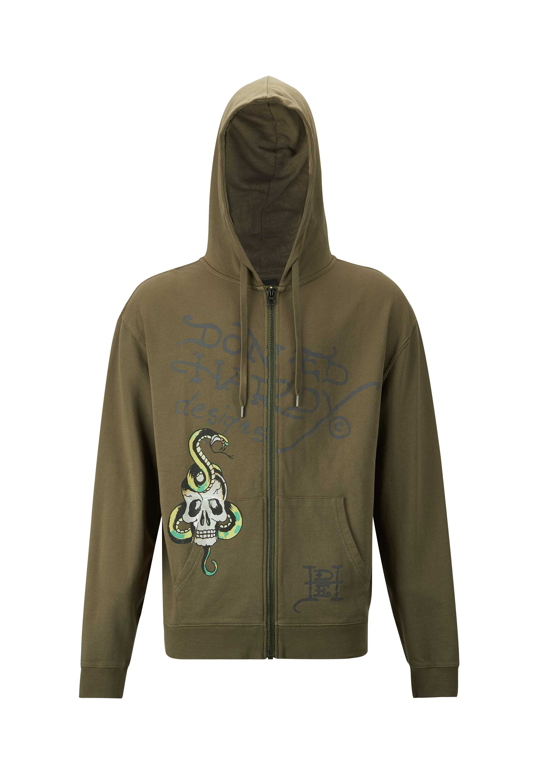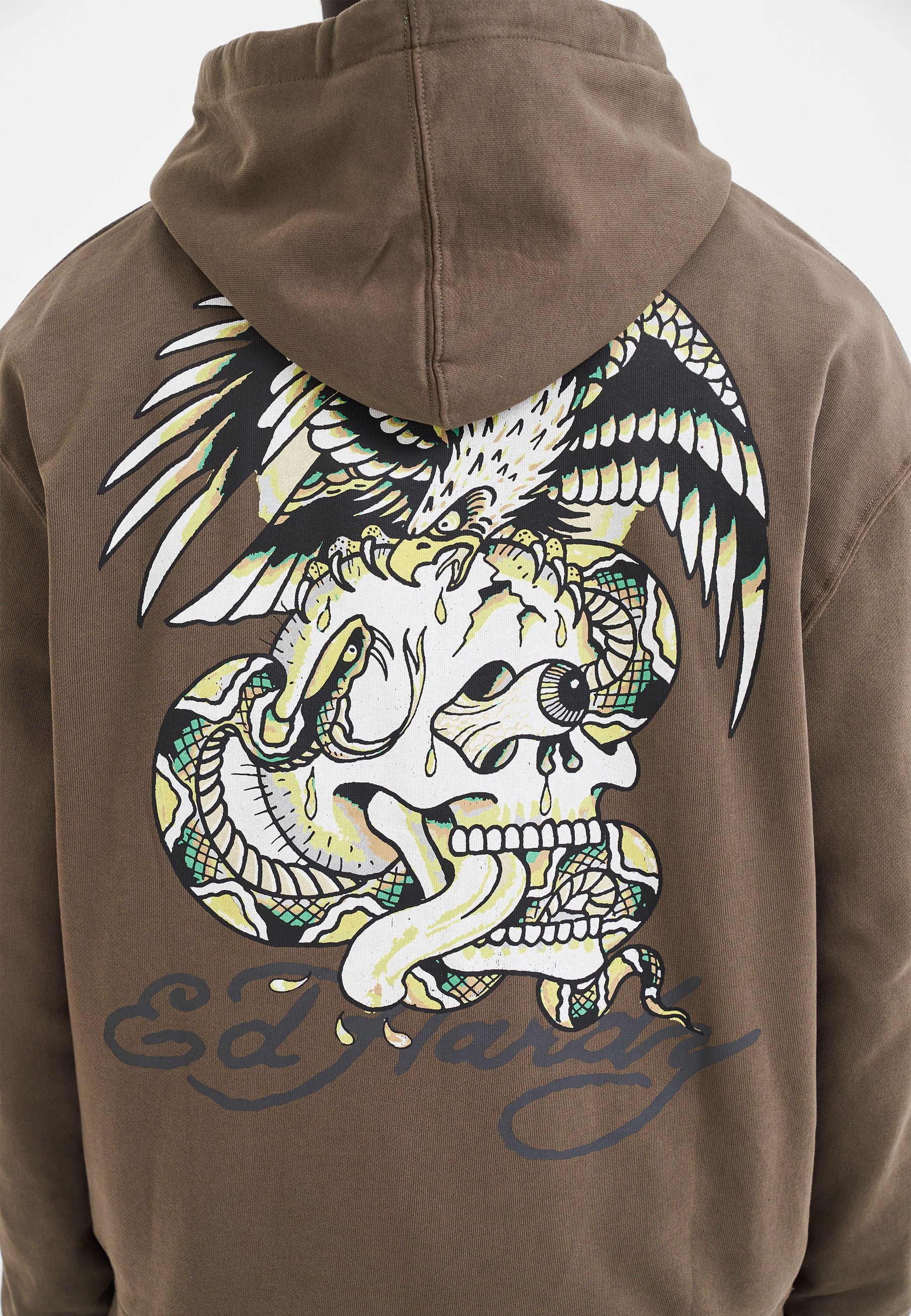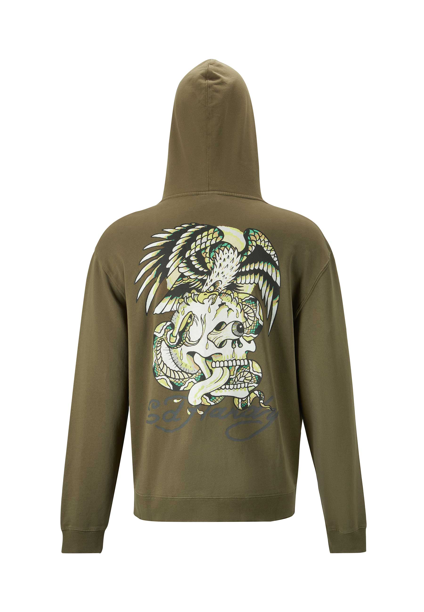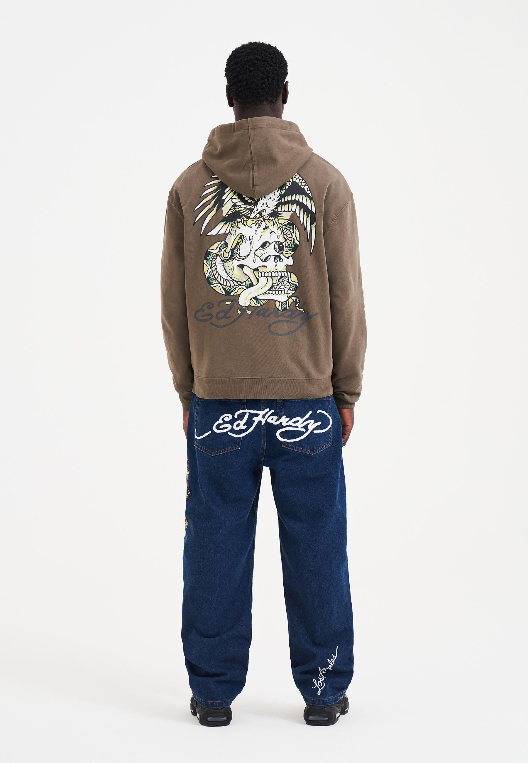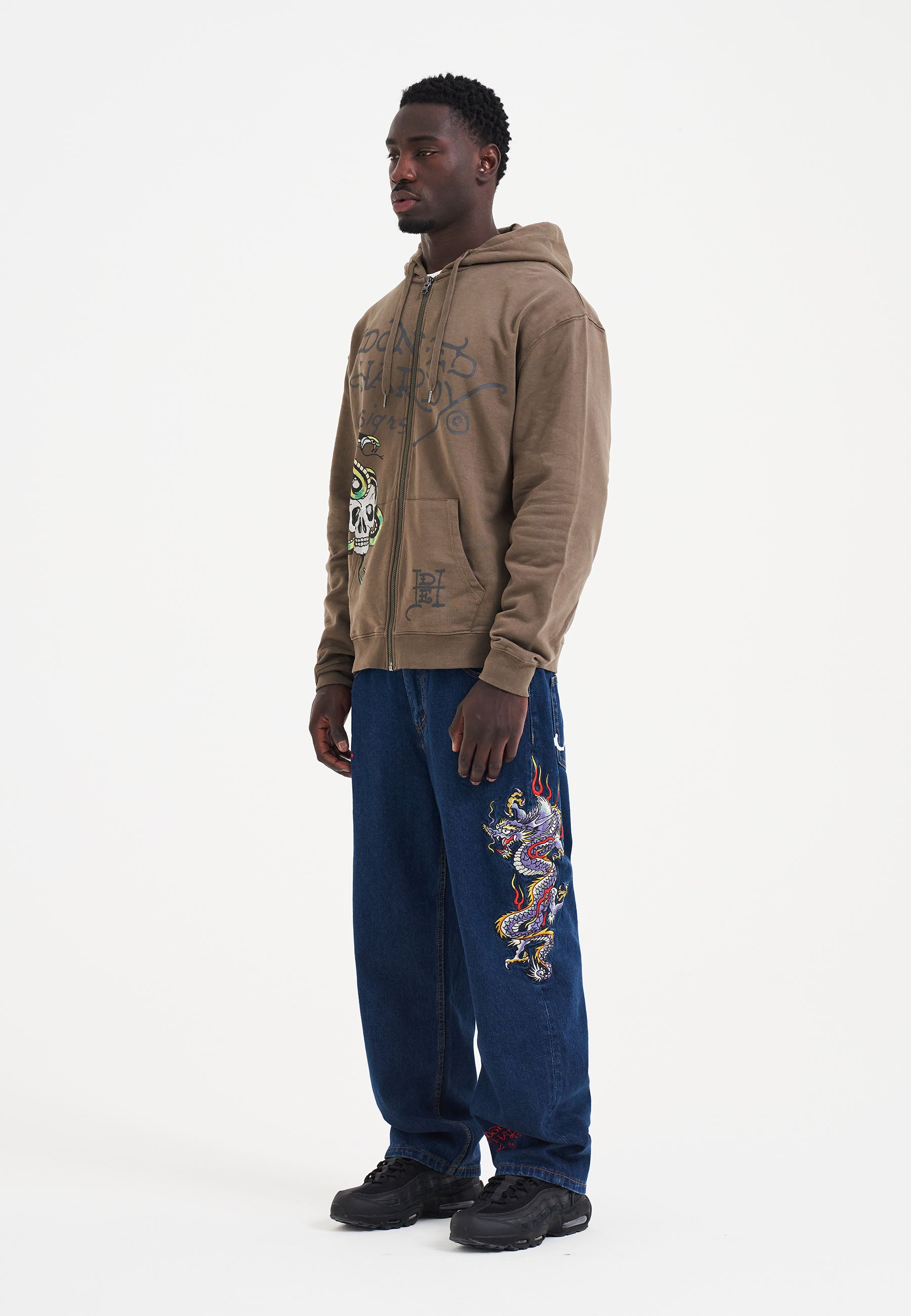 Meet the Eyeball Zip Thru Hoody, featuring the iconic Don Ed Hardy logo on the front chest and a signature monogram on the hem. This hoody is unmistakably a piece of Ed's work. Its boldest feature, a full-colour giant eyeball graphic of a skull and eagle on the back, is the focal point of the piece and a testament to Ed's artful expression and daring fashion designs.
