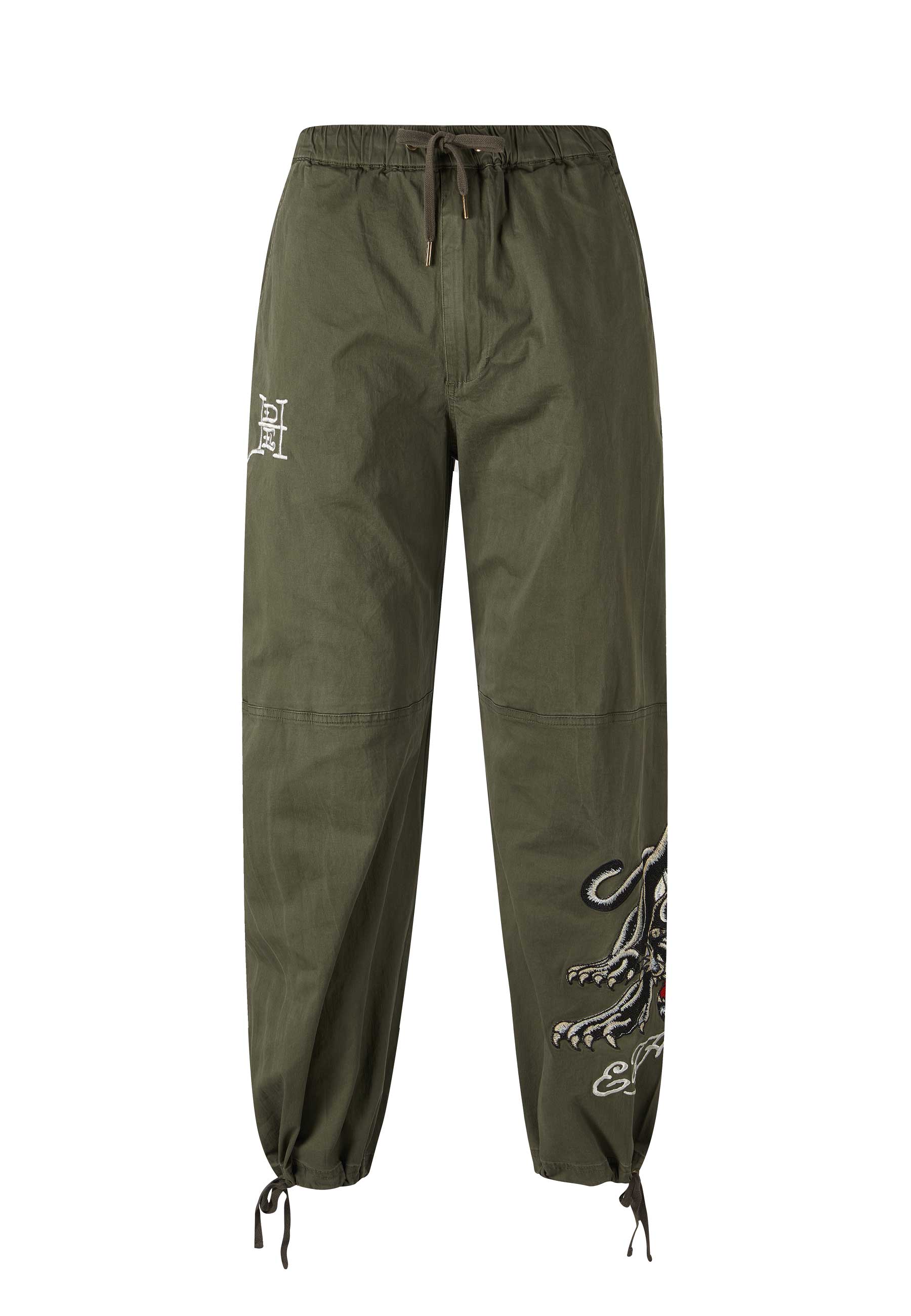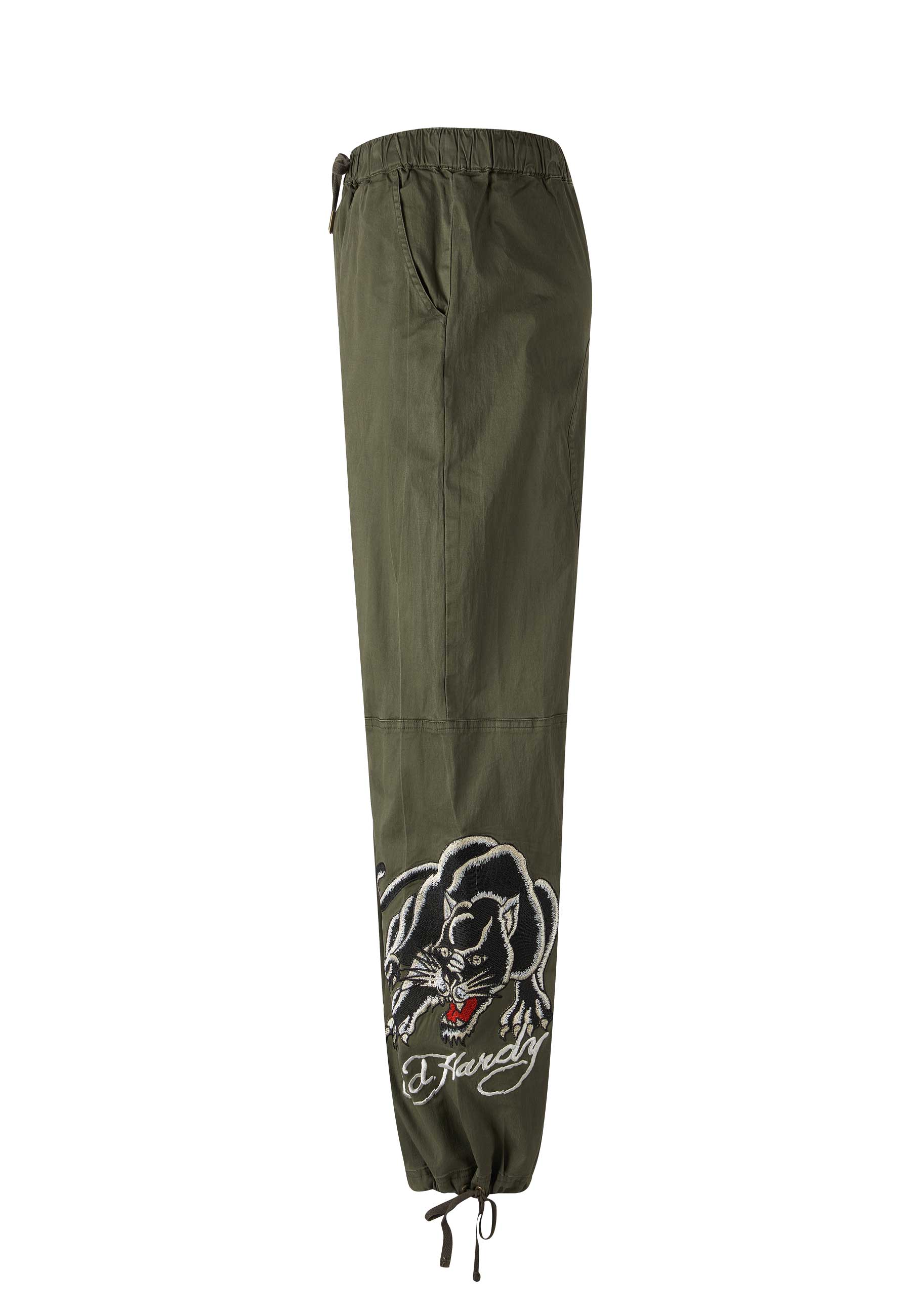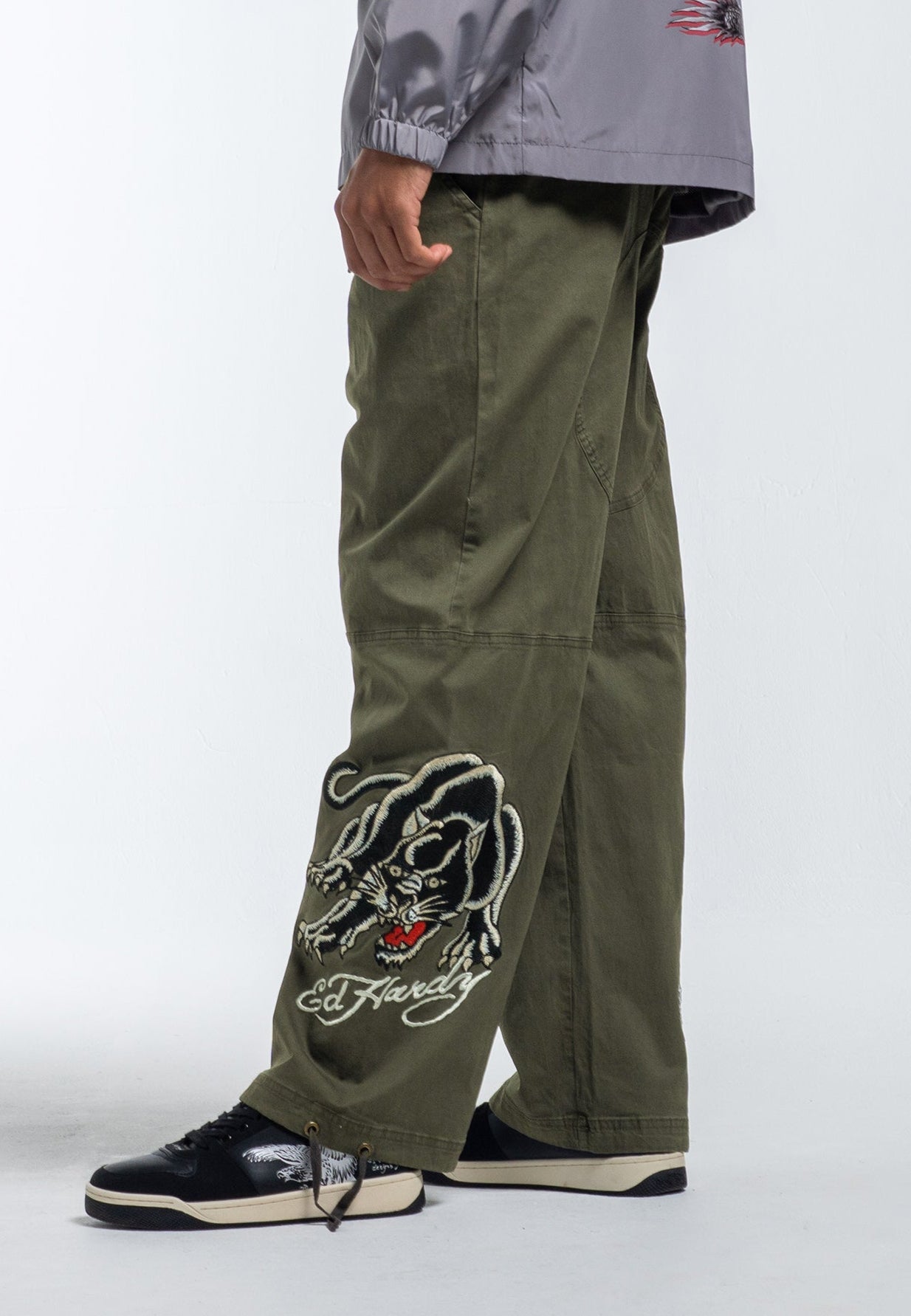 Introducing the Panther Woven Tech Pant in khaki green, adorned with a striking full-colour embroidered panther graphic from the Ed Hardy archives.