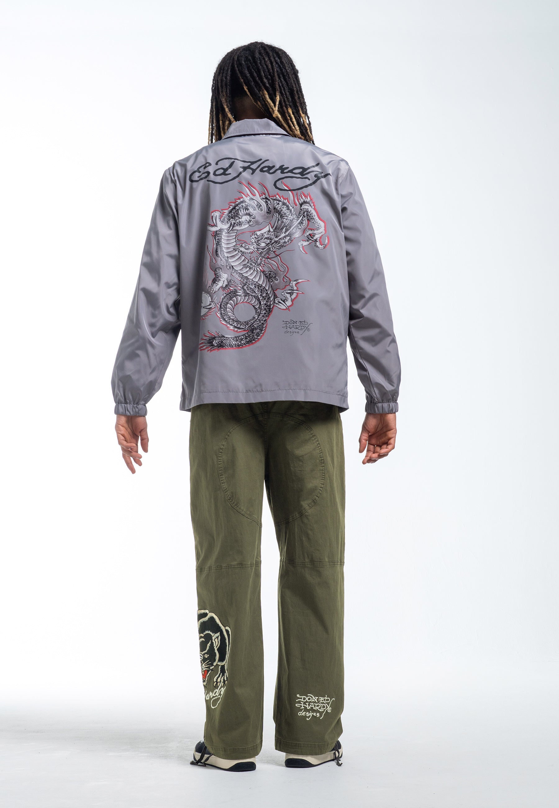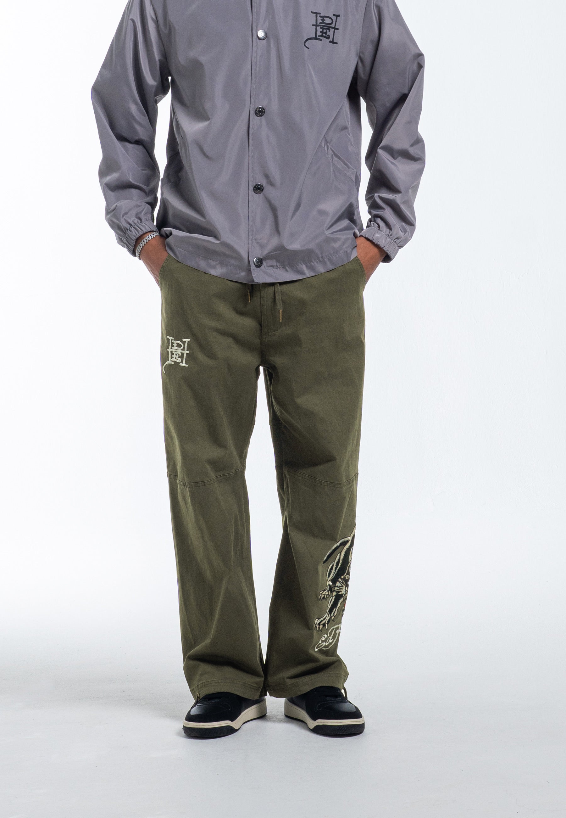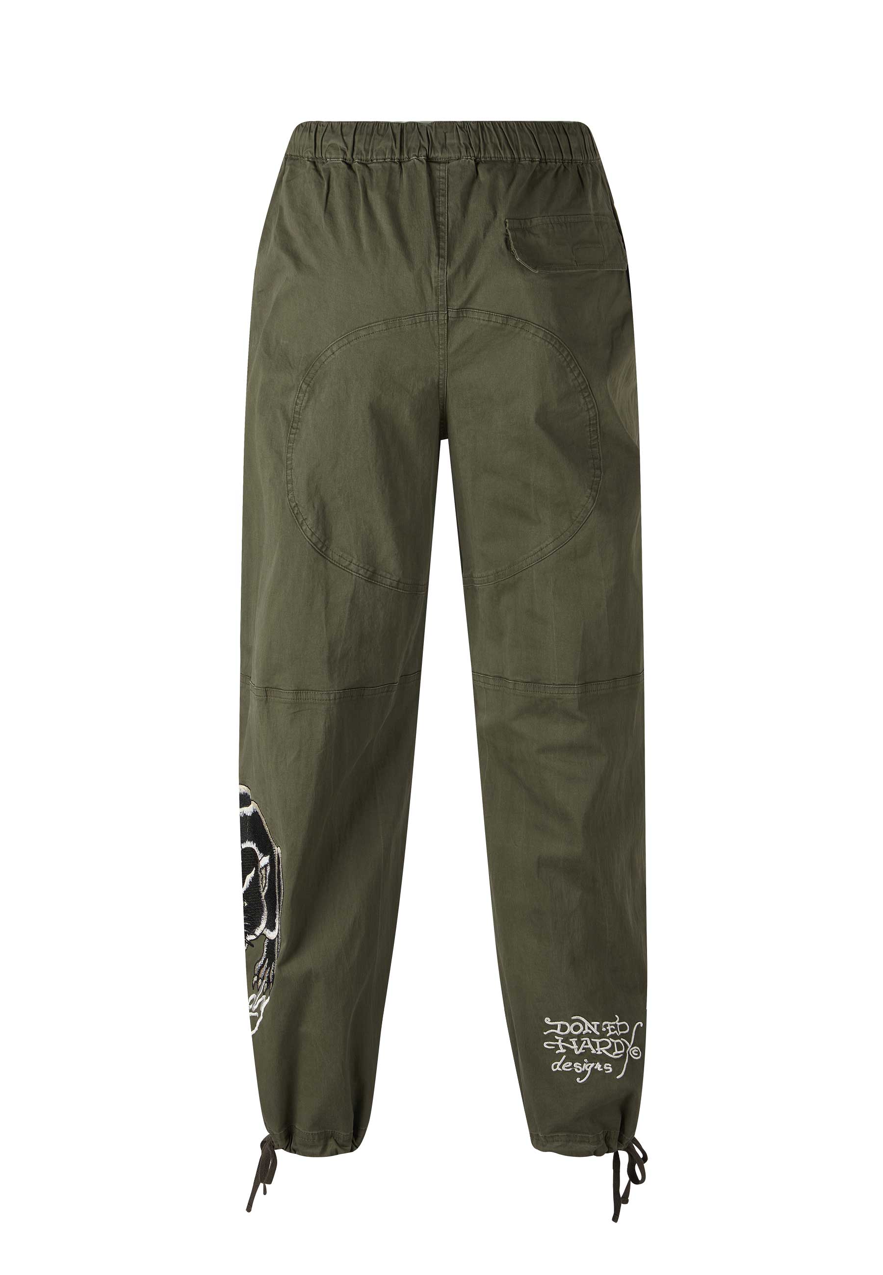 Introducing the Panther Woven Tech Pant in khaki green, adorned with a striking full-colour embroidered panther graphic from the Ed Hardy archives.