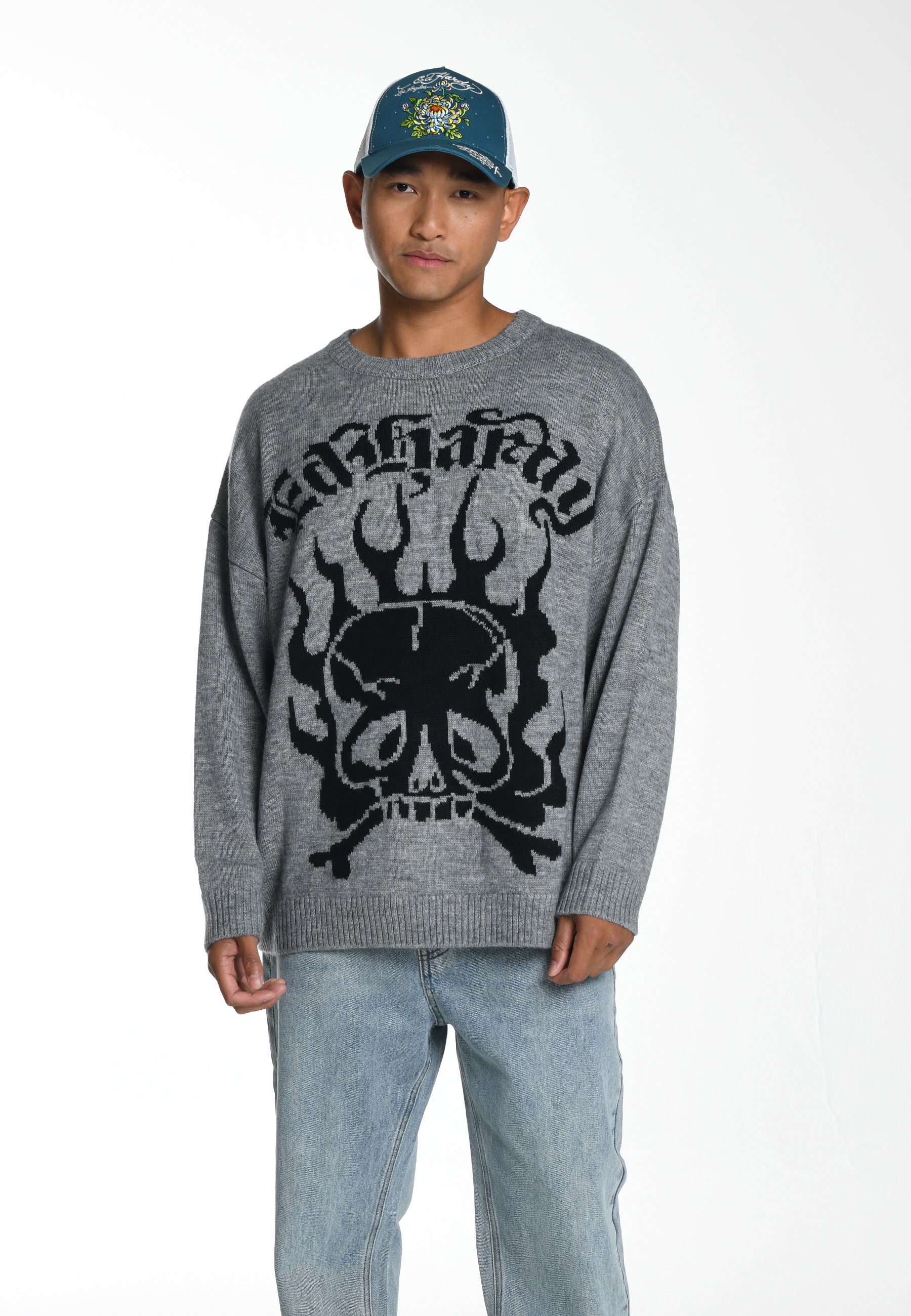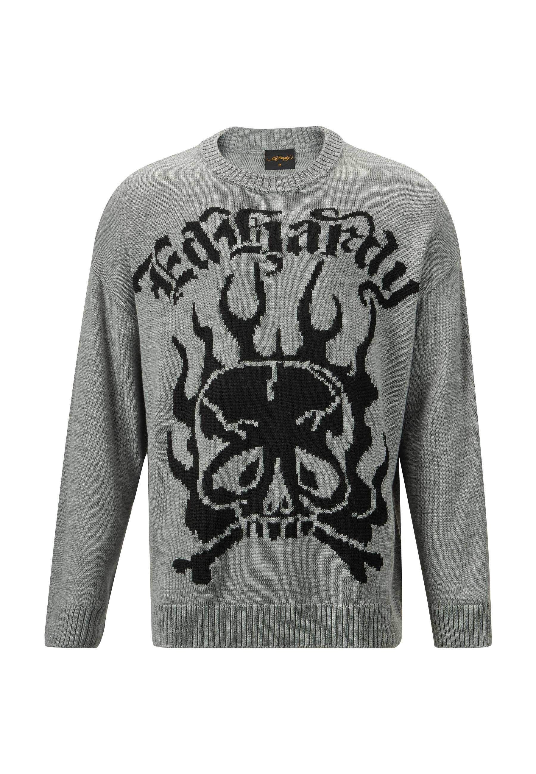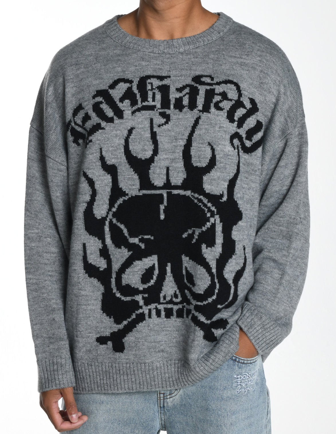 Mens Skull In Flames Jaquard Knitted Jumper - Grey/Black