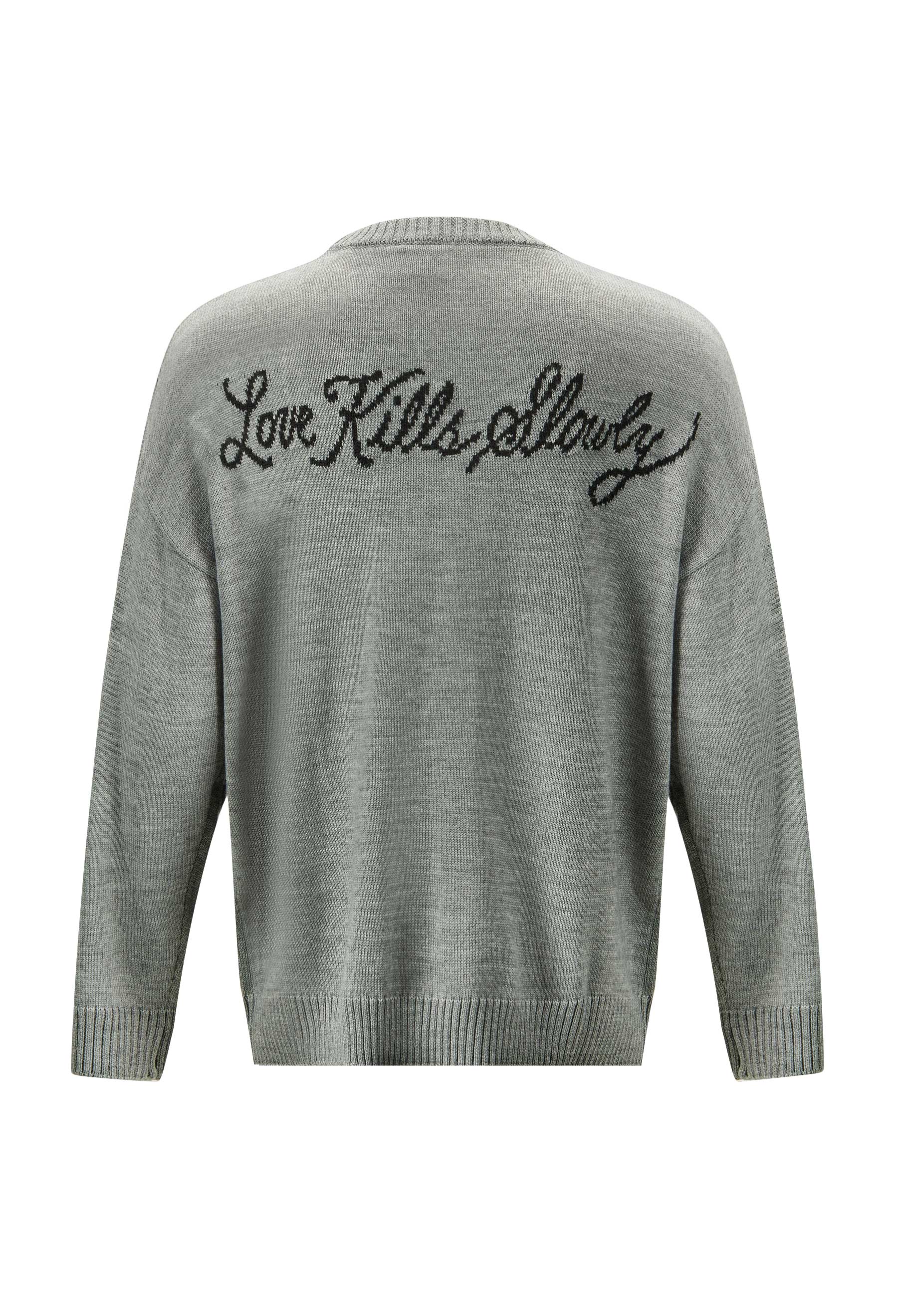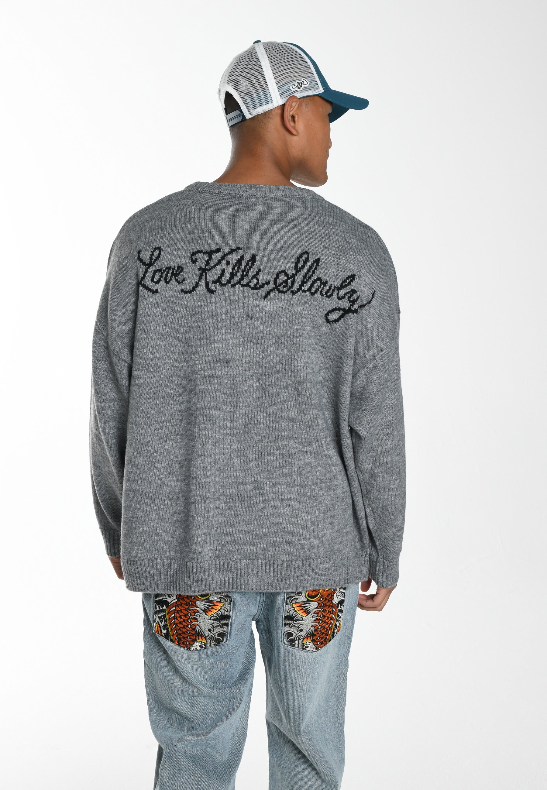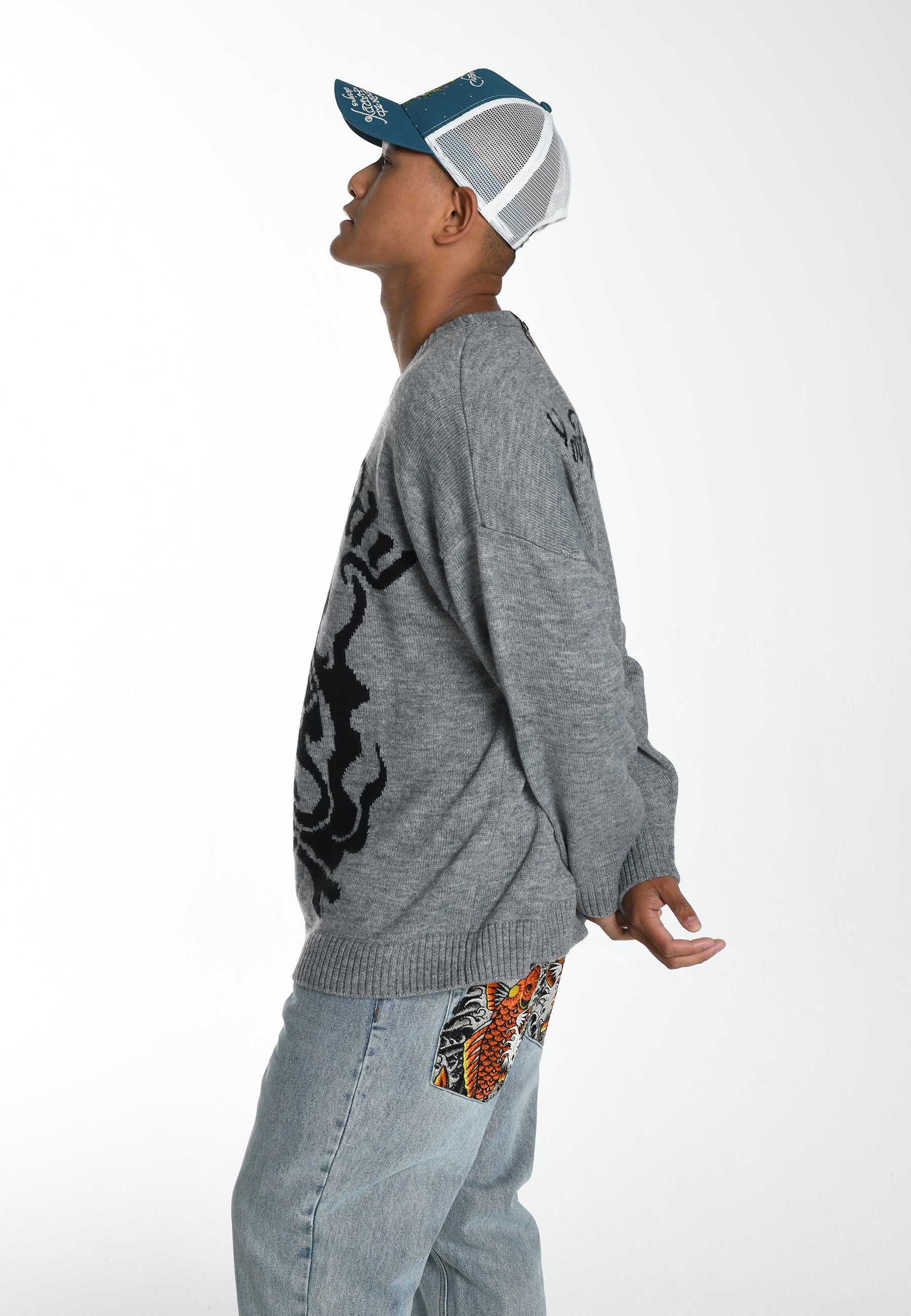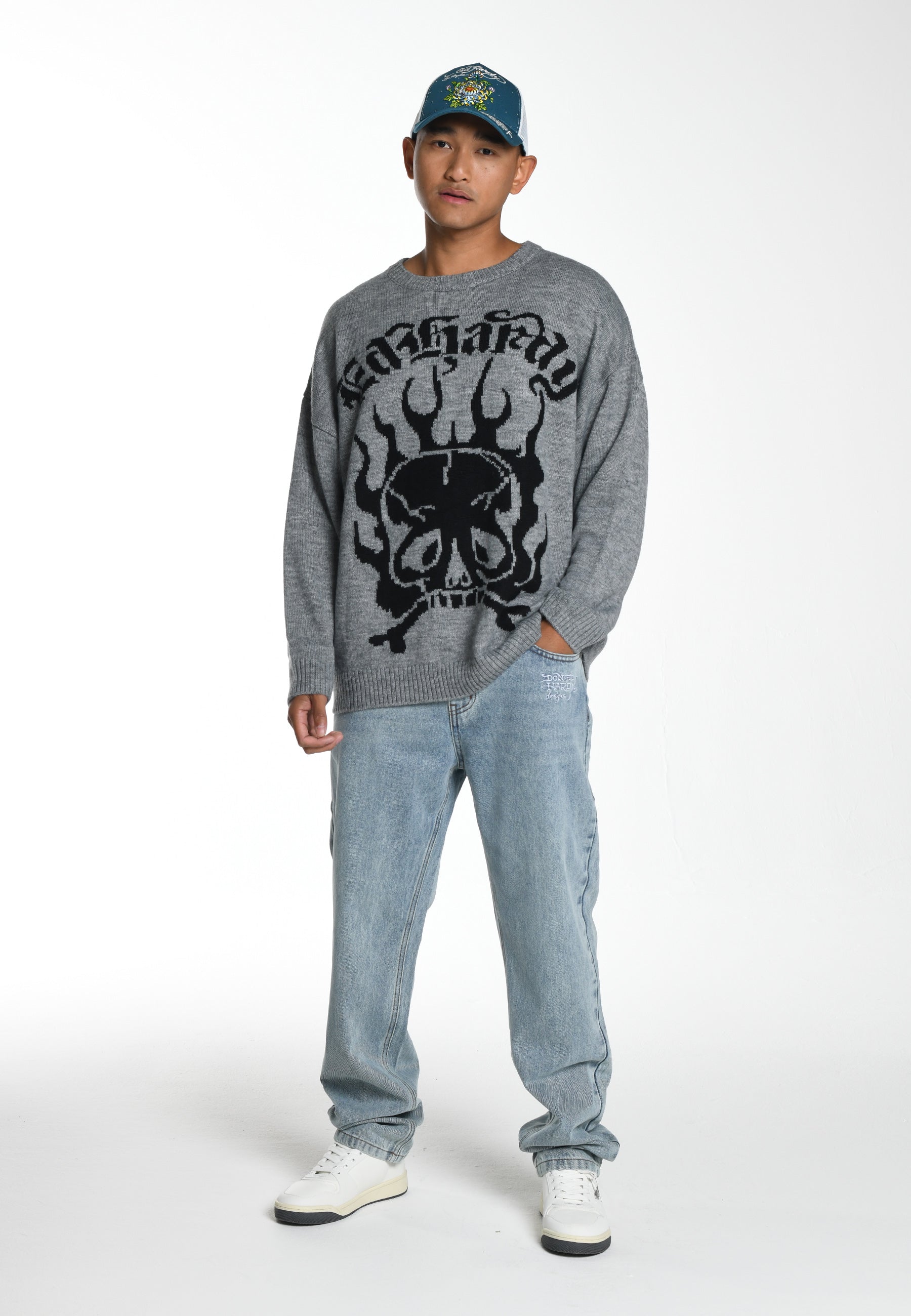Mens Skull In Flames Jaquard Knitted Jumper - Grey/Black