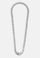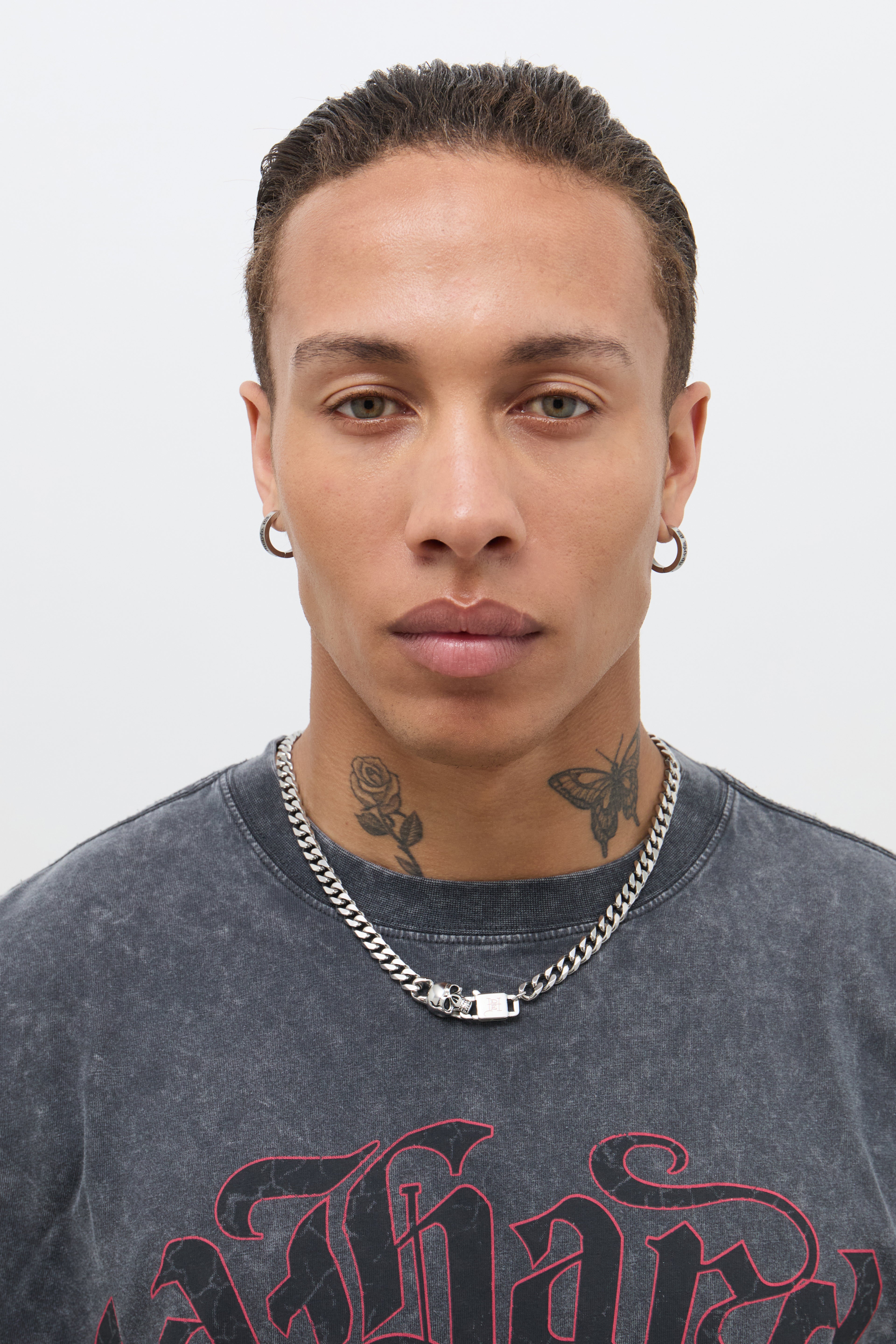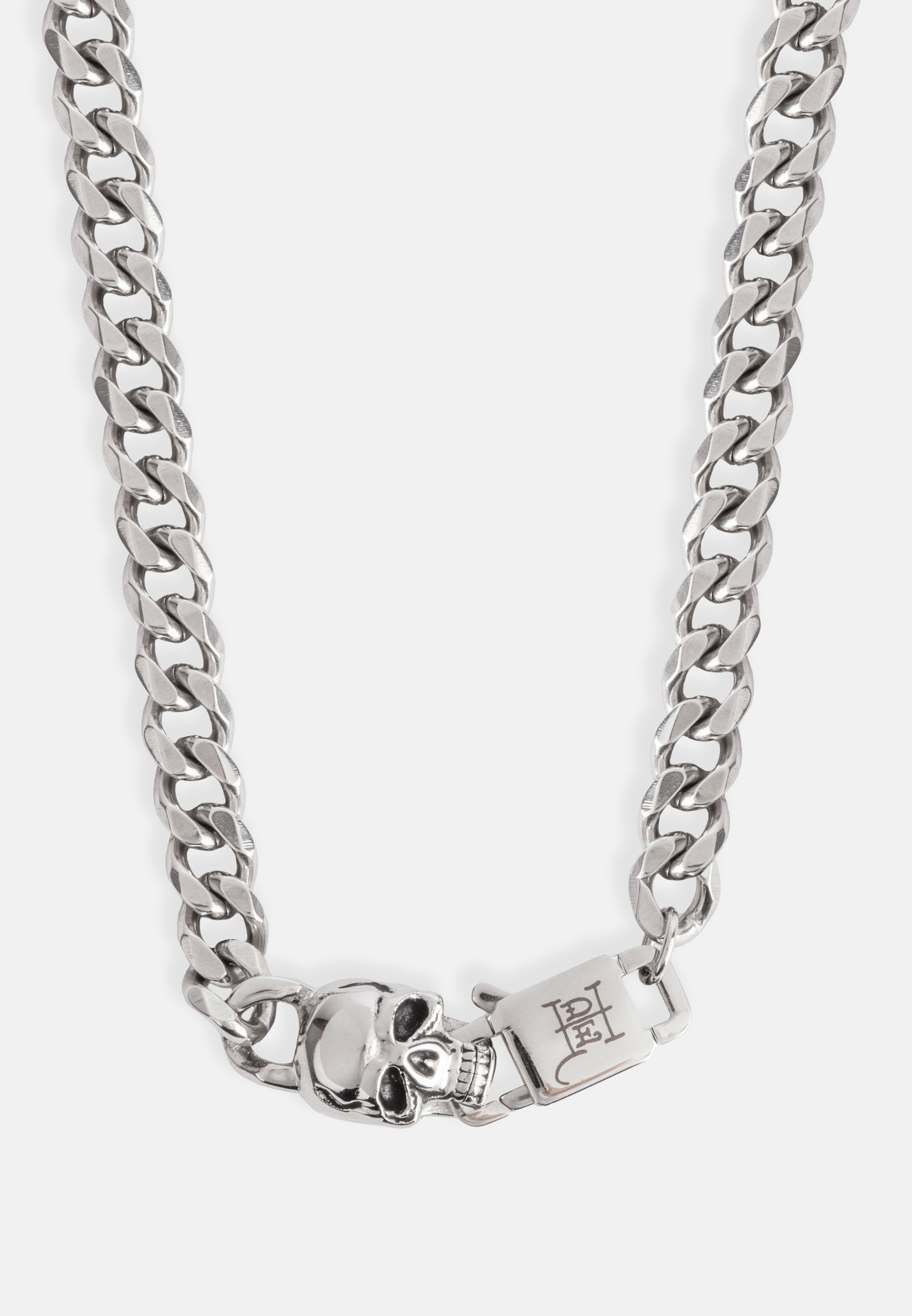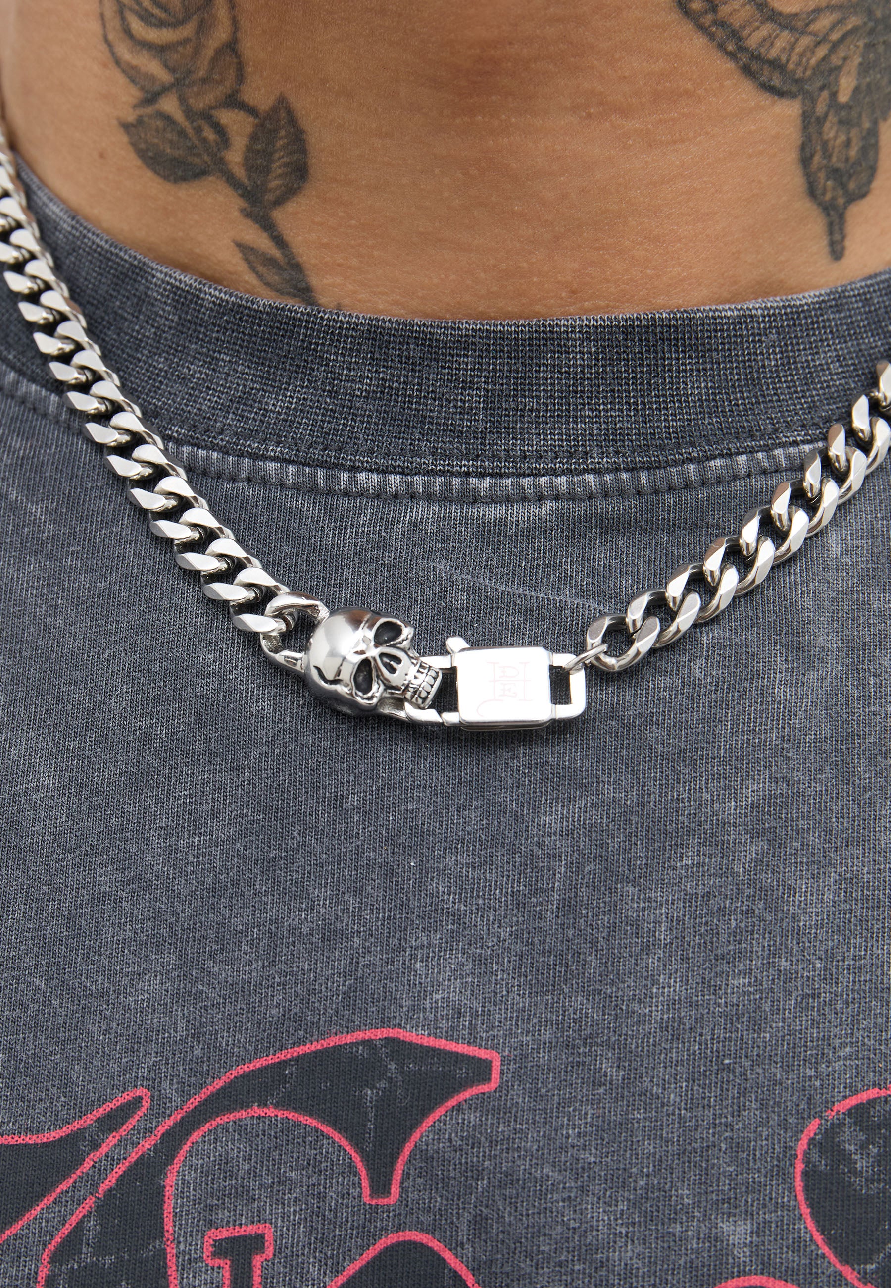 Chunky curb chain necklace with 3D Skull charm and clasp. Hand finished in an antique silver finish.