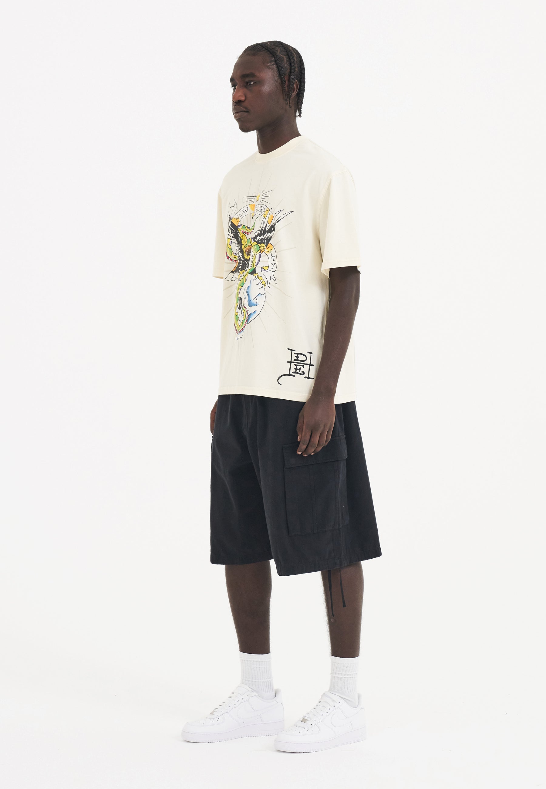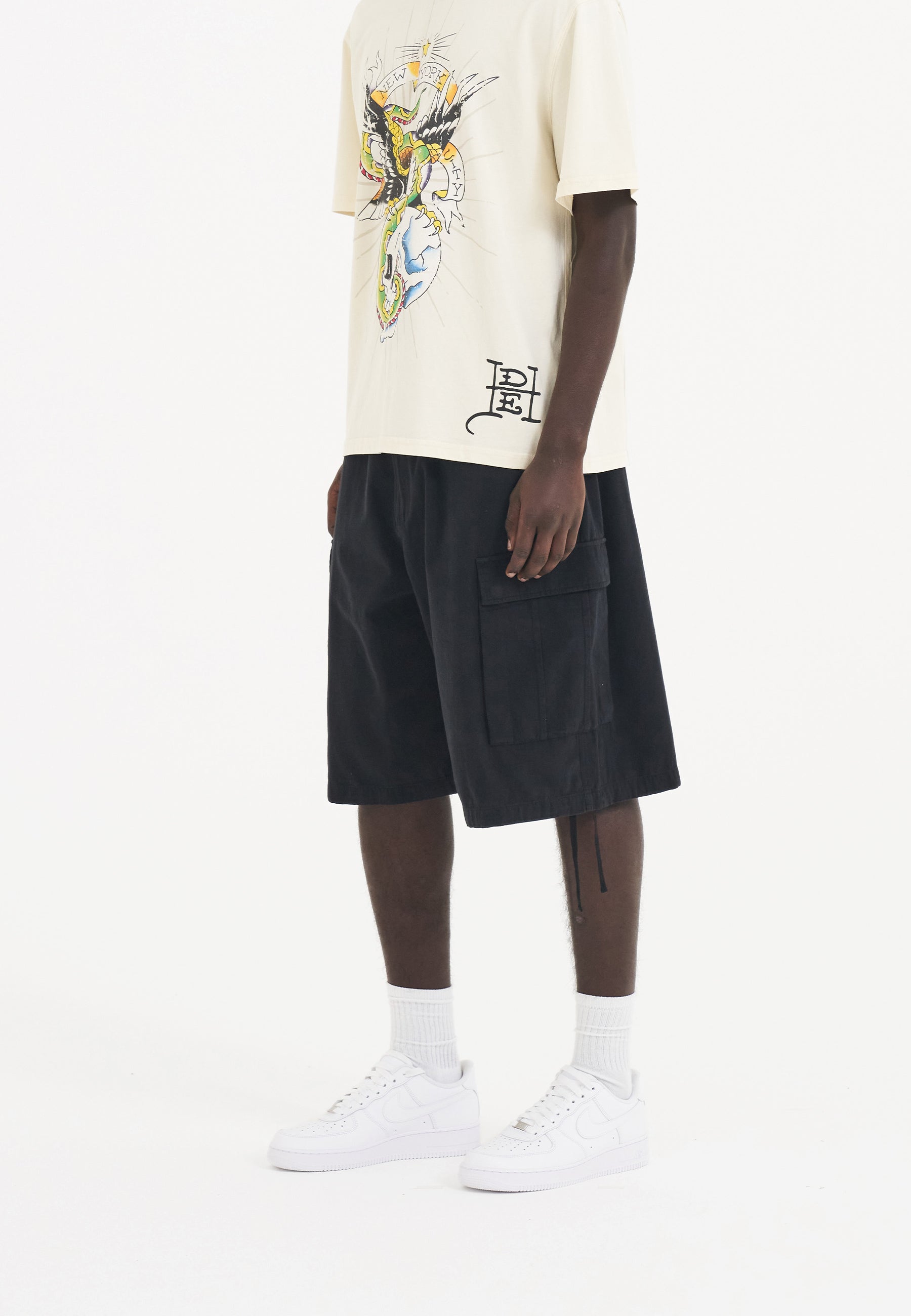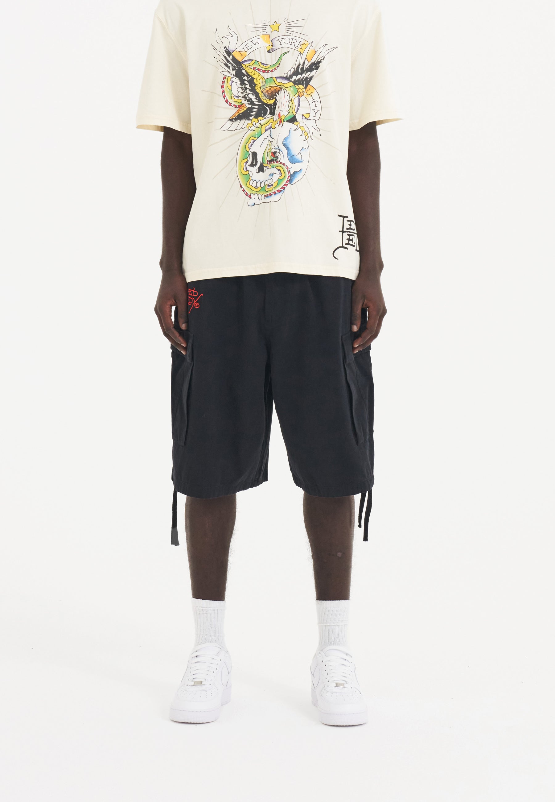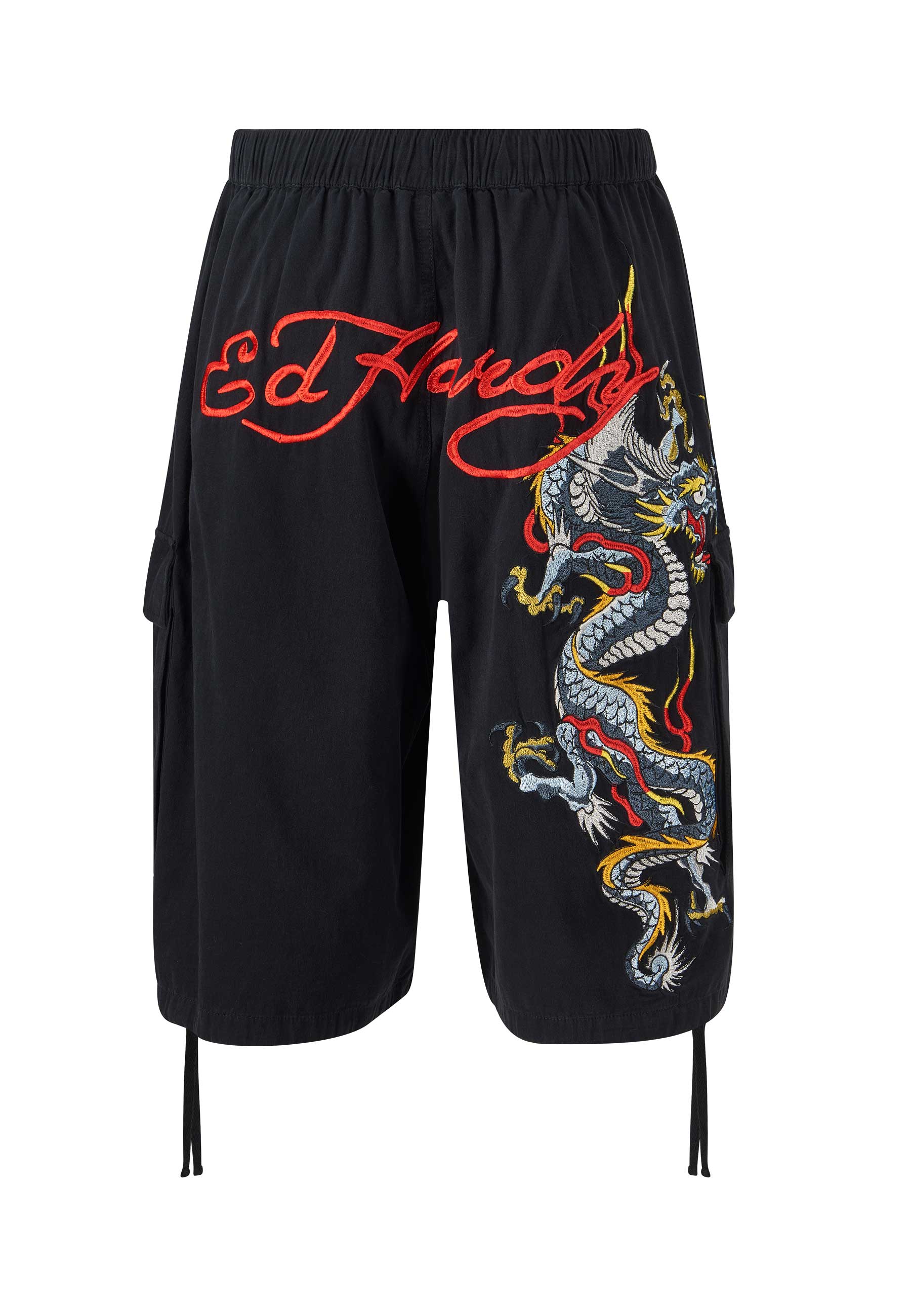 The lightweight shorts feature a huge full-colour embroidered graphic patch, Ed's tribute to the impactful art of patches, going beyond conventional style.