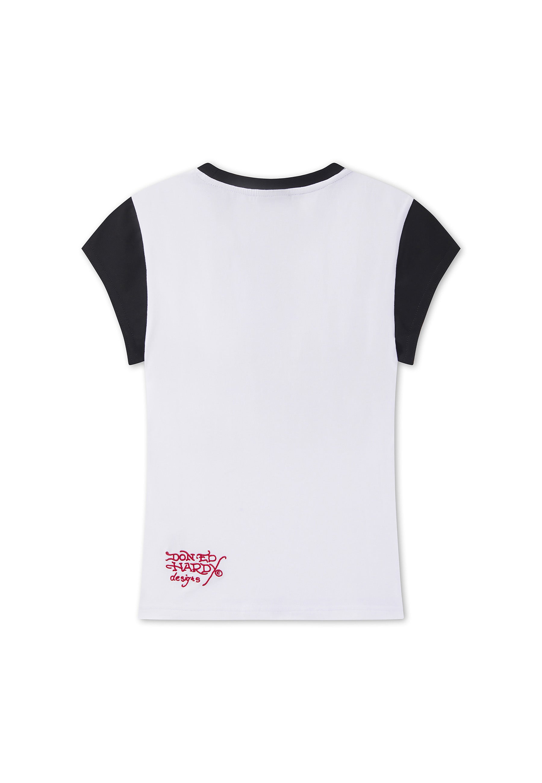 CONTRAST CAP SLEEVE WITH CONTRAST NECK PRINTED GRAPHIC TO FRONT EMBROIDERED DON ED HARDY TO BACK HEM COTTON ELASTANE MIX