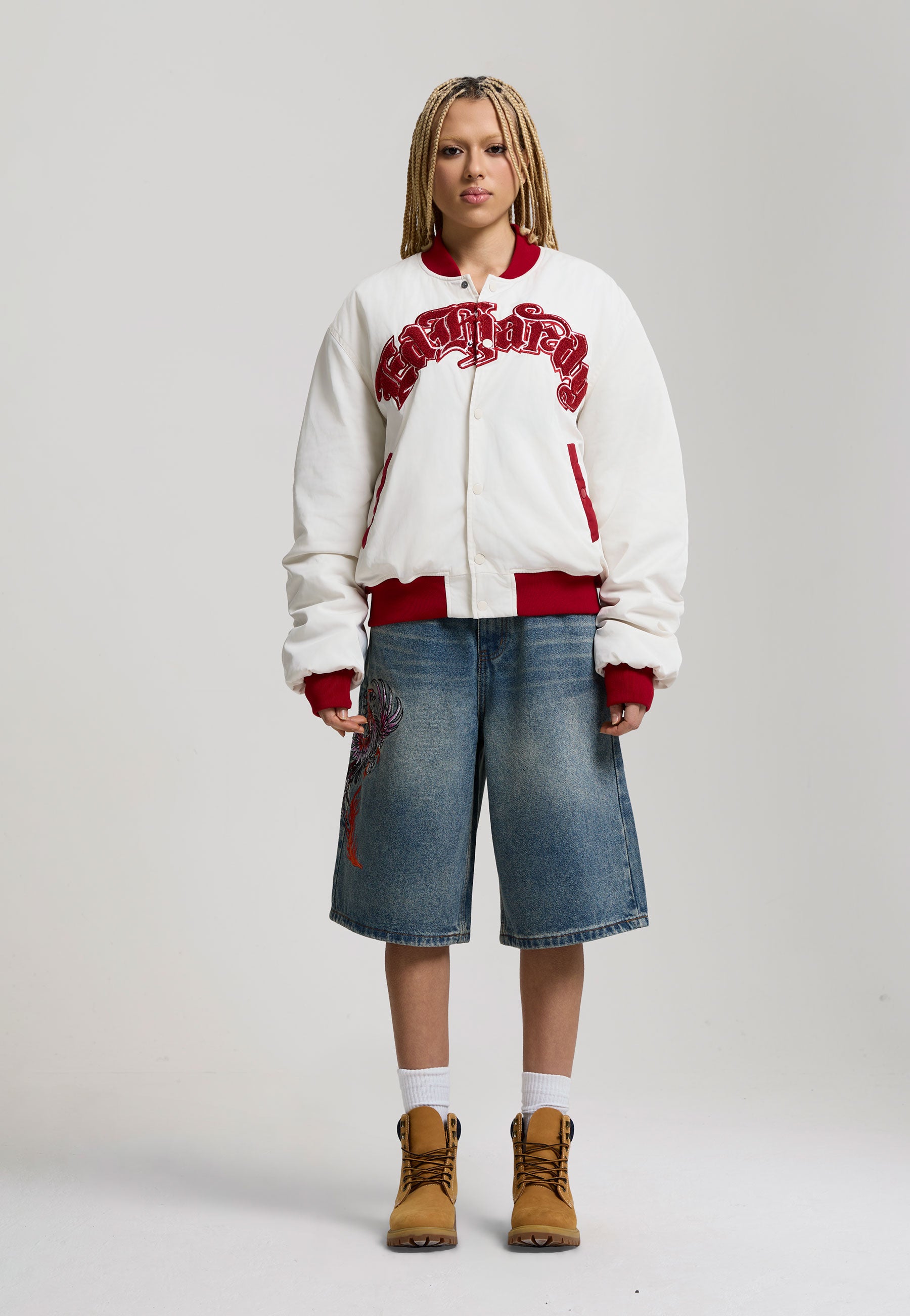 Womens Gothic Flaming Eagle Relaxed Bomber Jacket - Ecru