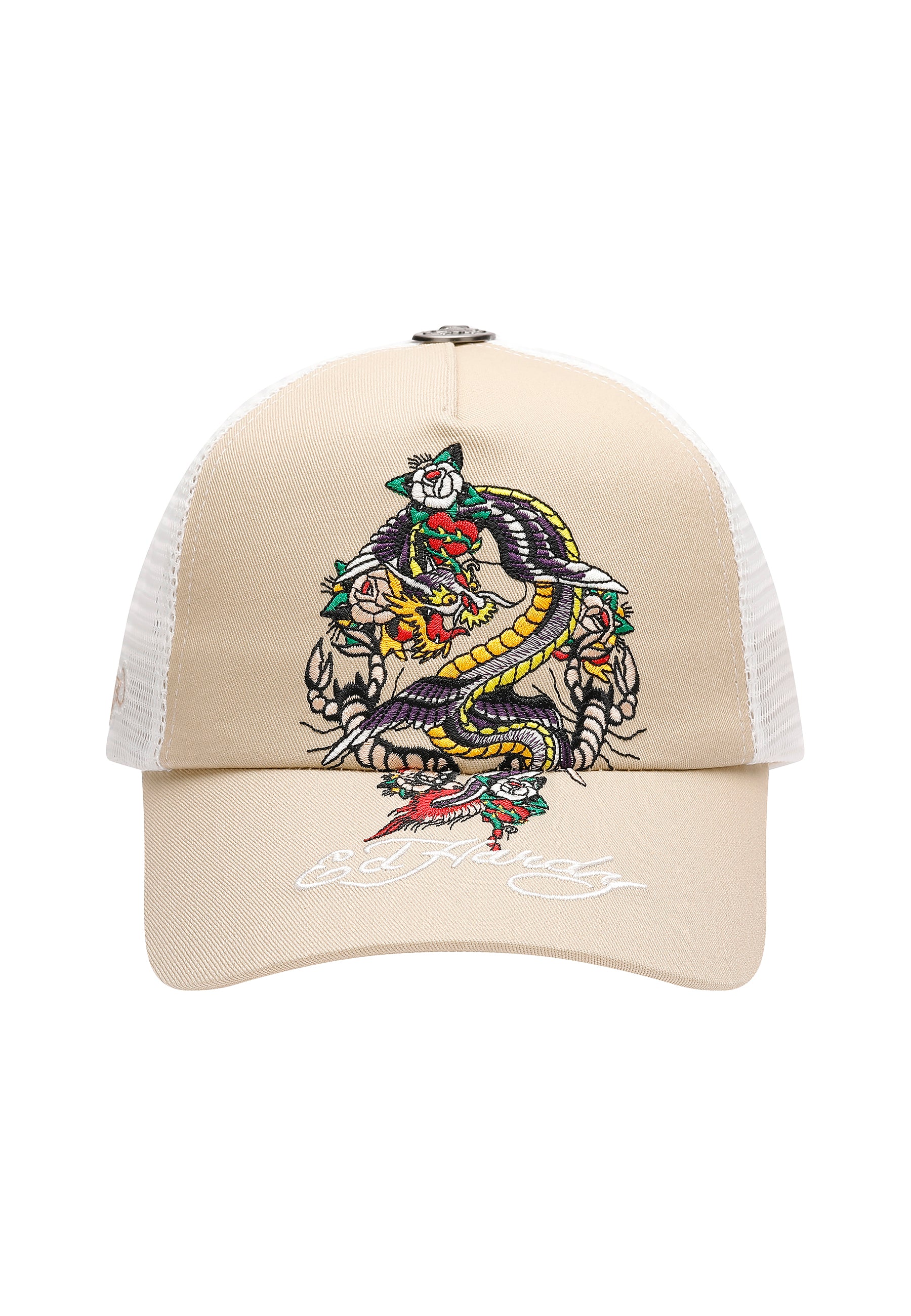 Unisex Swooping Dragon 5 Panel Trucker Cap - Beige