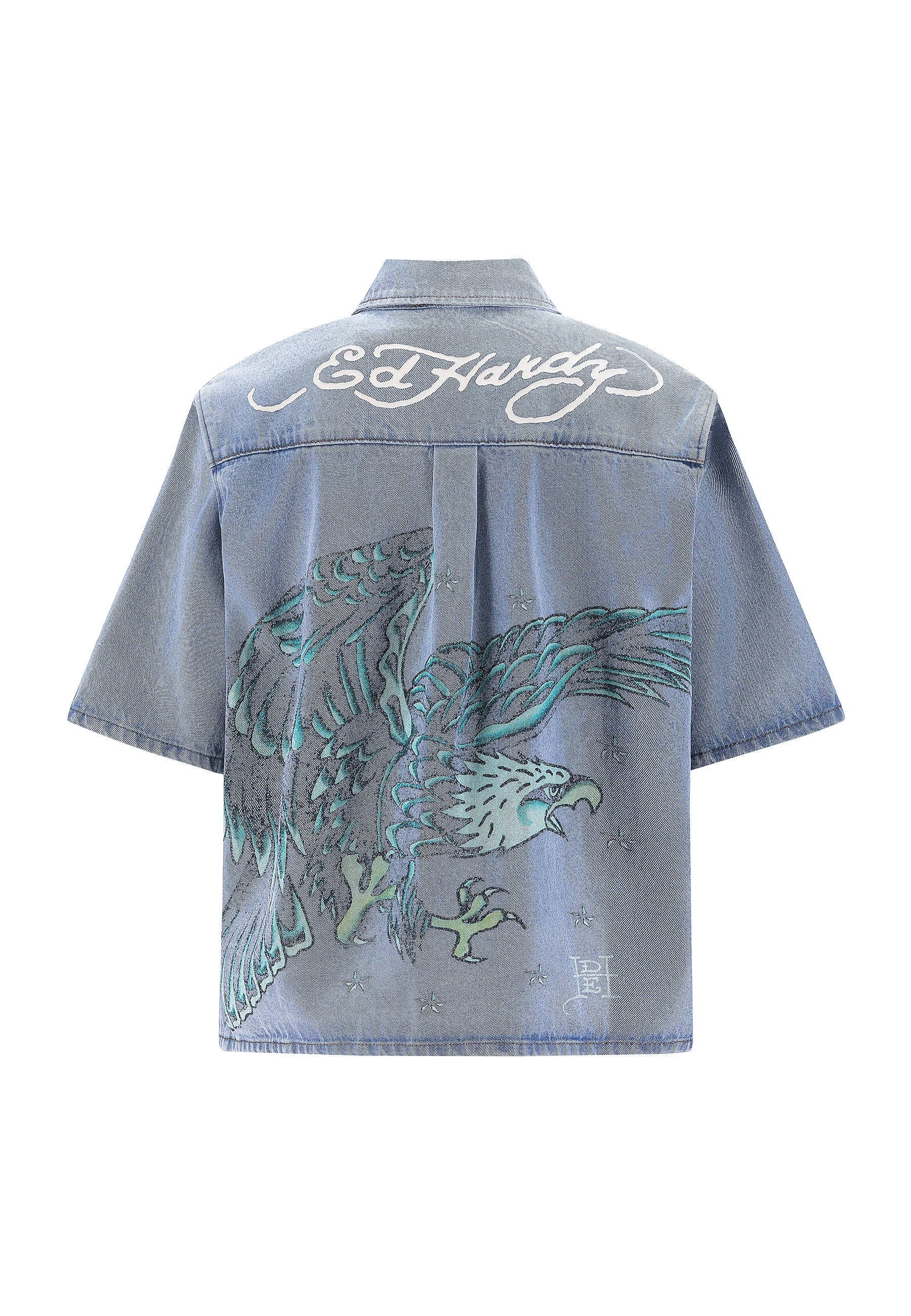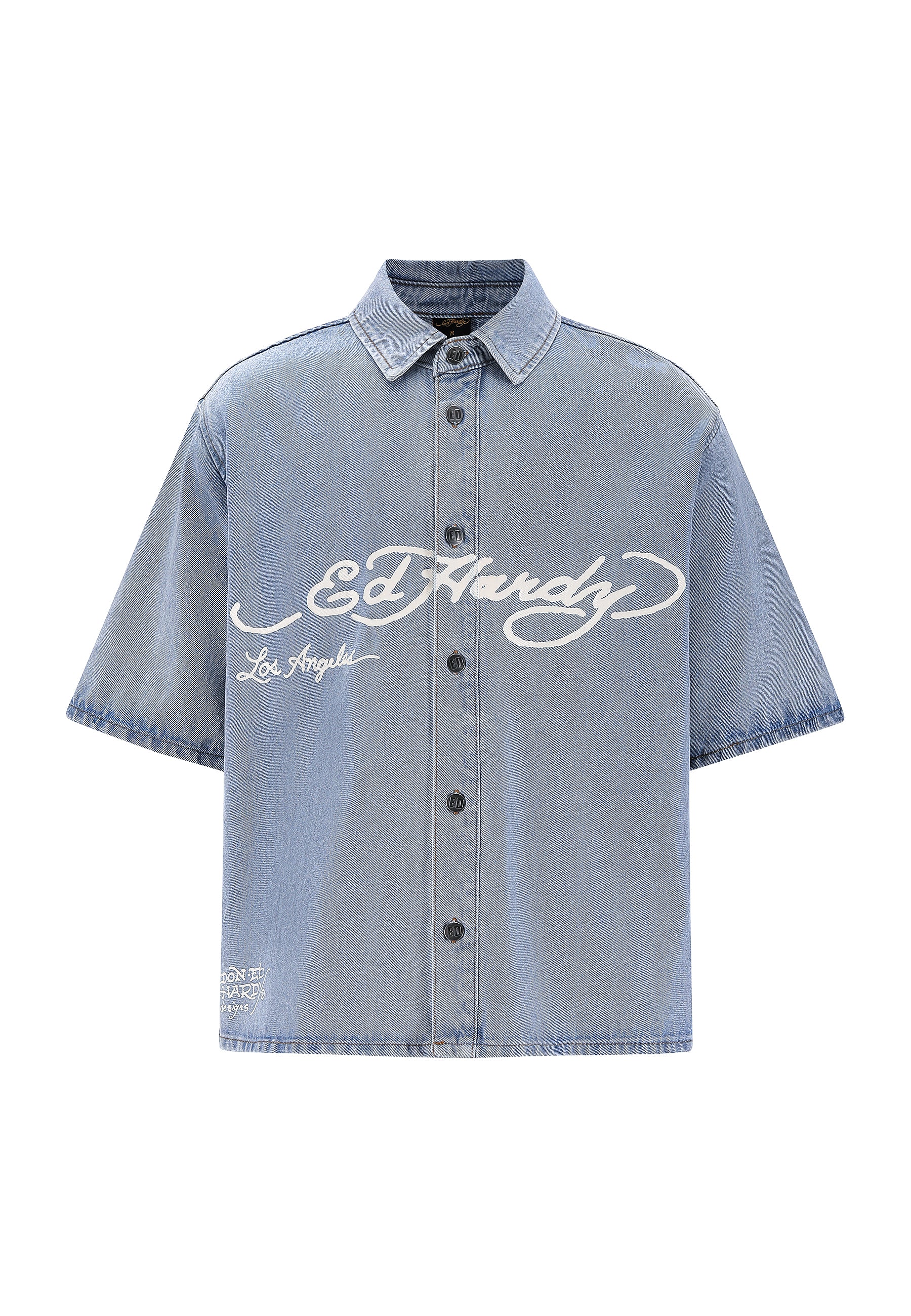 Relaxed fit with short sleeves Button-down closure Classic shirt collar Ed Hardy faded print across chest Faded graphic back print Vintage wash