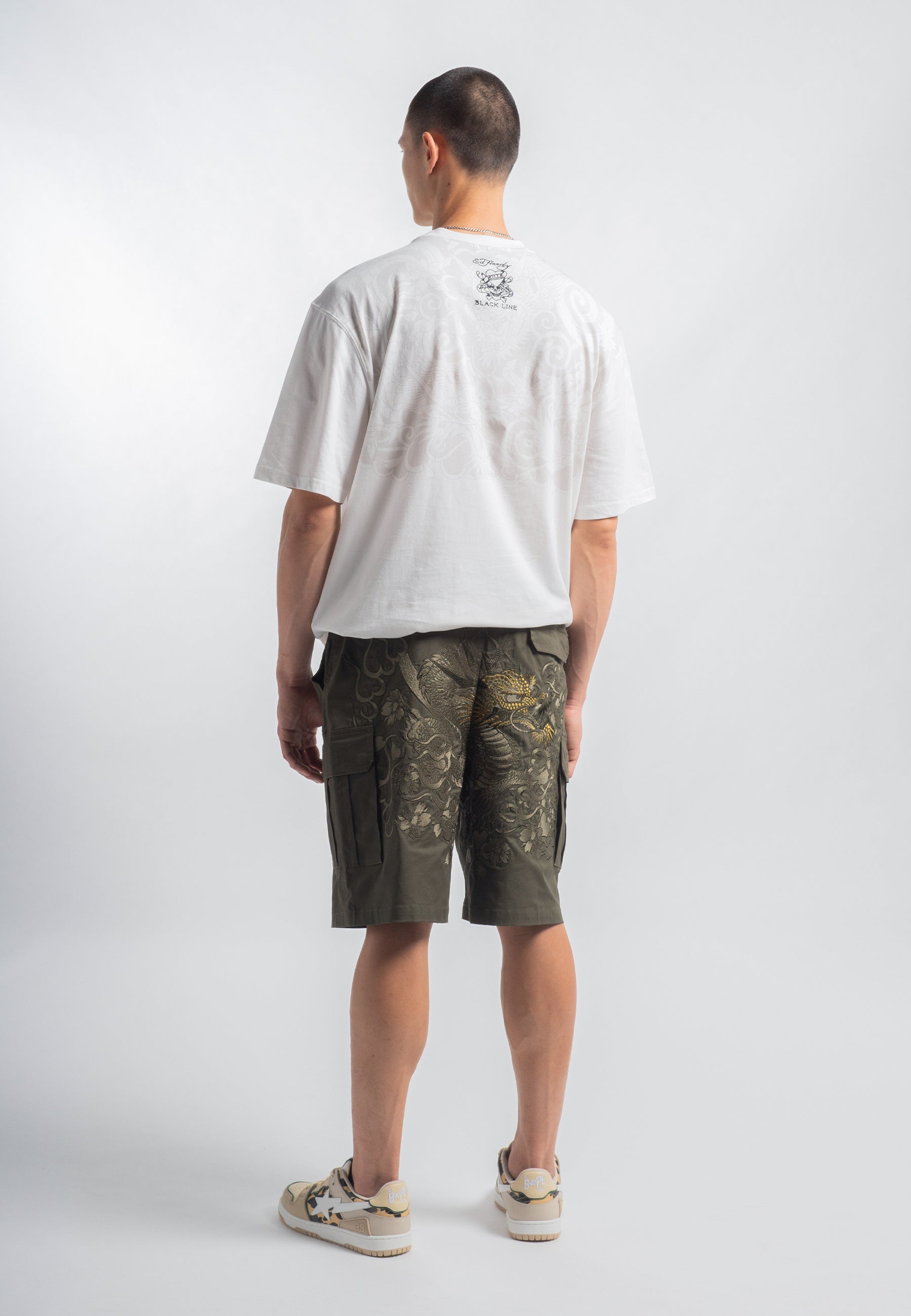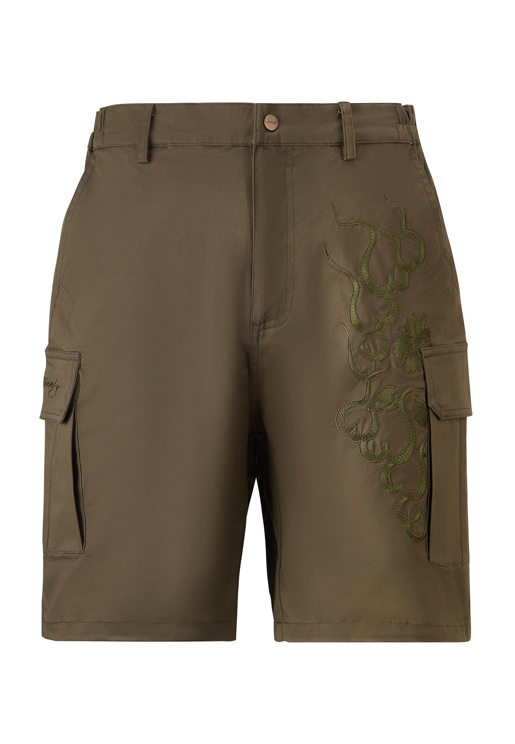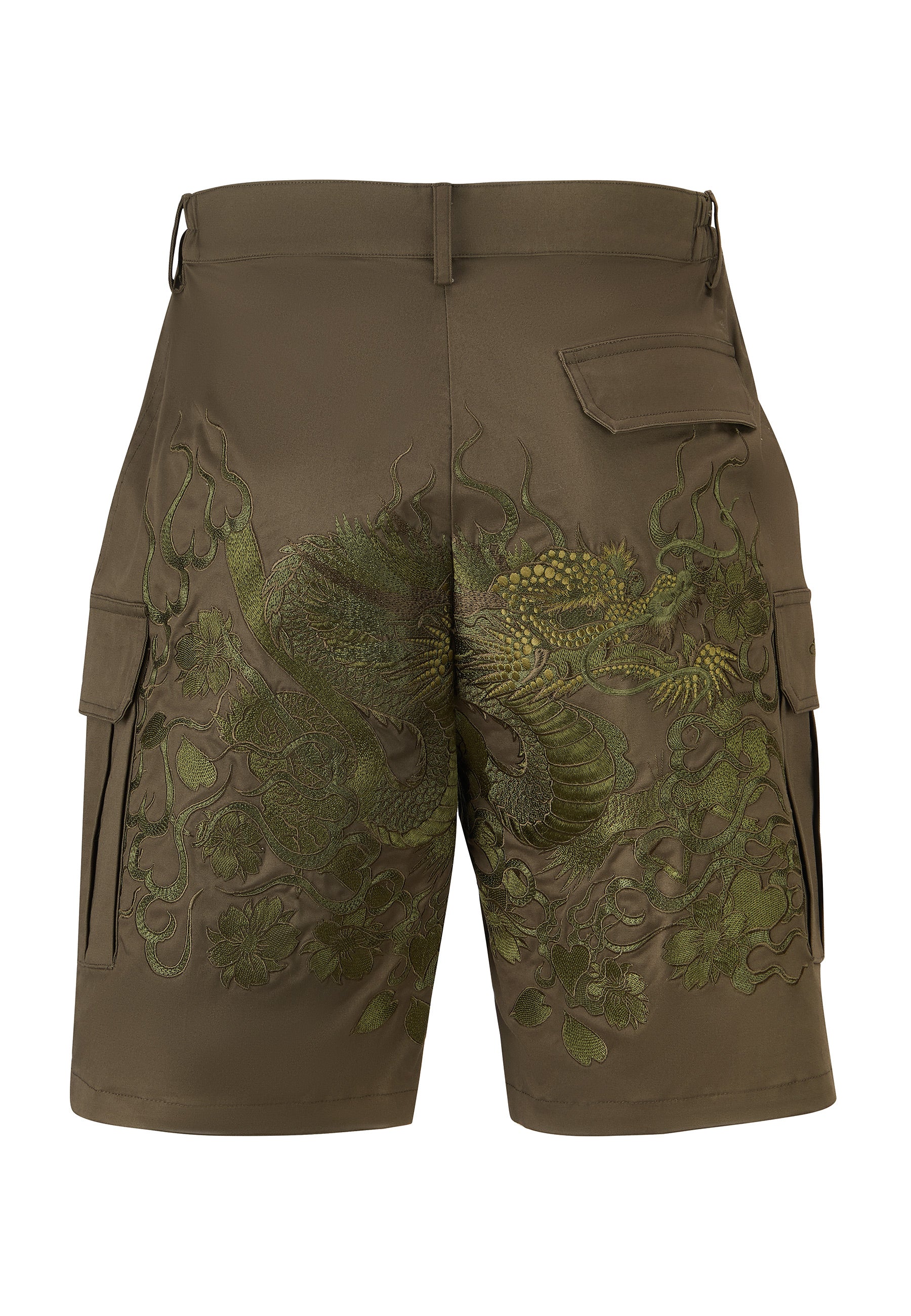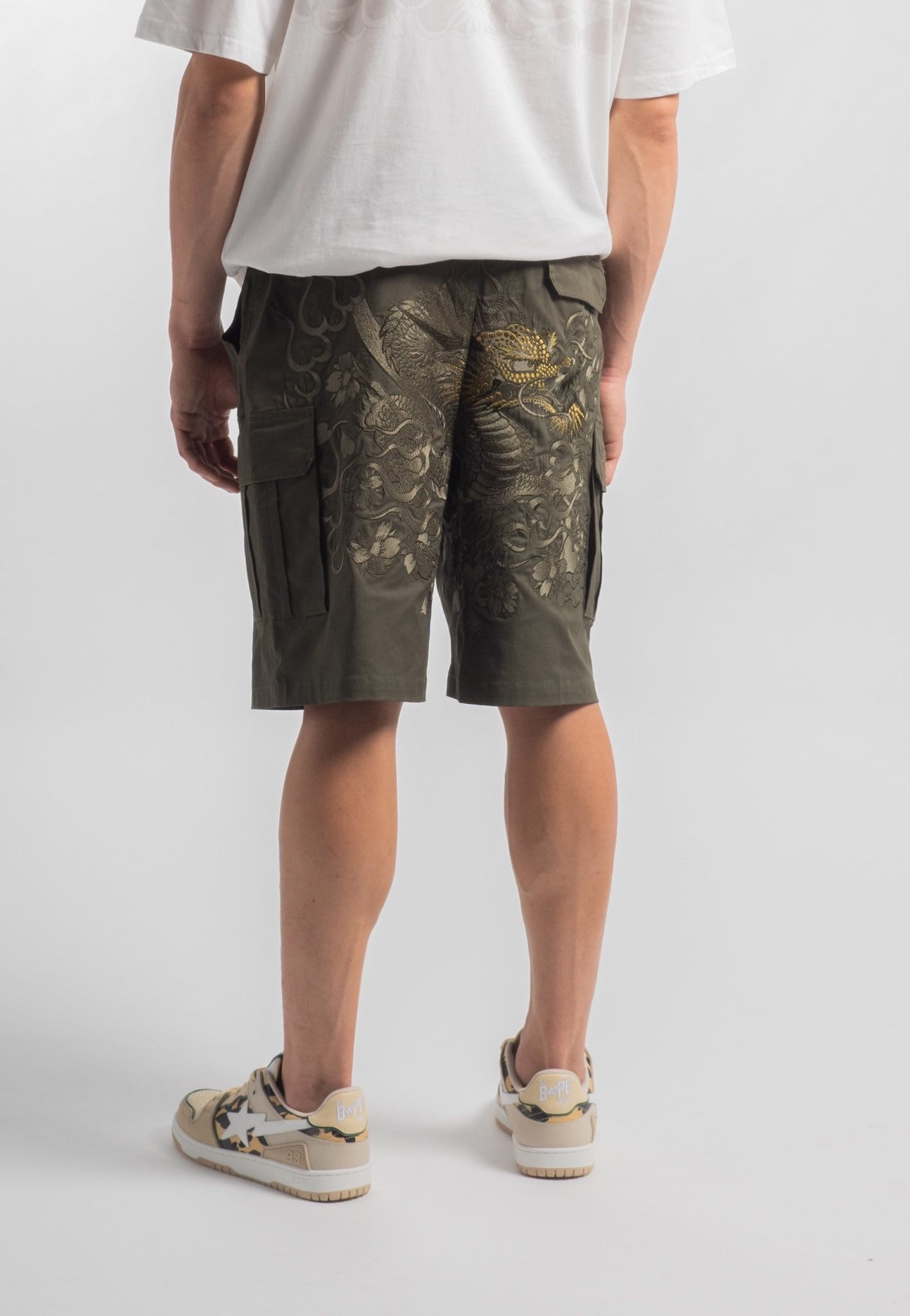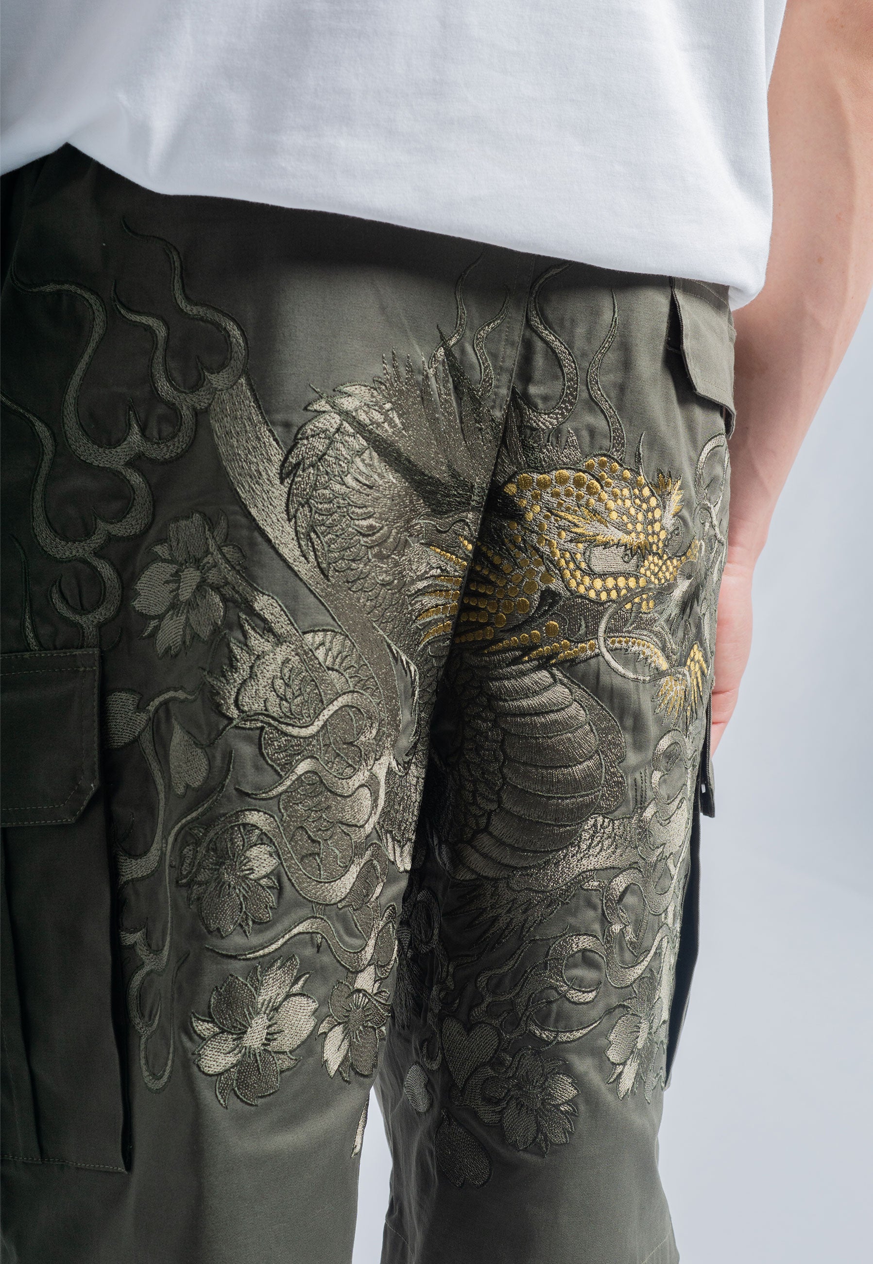 Mens Vintage-Dragon Embroidered Combat Trousers Shorts - Green